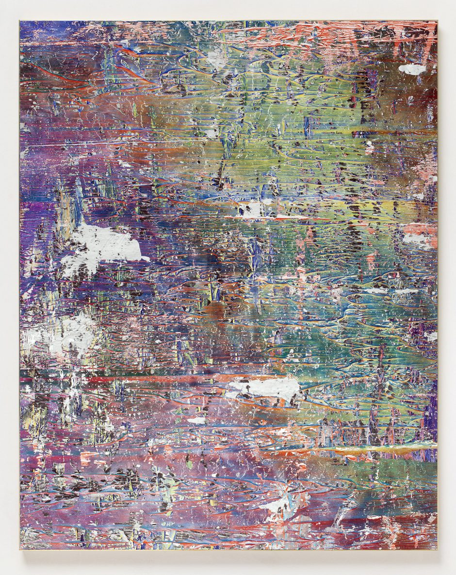 The surfaces look scraped and gritty, torn or squeegeed, scribbled or sanded. Some of the transfers seem torn or wrinkled, some are slopped and gooed, or snowed-in with white. All these diversely evocative surfaces come across on a completely smooth acrylic painting. Taking it a step further, acrylic paint is just a fancy type of liquid plastic, so the plastic sheets of transfer are just another layer in the plastic Olympics here. Just as Judd celebrated plastics and industrial materials as the perfect media to tackle modern alienation, Reihsen uses it in the digital era to create a non-space where layers of plastic give the illusion of life or connection.