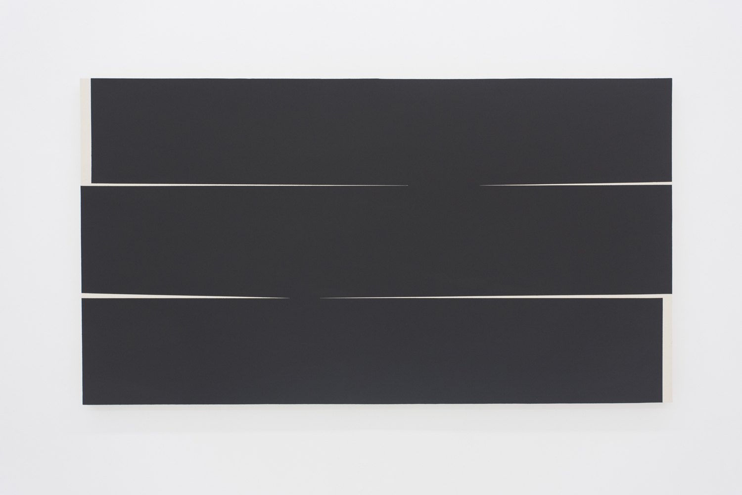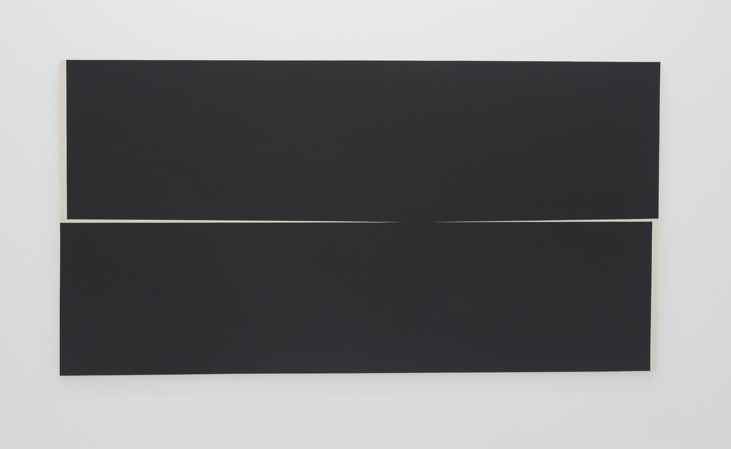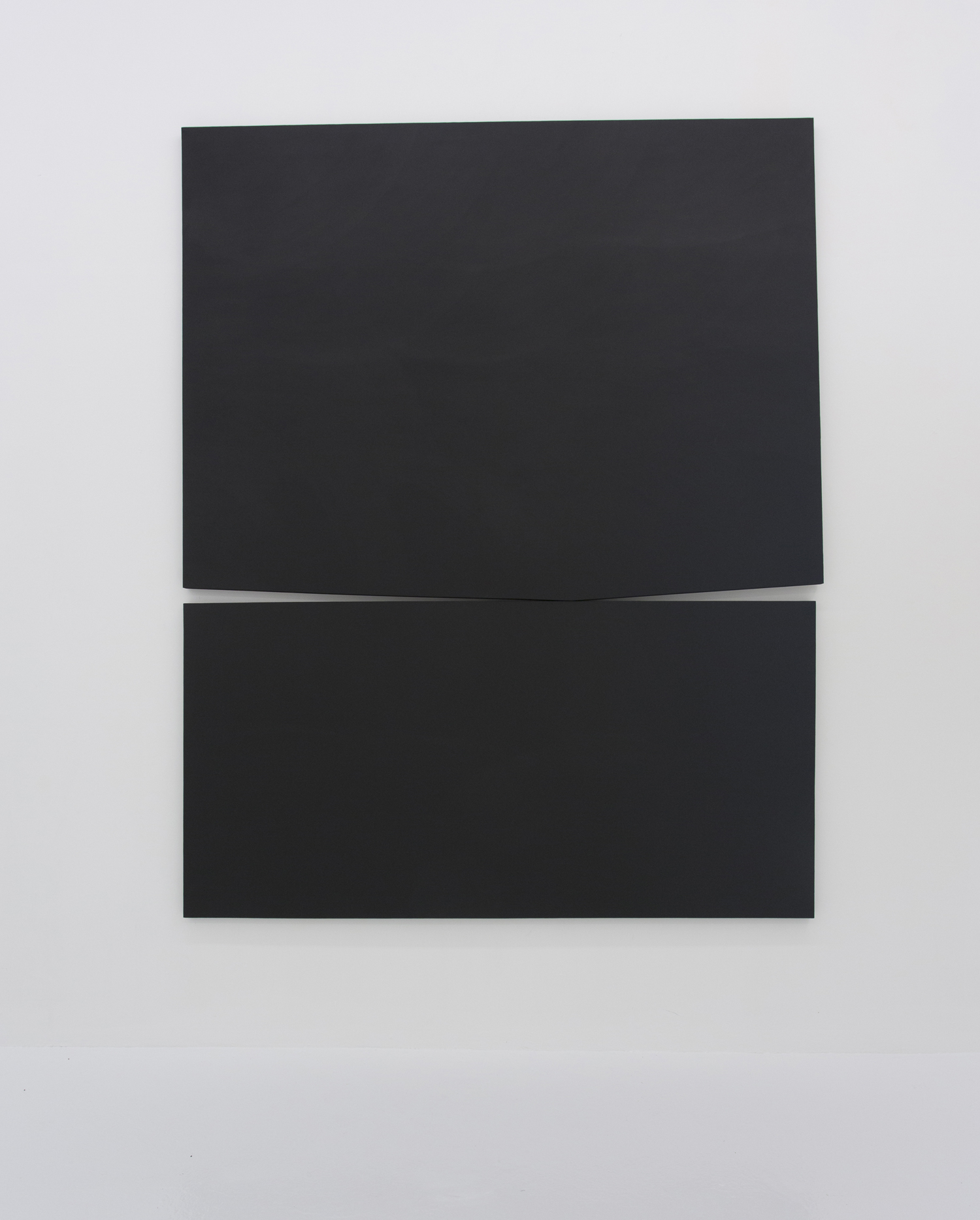 The black is so deep and low-albedo as to form a confusing visual “object.” Is it positive or negative space, you might wonder, as it recedes infinitely and yet can be as flat and frontal looking as a cutout. A massive work made of abutting shaped canvasses pulls the objects out on their own from the rectangular canvas background, and take one step further into object-hood. Heavy looking objects touching each other lightly; balance and elegance have always been a part of Abrahams’ work and here in these giant works we look again at his fine distinctions.