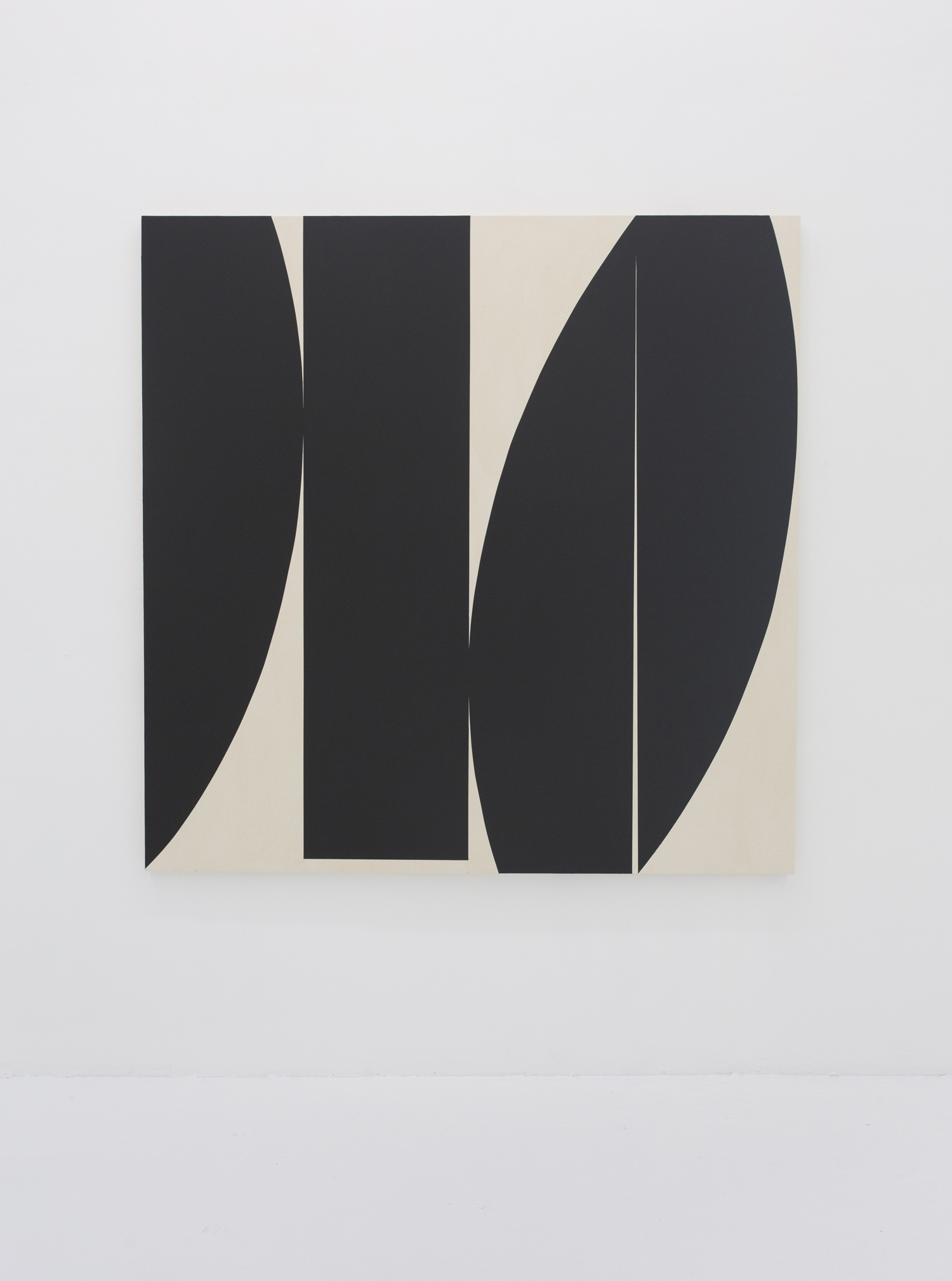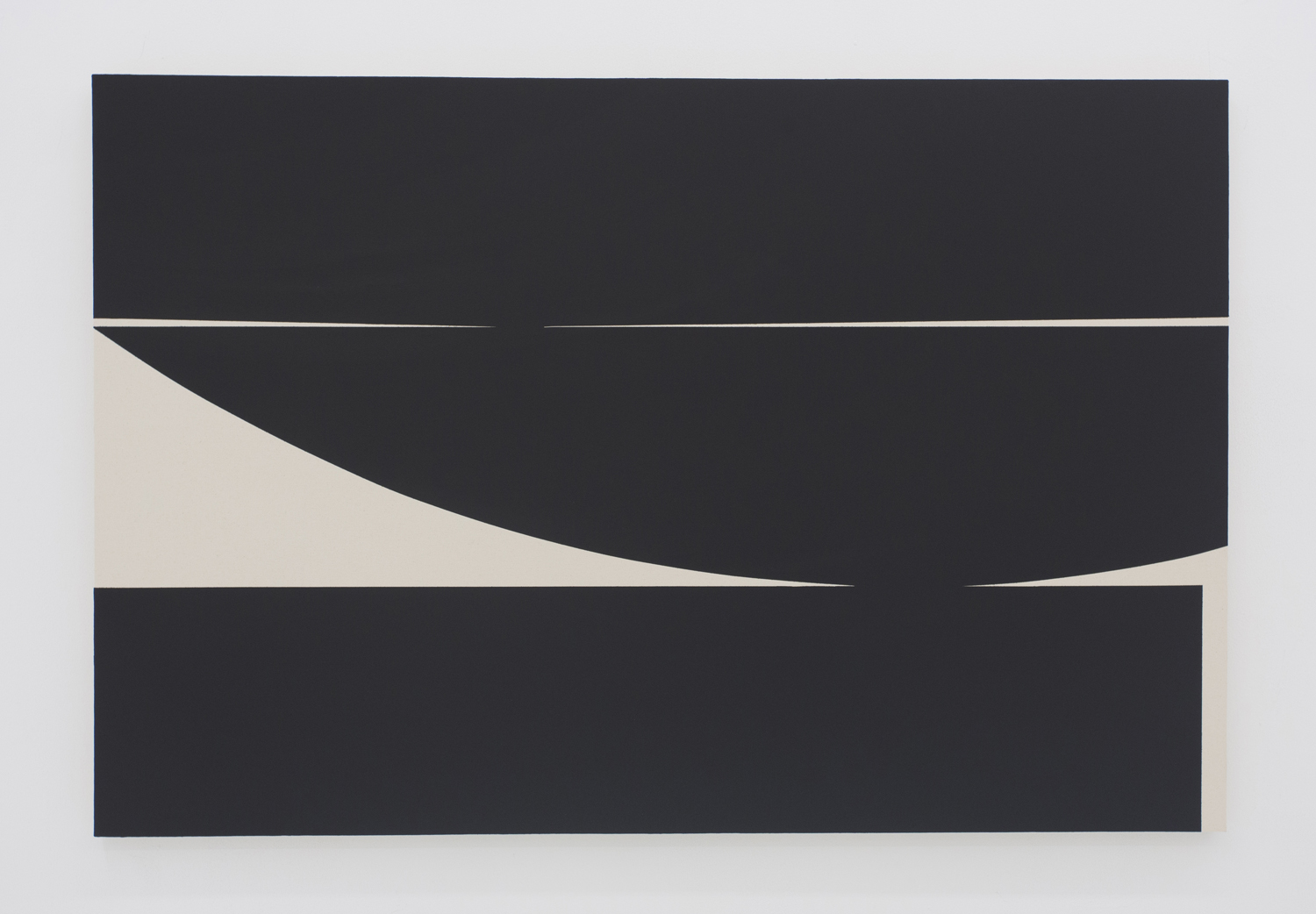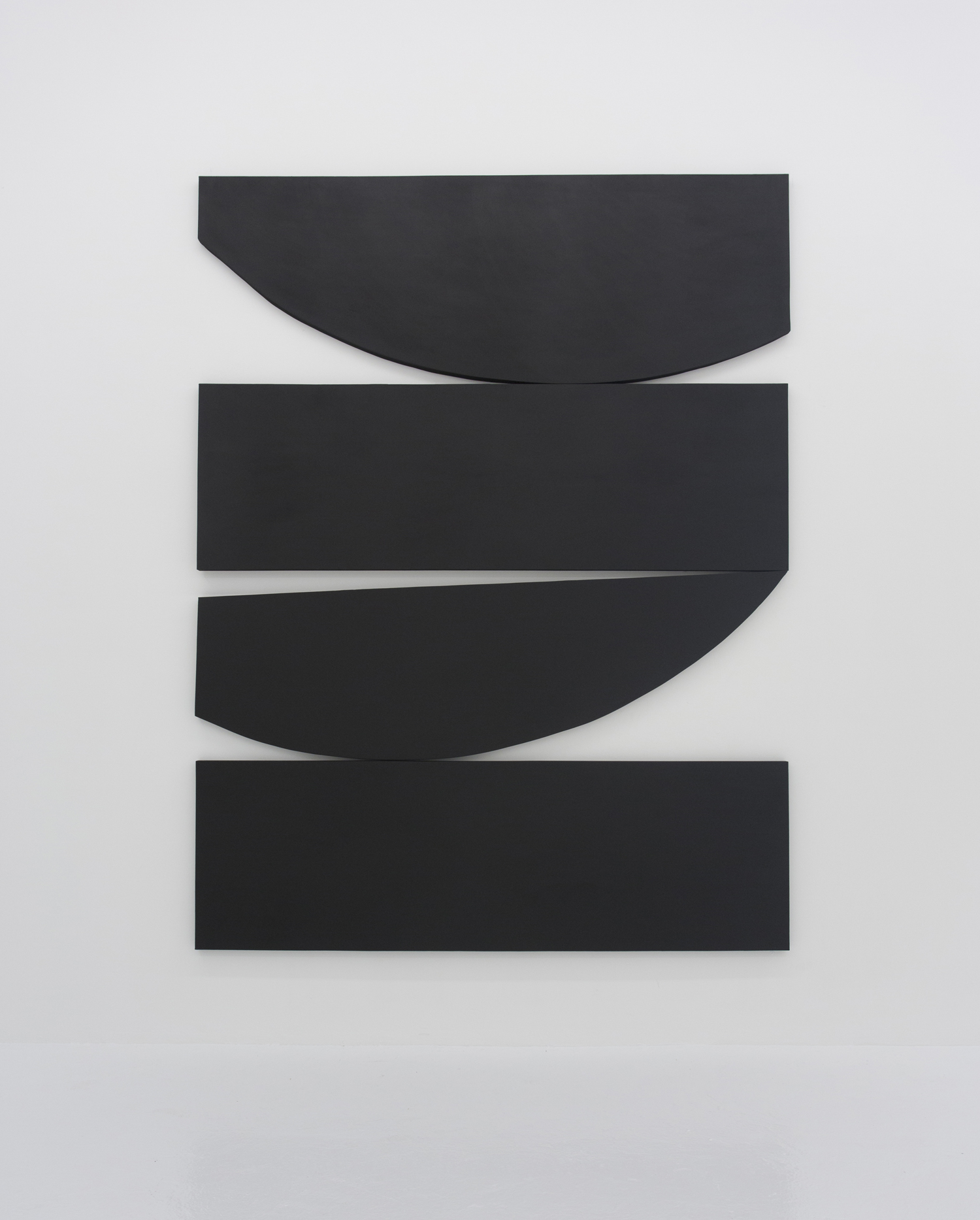 With deep black shapes filling, taking over the canvasses, these works contain their drama in the subtle variation of angles and curves. Like smooth-edged Motherwell paintings, these giant black shapes rub up and jostle for position. They are stacked in a way that seems to obey gravity and limn silhouettes suggestive of industrial design or even household products.