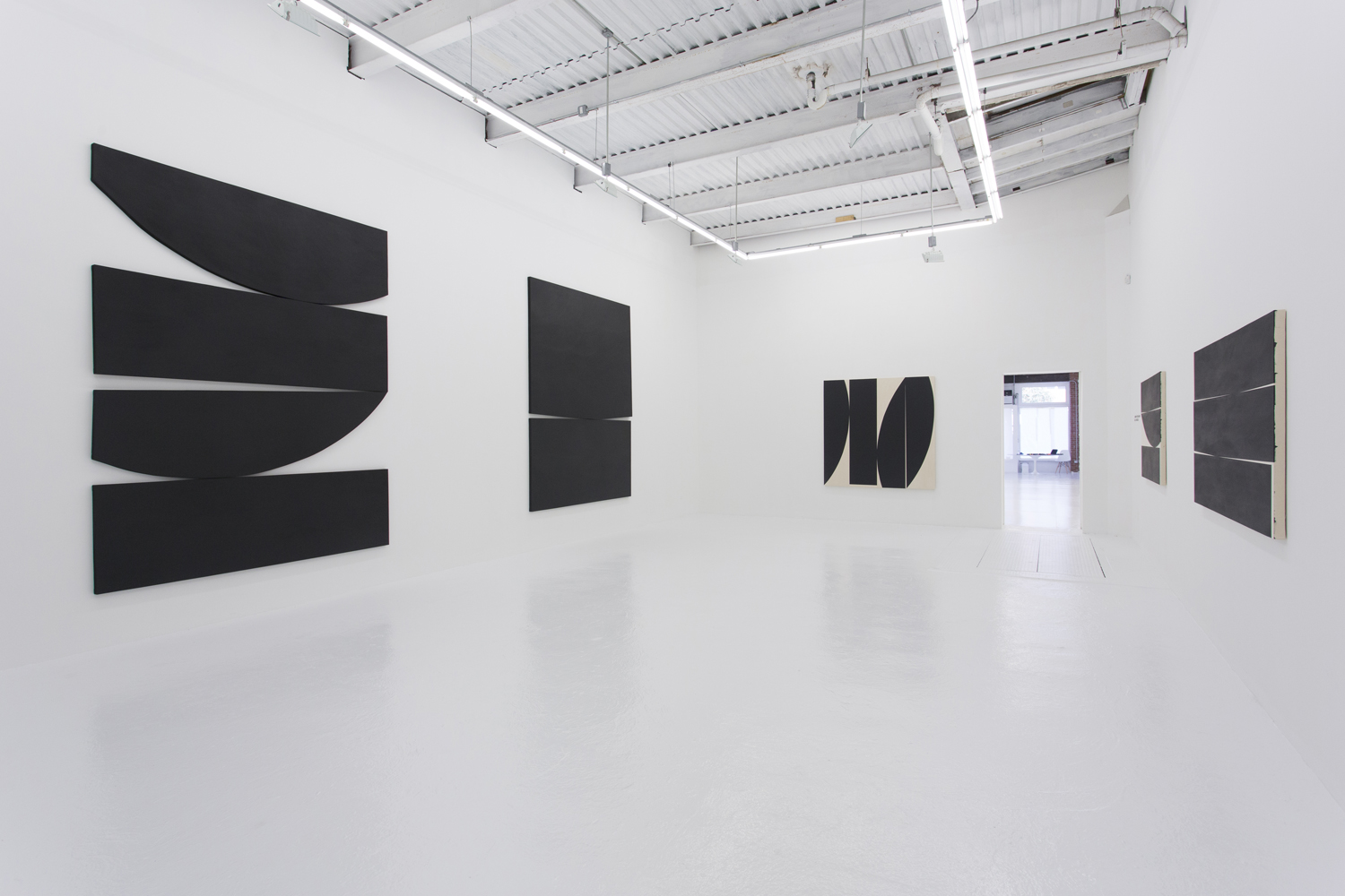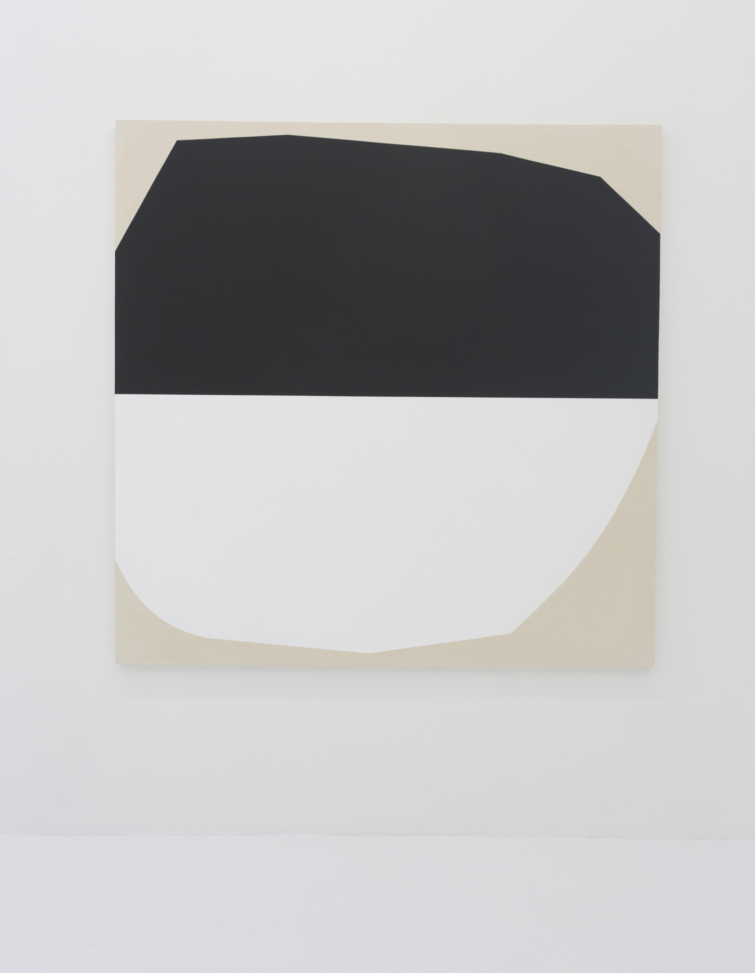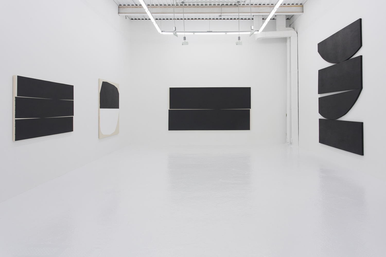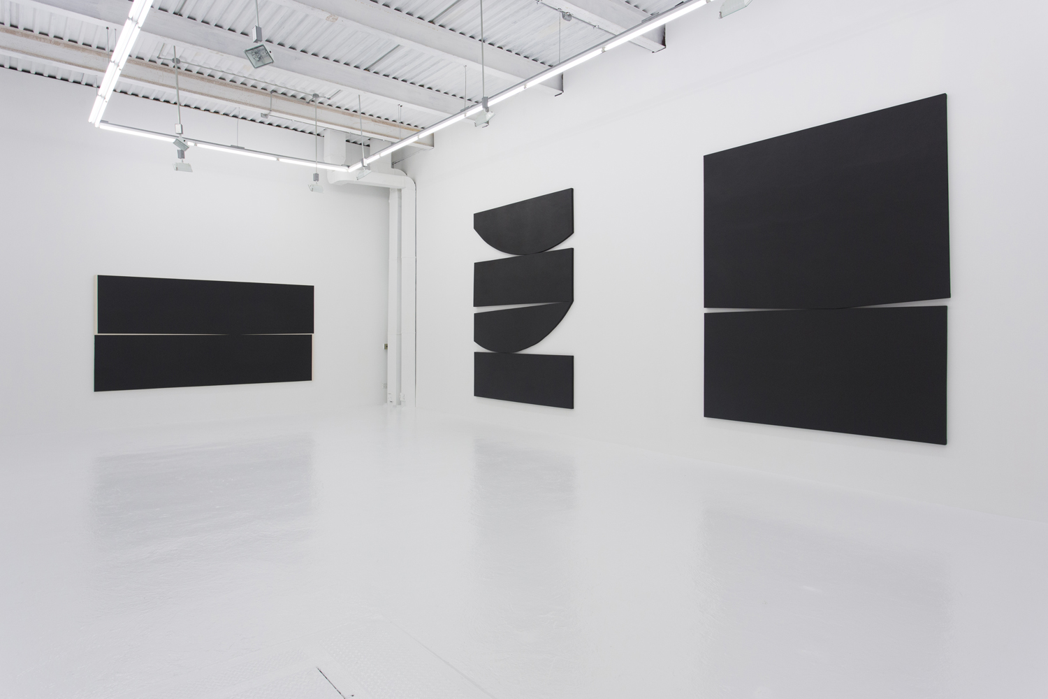 With deep black shapes filling, taking over the canvasses, these works contain their drama in the subtle variation of angles and curves. Like smooth-edged Motherwell paintings, these giant black shapes rub up and jostle for position. They are stacked in a way that seems to obey gravity and limn silhouettes suggestive of industrial design or even household products.