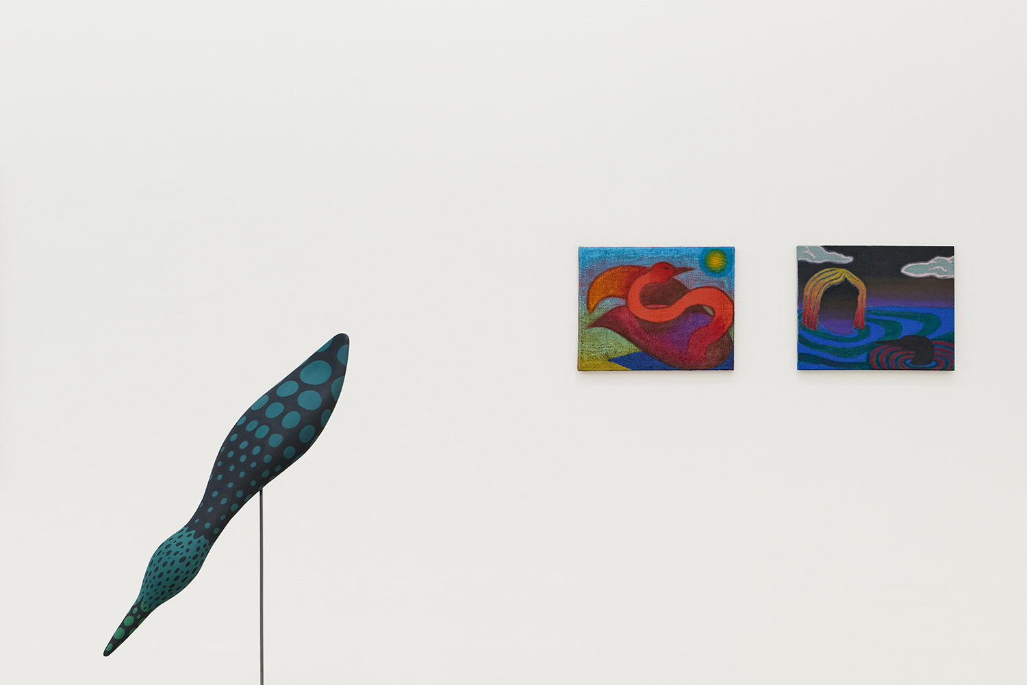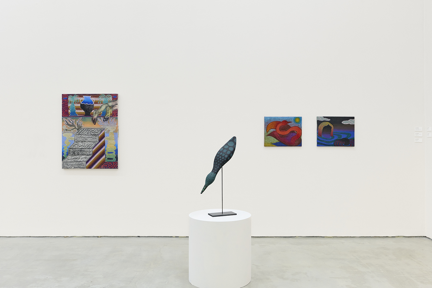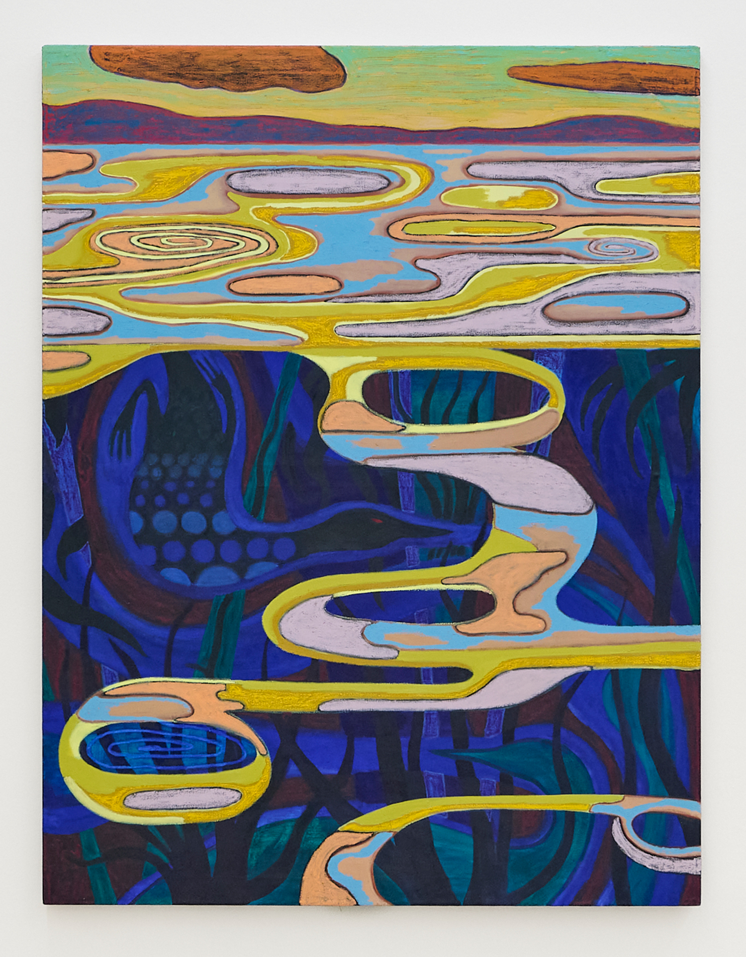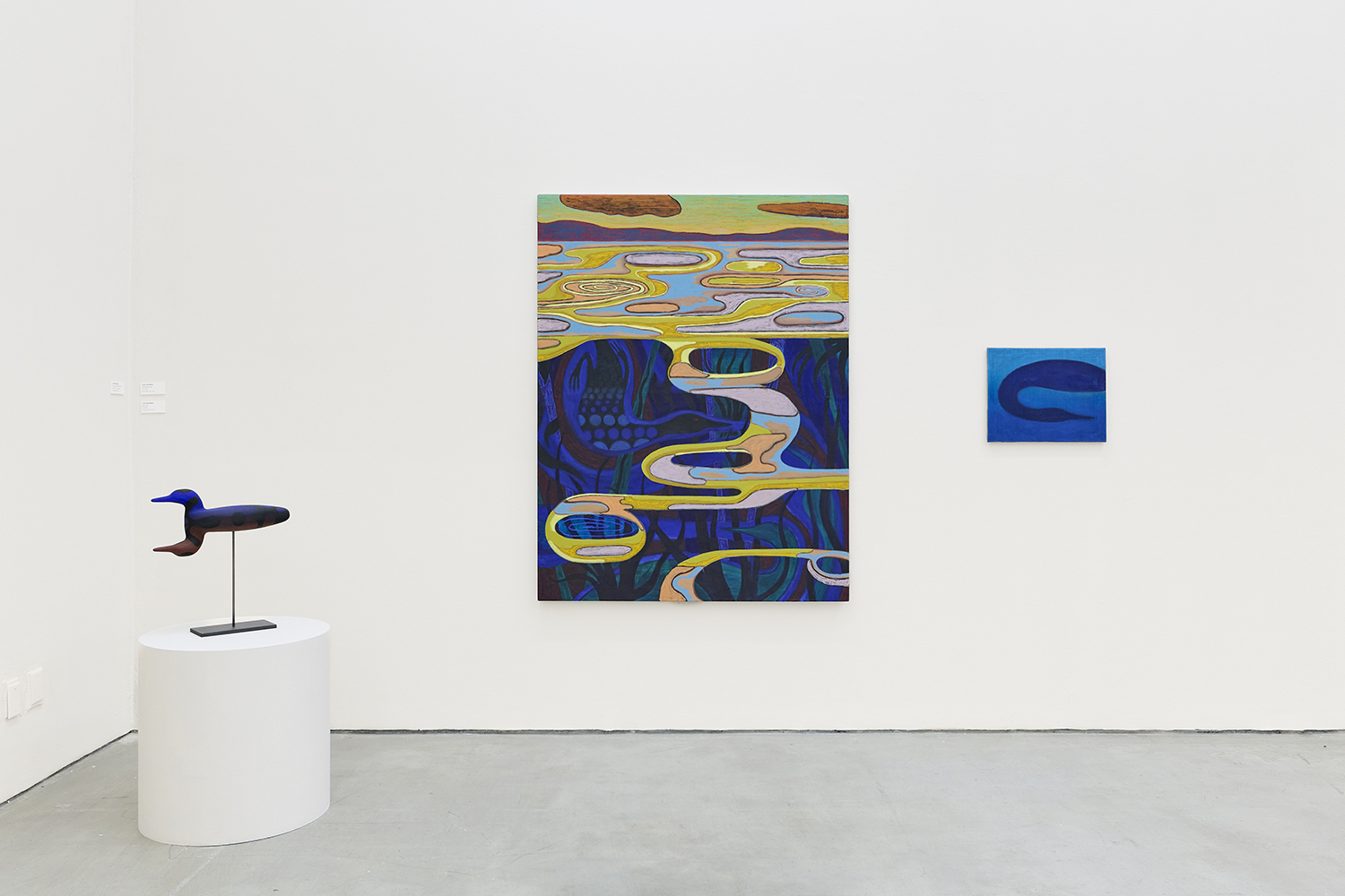The Hole and Tombolo are pleased to present Birdbath, a solo exhibition by Julian MacMillan, the 2025-2026 Tombolo artist in residence. Across sixteen new paintings and sculptures, we see loons, swans, swirling eddies and dangling feet, rendered in the artist's signature graphic language. Above and below the water line, the works draw on the tradition of the landscape as idyll, played against a darker vision of the water’s surface as a boundary with the afterlife.