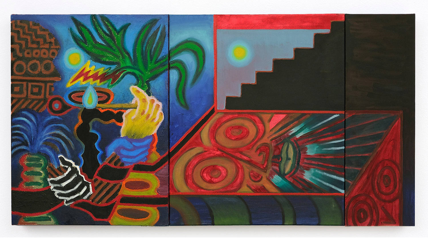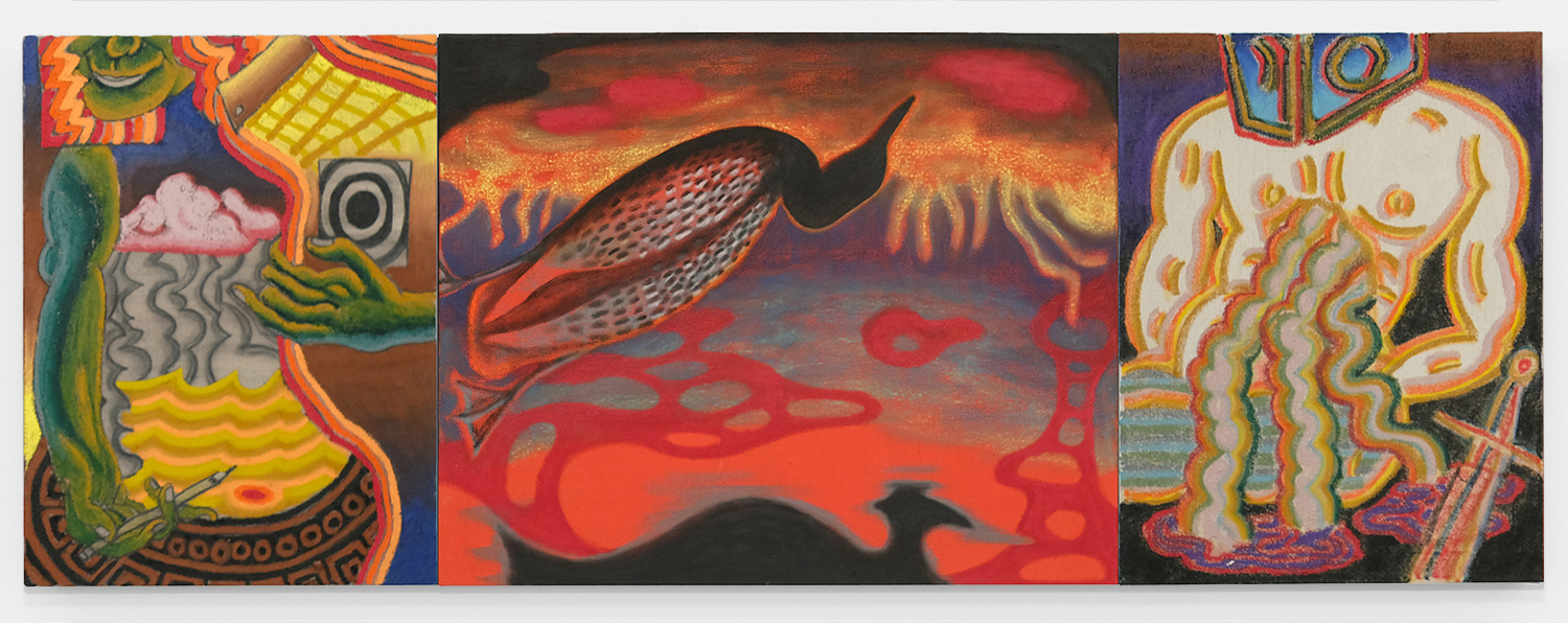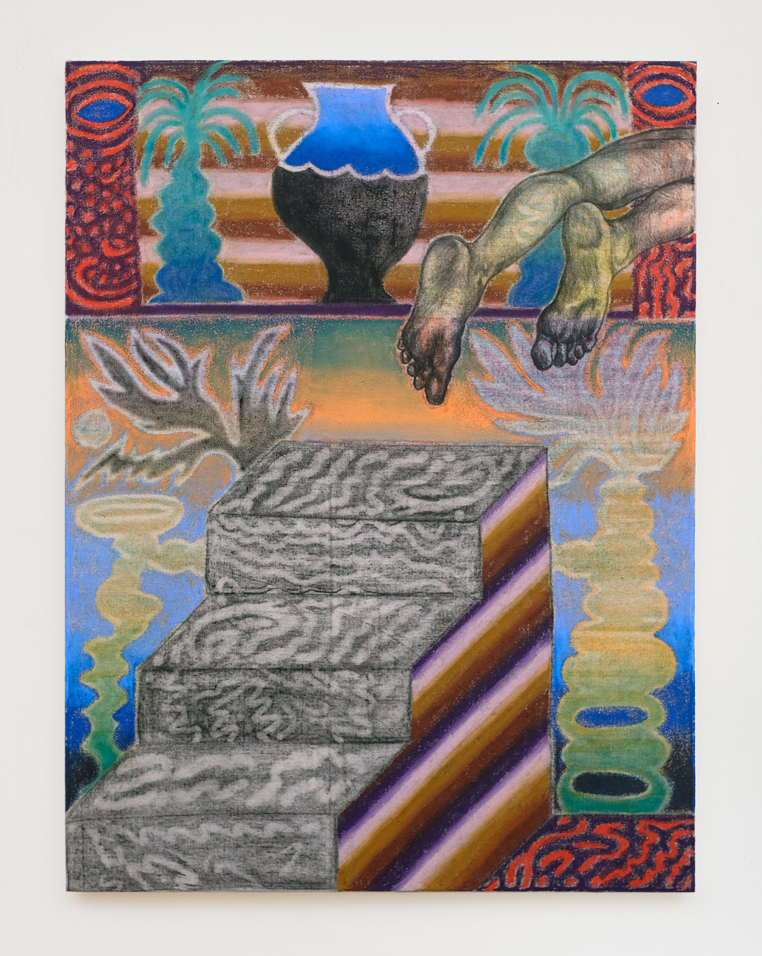 While the artist has always held art-making to be fundamentally funerary, this body of work in particular looks to a tomb painting from antiquity, “The Tomb of The Diver” (circa 470 B.C.E.) a rare, intact example of Greek funerary fresco depicting a youth flinging himself off a rock into the water below. He is poised between two worlds; the earthly terrain of the above ground and the water rushing up to meet him, symbolizing the passage from life to death. Tomb Painting (Diver) depicts this reference most literally, with the diver's feet caught mid-air. Across all the paintings, we see this through-line expanded and remixed with striking narrative clarity—from steps in Supportive Smoker to a loon in a hellish-red underworld in Self-Discovery / Self-Improvement.