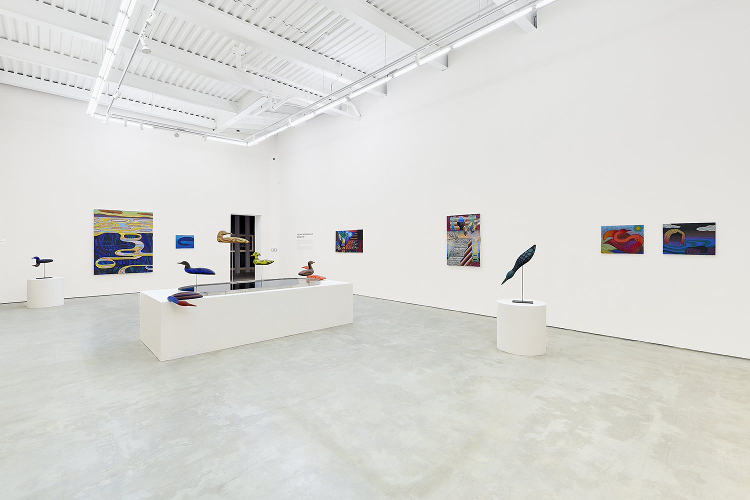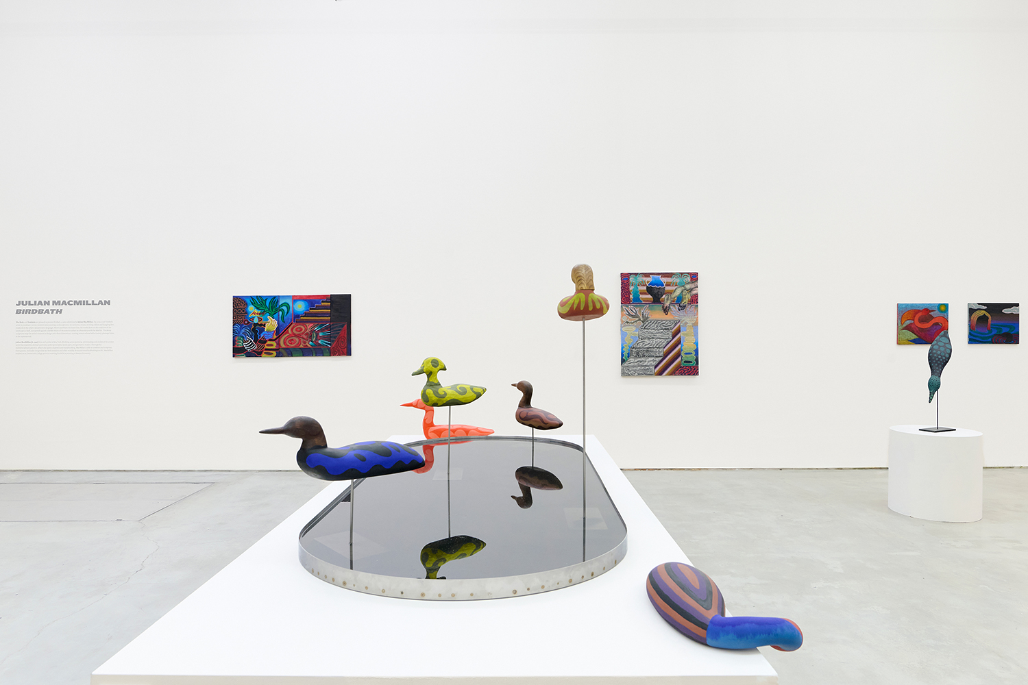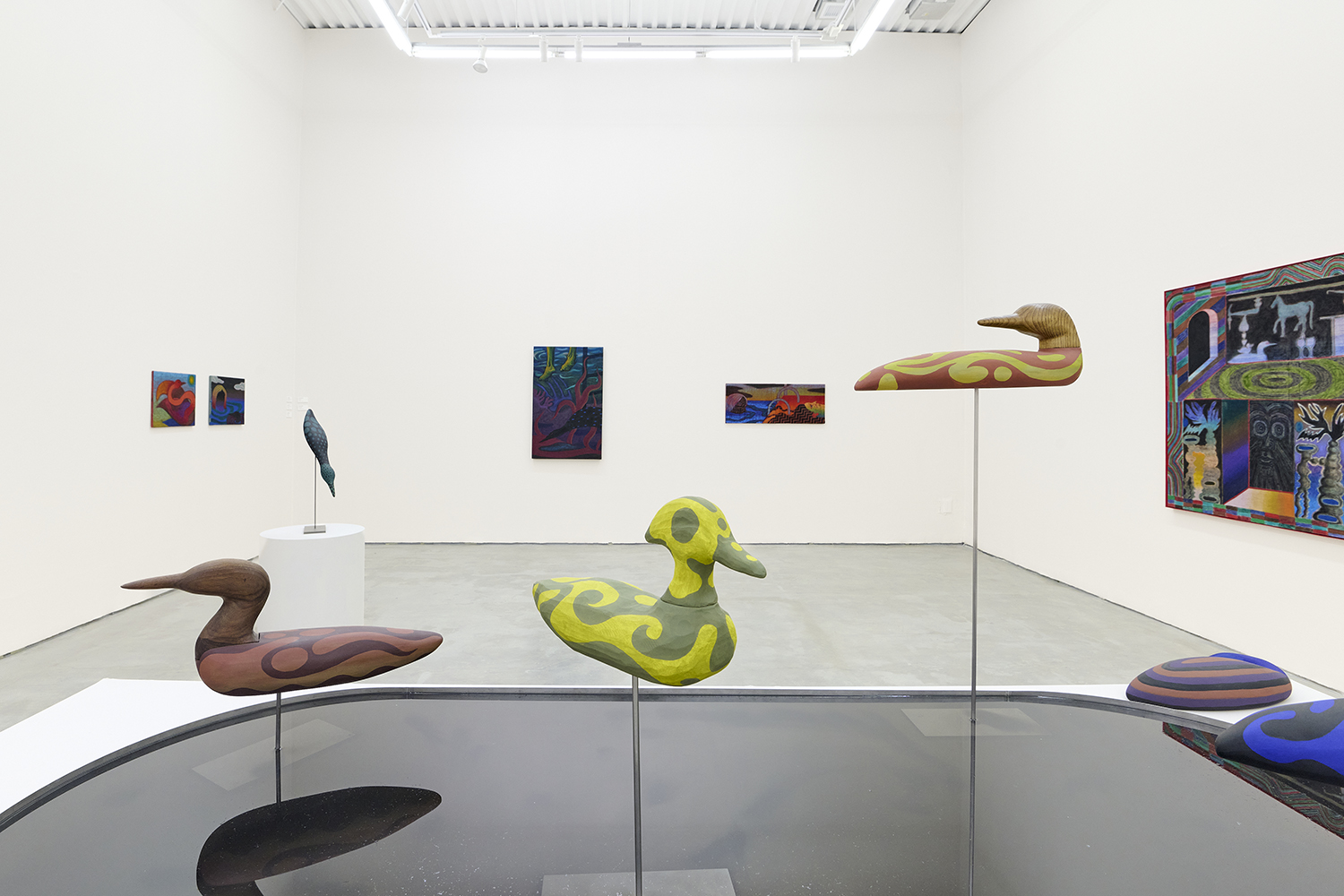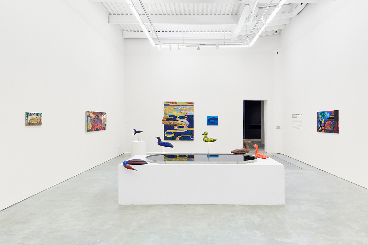 In the center of the gallery, decoys flock around an eight-foot stainless steel birdbath. The decoy sculptures map the artist’s interest in design onto three dimensions, creating avatars whose hallucinatory plumage hints at the supernatural. (The avatar, from the Sanskrit avatāra ‘descent’, is defined as “a manifestation of a deity or released soul in bodily form on earth; an incarnate divine teacher.”) The hand-carved sculptures and metalwork highlight MacMillan’s sculptural prowess in a predominantly painting show. The decoys, their bases and the larger-than-life birdbath are all fabricated in Red Hook, Brooklyn at the artist’s studio and at Friendly Metals, the artist-run metal studio where he works.