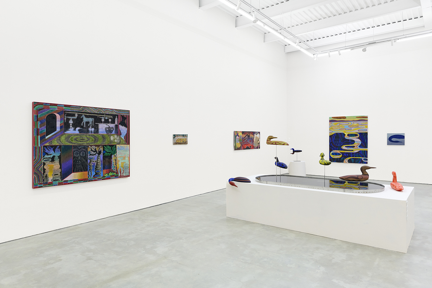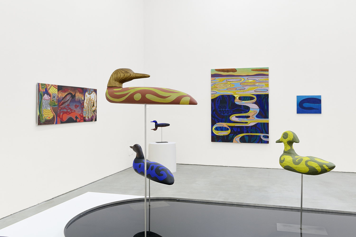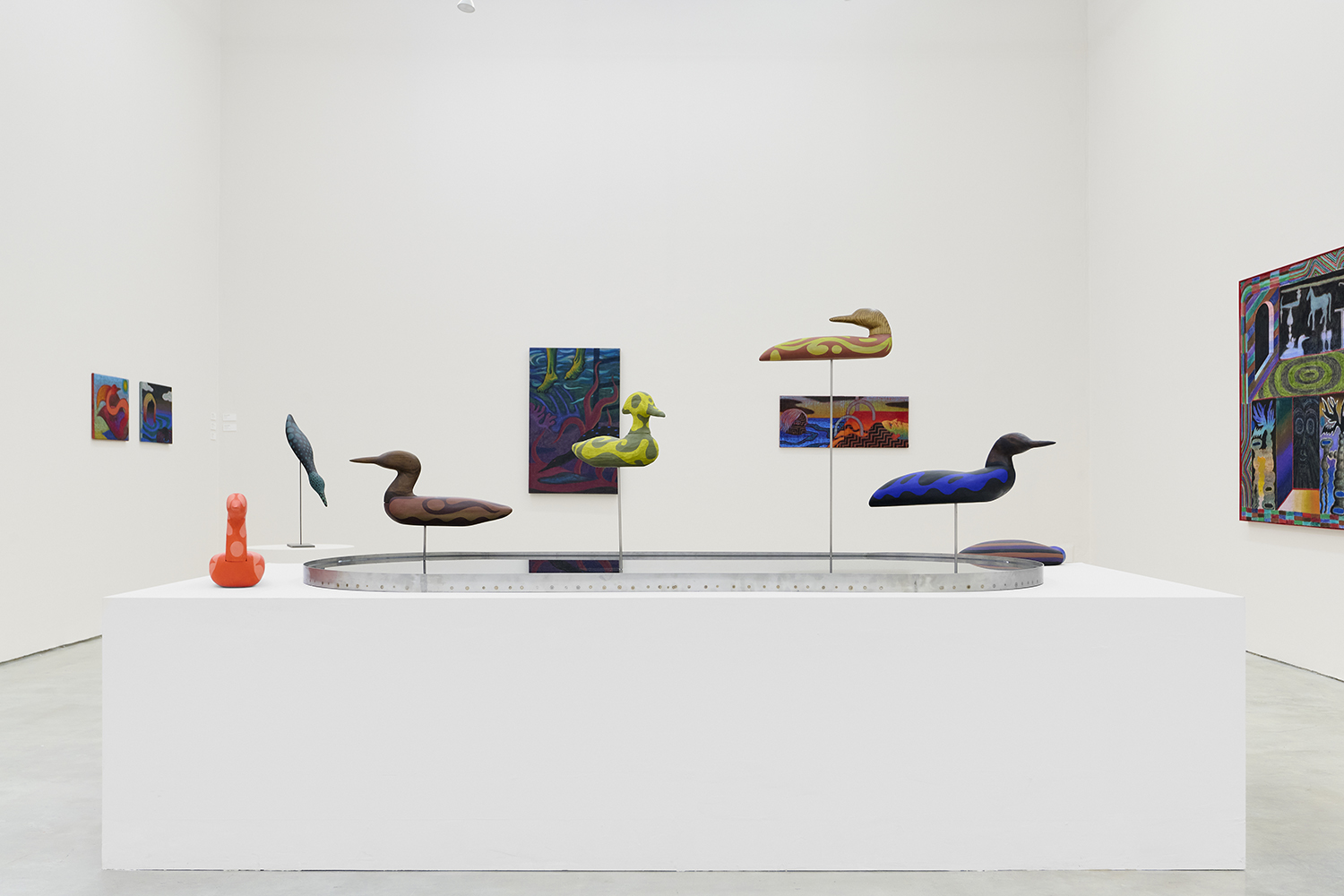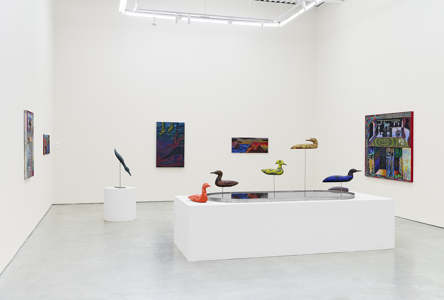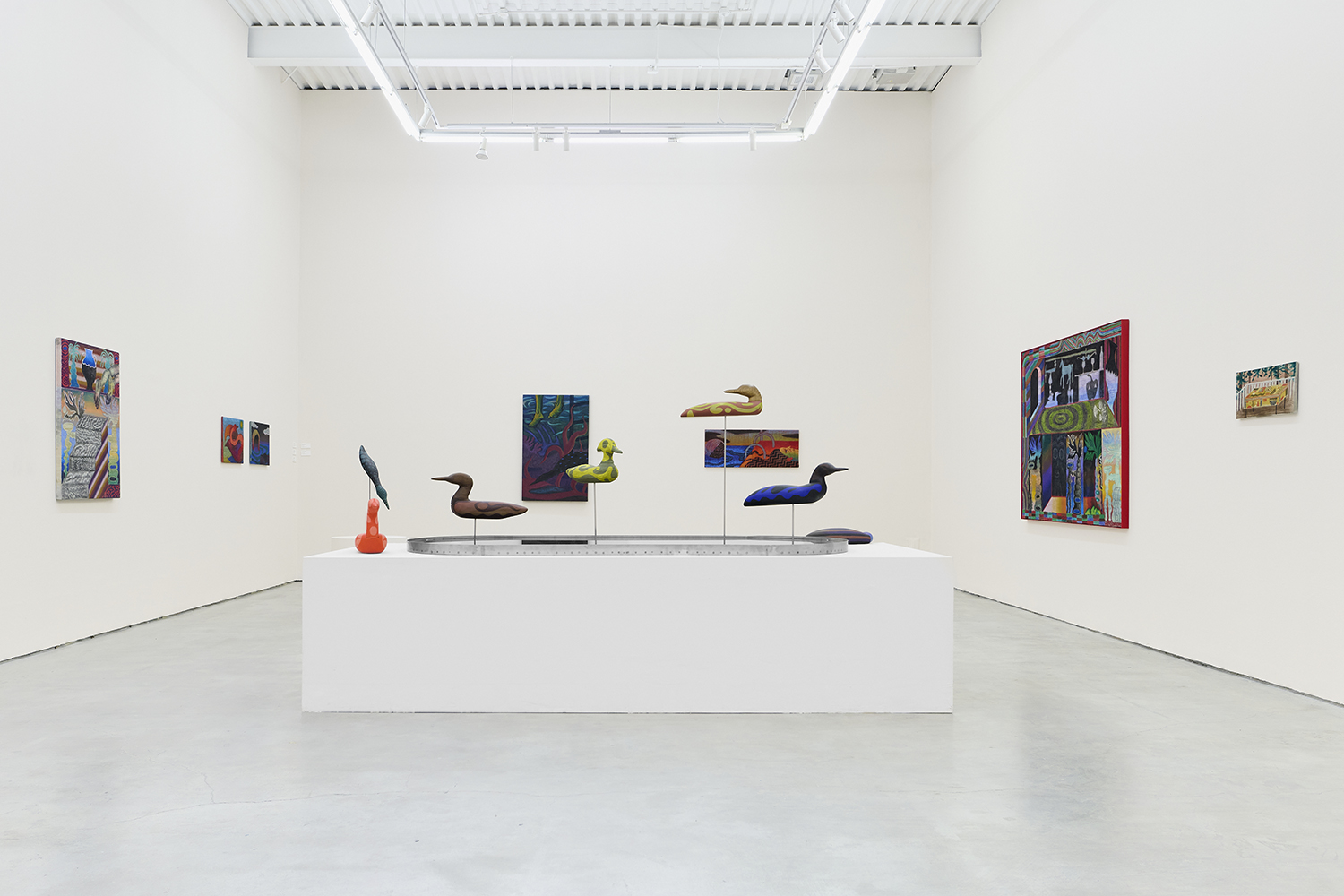 In the center of the gallery, decoys flock around an eight-foot stainless steel birdbath. The decoy sculptures map the artist’s interest in design onto three dimensions, creating avatars whose hallucinatory plumage hints at the supernatural. (The avatar, from the Sanskrit avatāra ‘descent’, is defined as “a manifestation of a deity or released soul in bodily form on earth; an incarnate divine teacher.”) The hand-carved sculptures and metalwork highlight MacMillan’s sculptural prowess in a predominantly painting show. The decoys, their bases and the larger-than-life birdbath are all fabricated in Red Hook, Brooklyn at the artist’s studio and at Friendly Metals, the artist-run metal studio where he works.