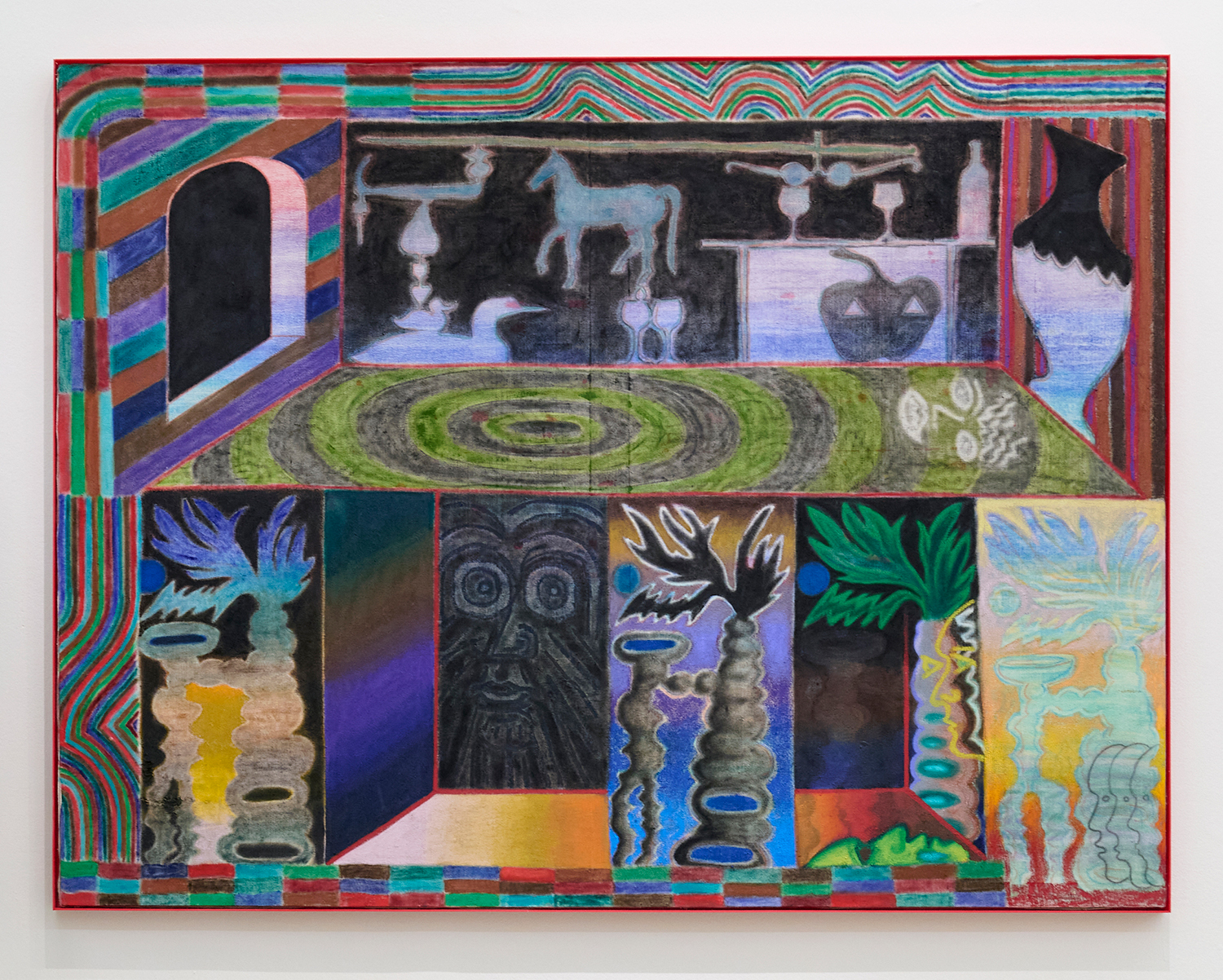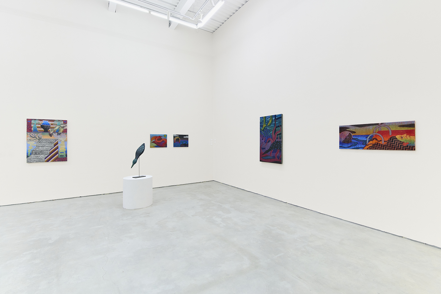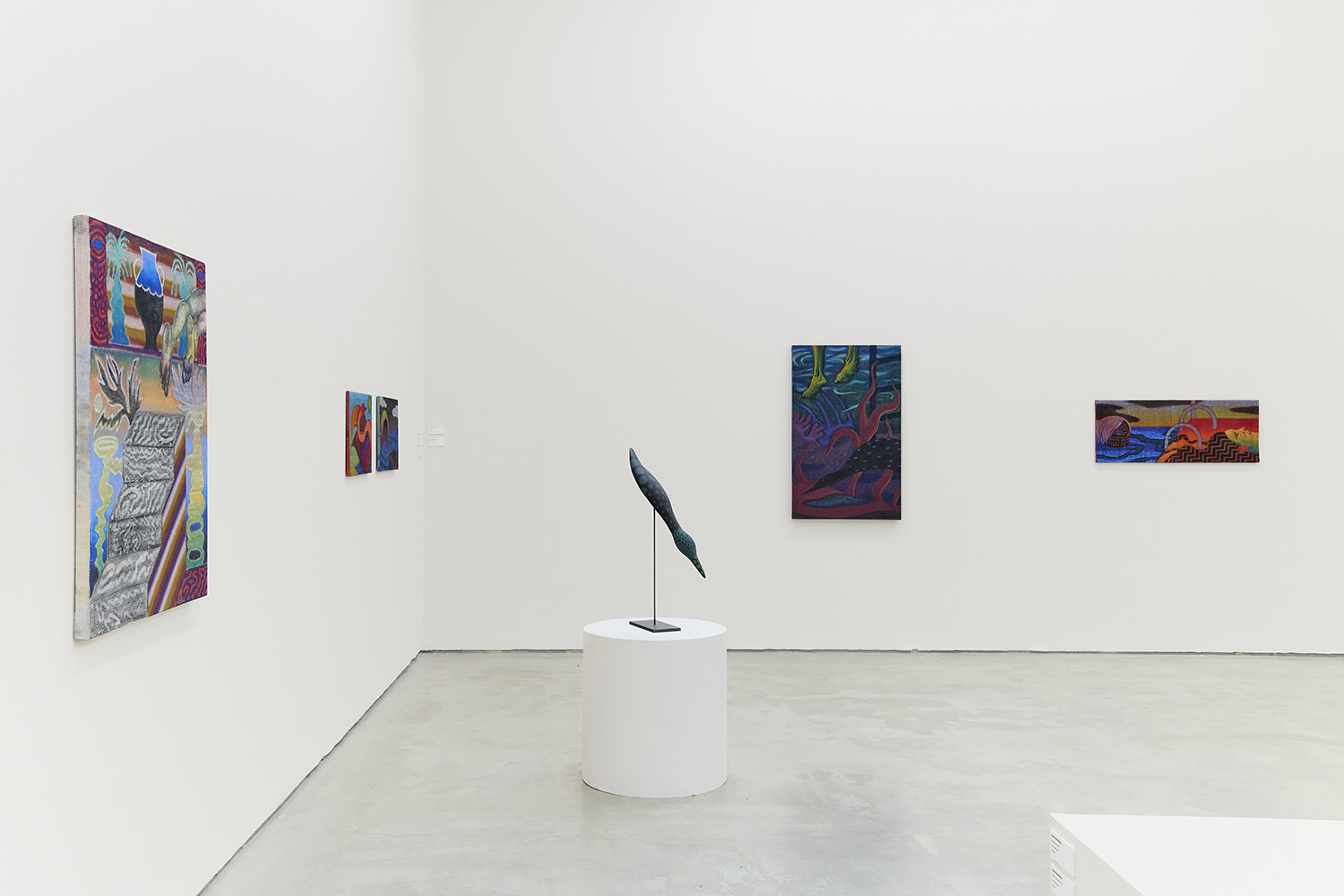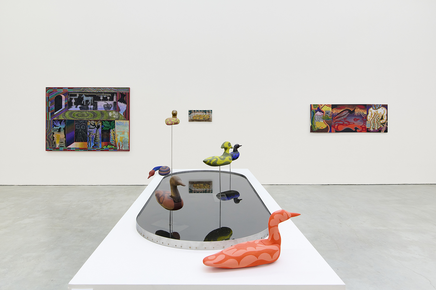 In the center of the gallery, decoys flock around an eight-foot stainless steel birdbath. The decoy sculptures map the artist’s interest in design onto three dimensions, creating avatars whose hallucinatory plumage hints at the supernatural. (The avatar, from the Sanskrit avatāra ‘descent’, is defined as “a manifestation of a deity or released soul in bodily form on earth; an incarnate divine teacher.”) The hand-carved sculptures and metalwork highlight MacMillan’s sculptural prowess in a predominantly painting show. The decoys, their bases and the larger-than-life birdbath are all fabricated in Red Hook, Brooklyn at the artist’s studio and at Friendly Metals, the artist-run metal studio where he works.