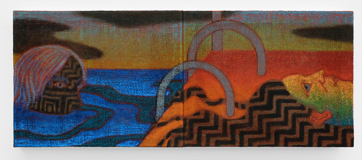 Julian MacMillan, The Bathers, 2026, oil on dyed burlap, 16 x 40 inches, 41 x 102 cm