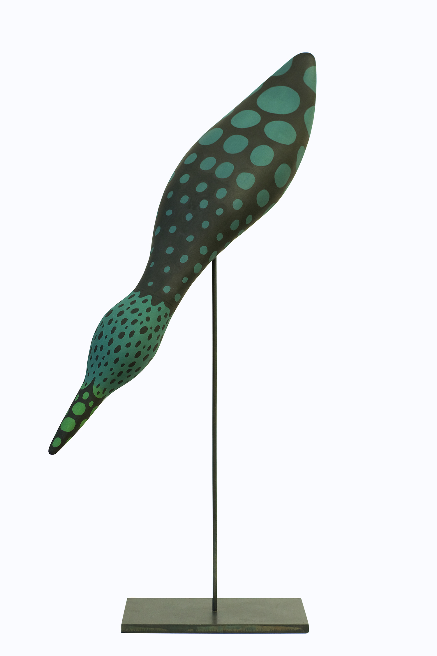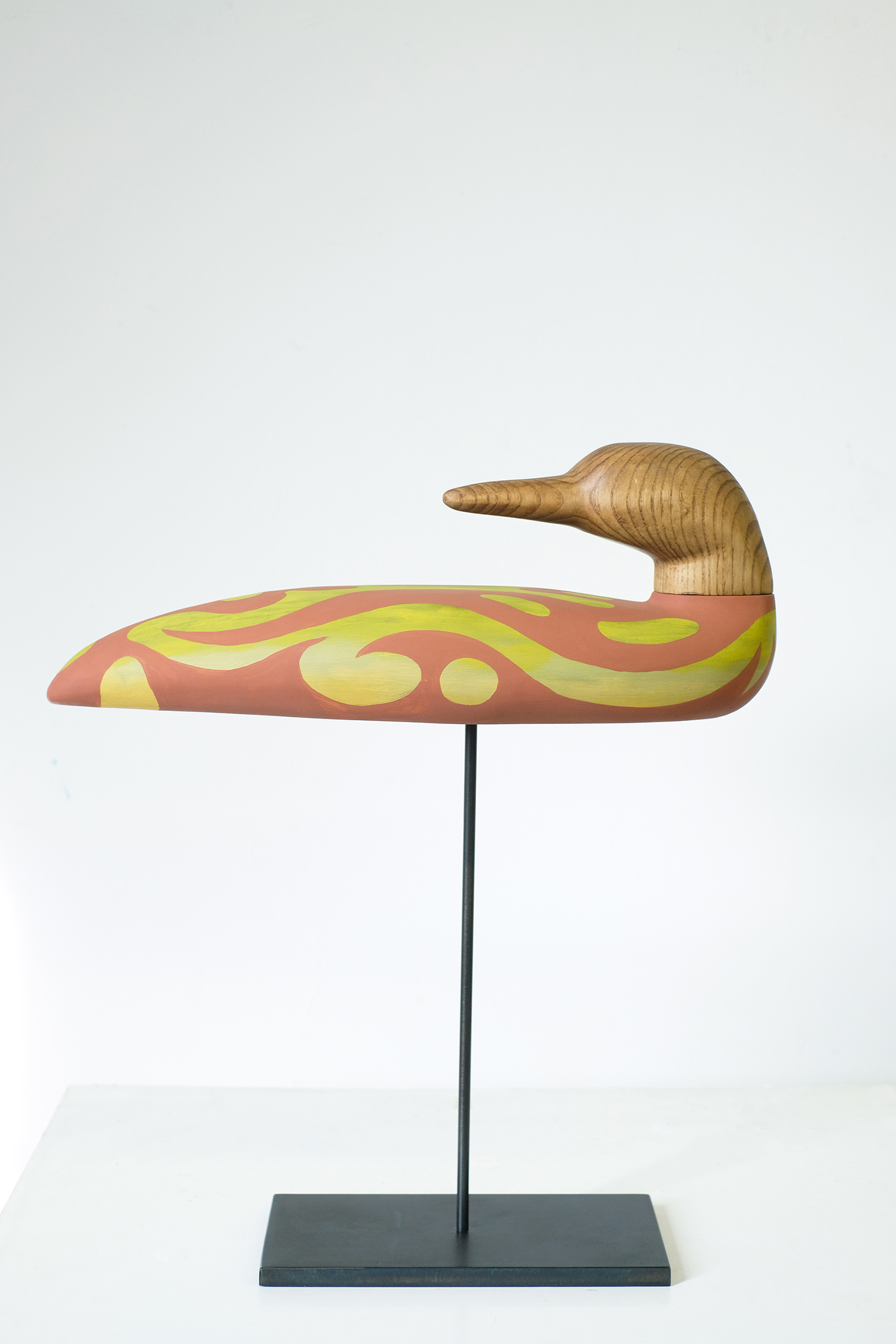 Julian MacMillan, Divining Decoy, 2026, wood, glue, paint, magnets, steel, 33 x 14 x 10 inches, 83 x 36 x 25 cm