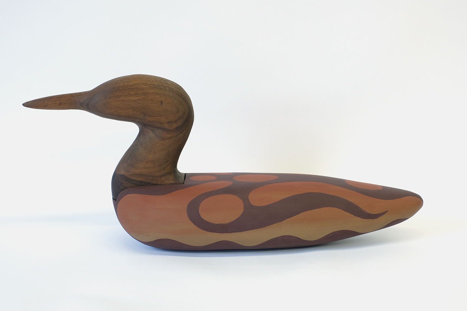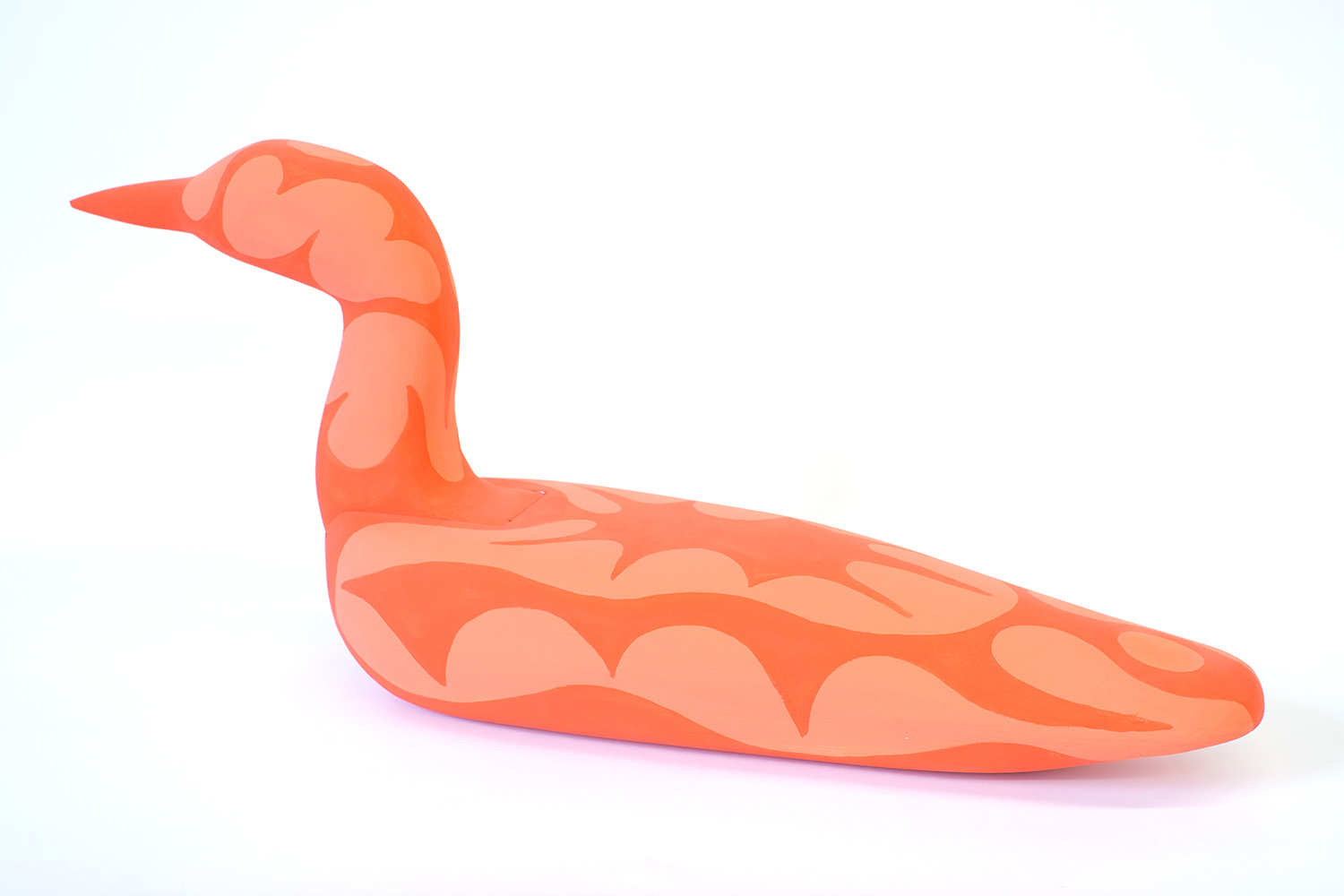 Julian MacMillan, Orange Loon Decoy, 2024, wood, glue, paint, 12 x 24 x 6 inches, 30 x 61 x 15 cm
