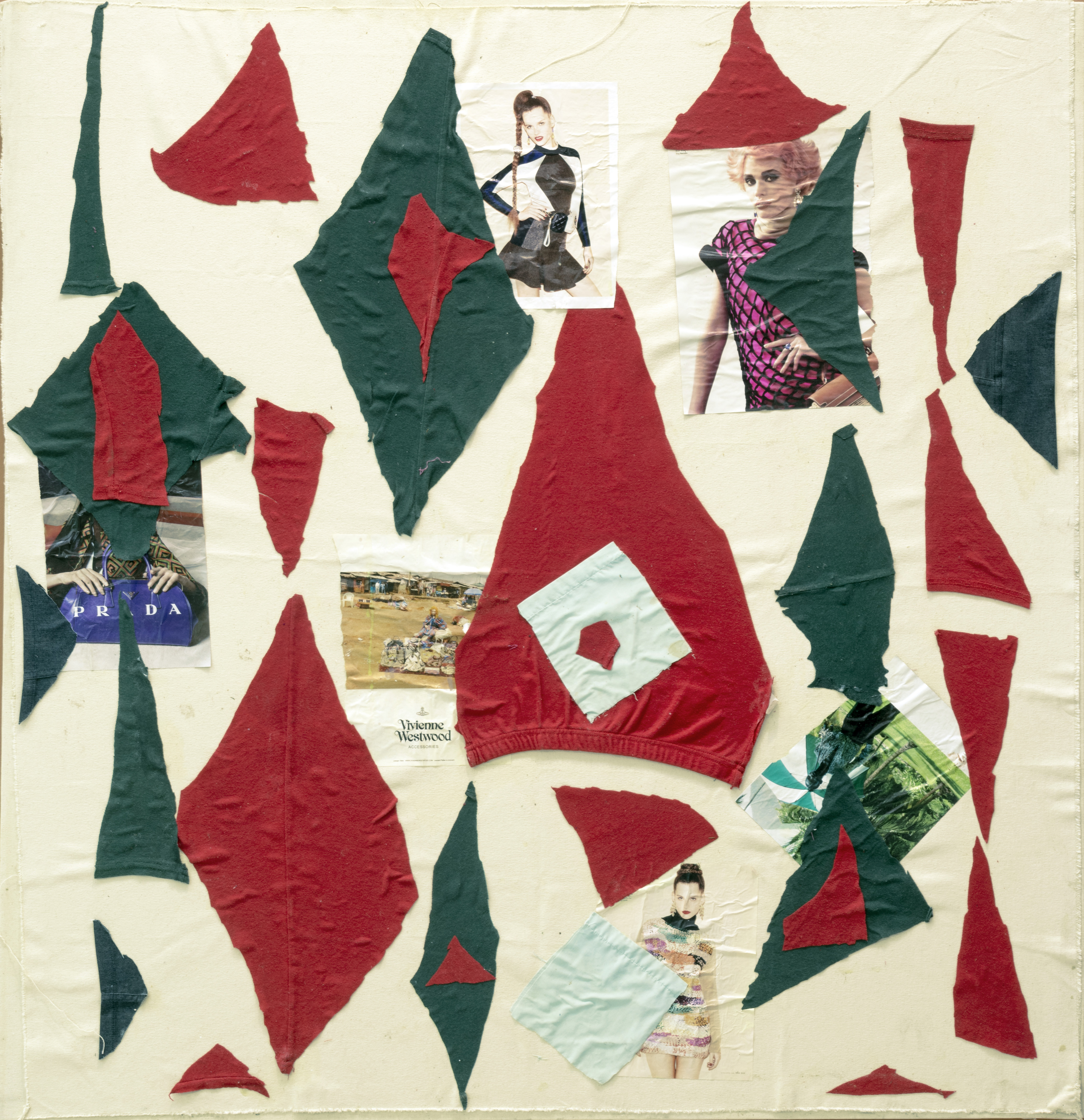 The canvasses have a rhythm to them and often a harmony of colors and textures, as the Afro-Carribean textiles or Brooklyn “bargain basement” threads mix it up on the surface with a smattering of magazine ladies and luxury logos. Their improvisational inventiveness and hasty scissoring mirror the playfulness of Matisse cutouts or the quilts of Gee’s Bend.