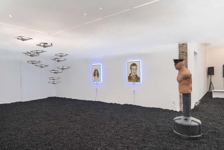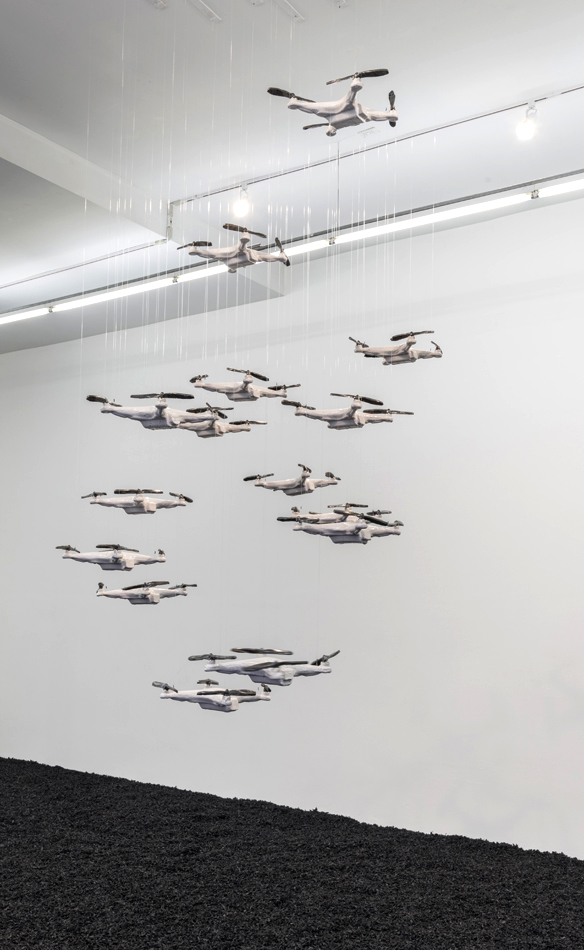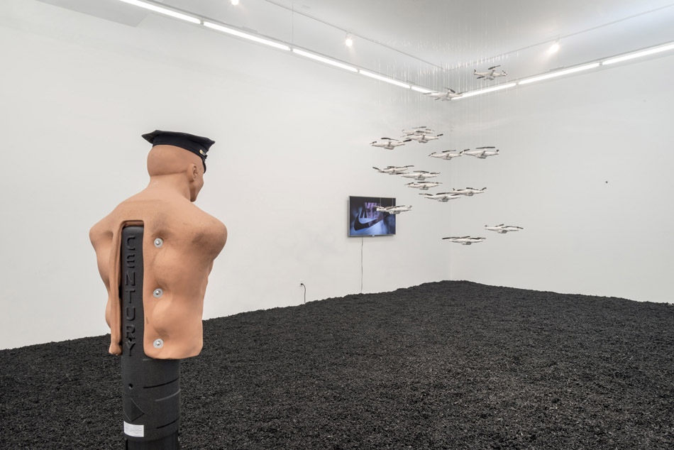 In this show KATSU explores the bizarre interchange between our influence on technology and its influence on us. He finds inspiration in the slippages between what new tech innovations can do for us and what they unexpectedly do to us. Technology seems to grow exponentially while human understanding, emotion, intelligence, spirituality or capacity in general inches along logarithmically at best. For a nerd hobbyist Shell Man who spends so many hours of the day submerged in video games, robotics or digital imaging, KATSU makes art about the detachment unavoidable in such a mediated existence. Perhaps the soul of the show is the Shellman video and audio piece, a self-portrait in a way with an empty Tyvec suit blowing ghost-like under a drone in flight.