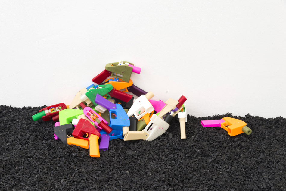 Other groups of works in the show also deal with the mediation of technology in image making: the show will include 3D printed handguns, whose candy colored toy-like charm belies their terrifying implications; in an update of the infamous work by Vito Acconci masturbating under the gallery floor KATSU will install a Grand Theft Autopiece where the artist is playing the immersive game live from an undisclosed location during open hours; there are also videos about the imagery involved in waiting for browser pages to load; shit paintings that are meticulous renderings of tech giants in control of more information than the government created from the compromising bio-matter of the artist; and a piece about Vape culture that will erase the whole gallery show intermittently in a puff of smoke.