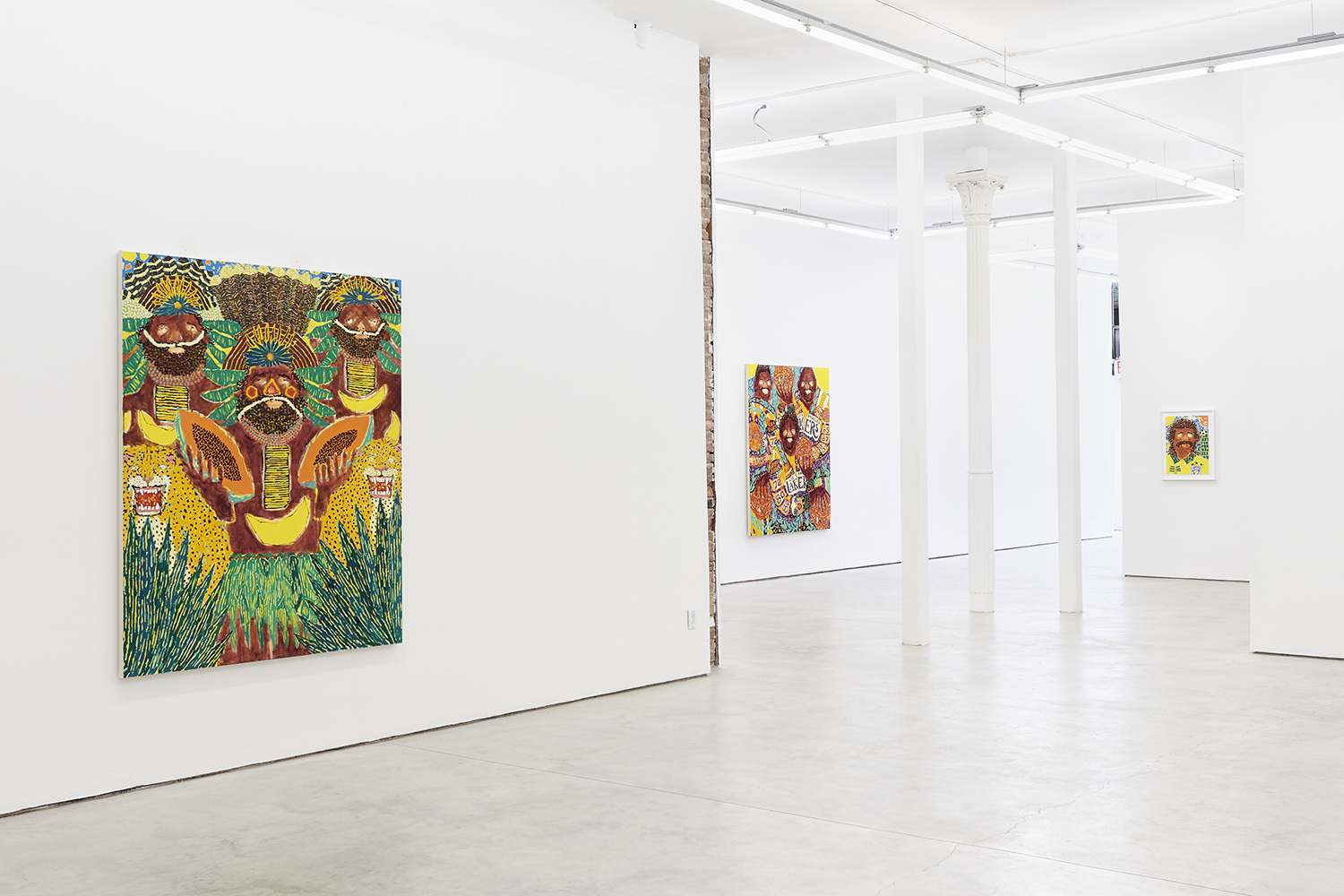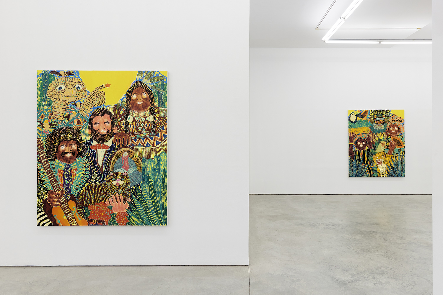 Not just the choices of imagery but the way he renders things is inventive and fresh: the technological-looking seeds of a papaya, the tiny looped Cherio’s of hair, the feathers of a turkey or the striations of a plant. Patterning covers everything except the skin of the figures and a recurring bright yellow sun. From the understandably ornate ceremonial garb to the crazily articulated wrinkles on E.T., everything gets activated. Fruits and animals from different continents coexist with figures of different skin color wearing indigenous garb synthesized from very disparate cultures and time periods: there is a lot going on in each work!