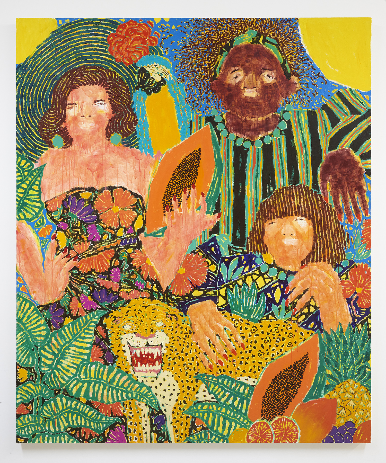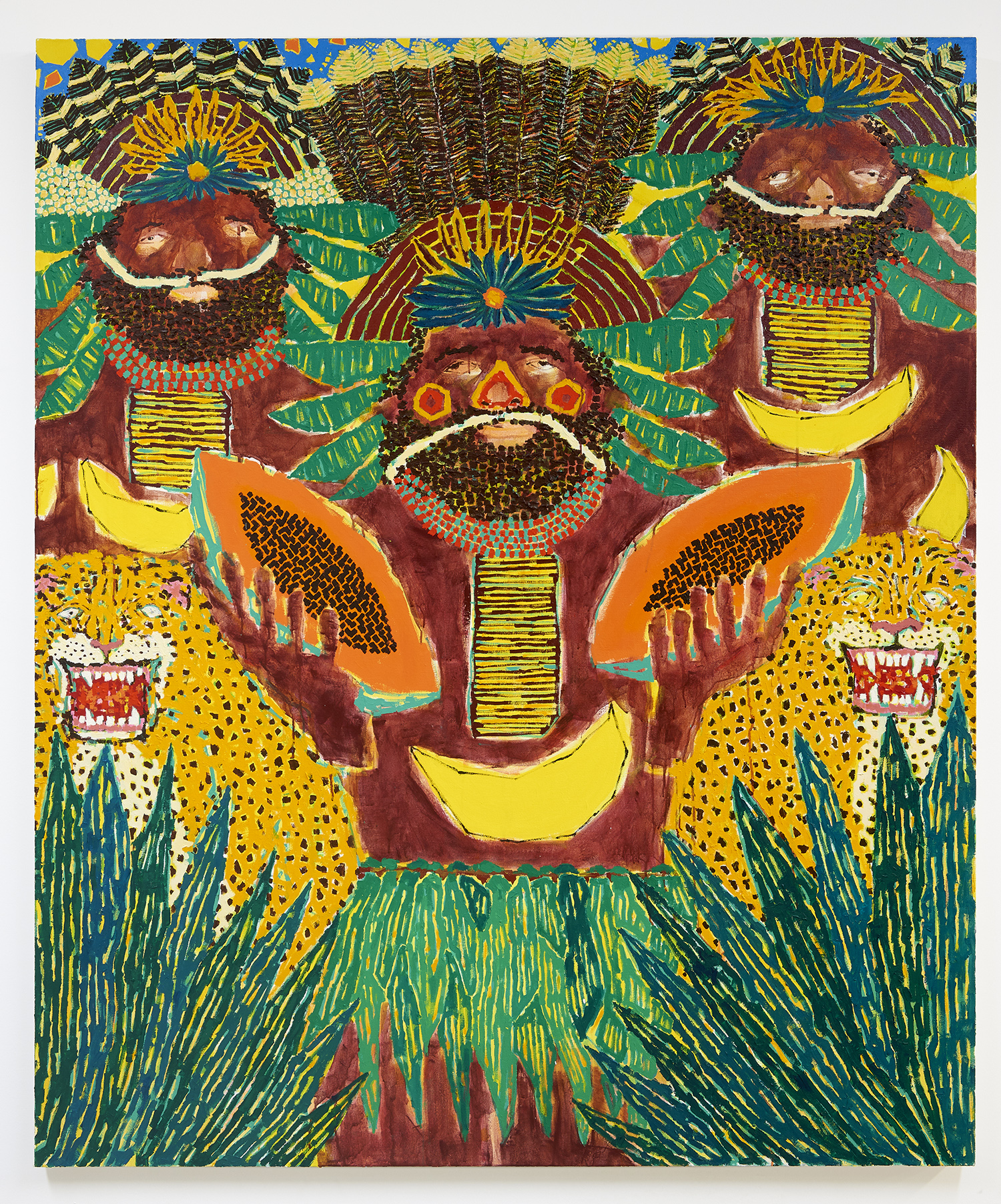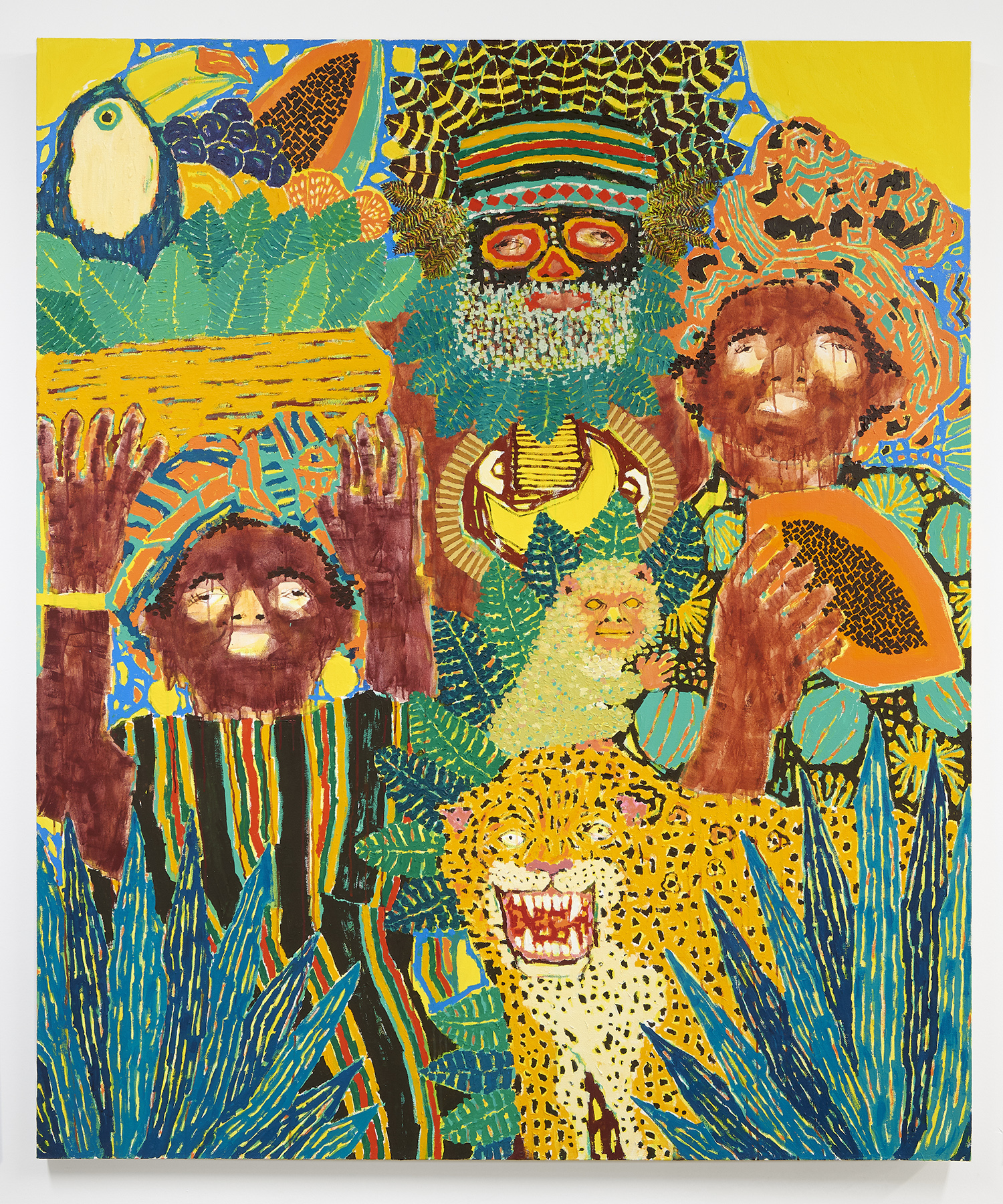 Jaguar Men, 2020, acrylic and oil on canvas, 72 x 60 inches, 183 x 152 cm