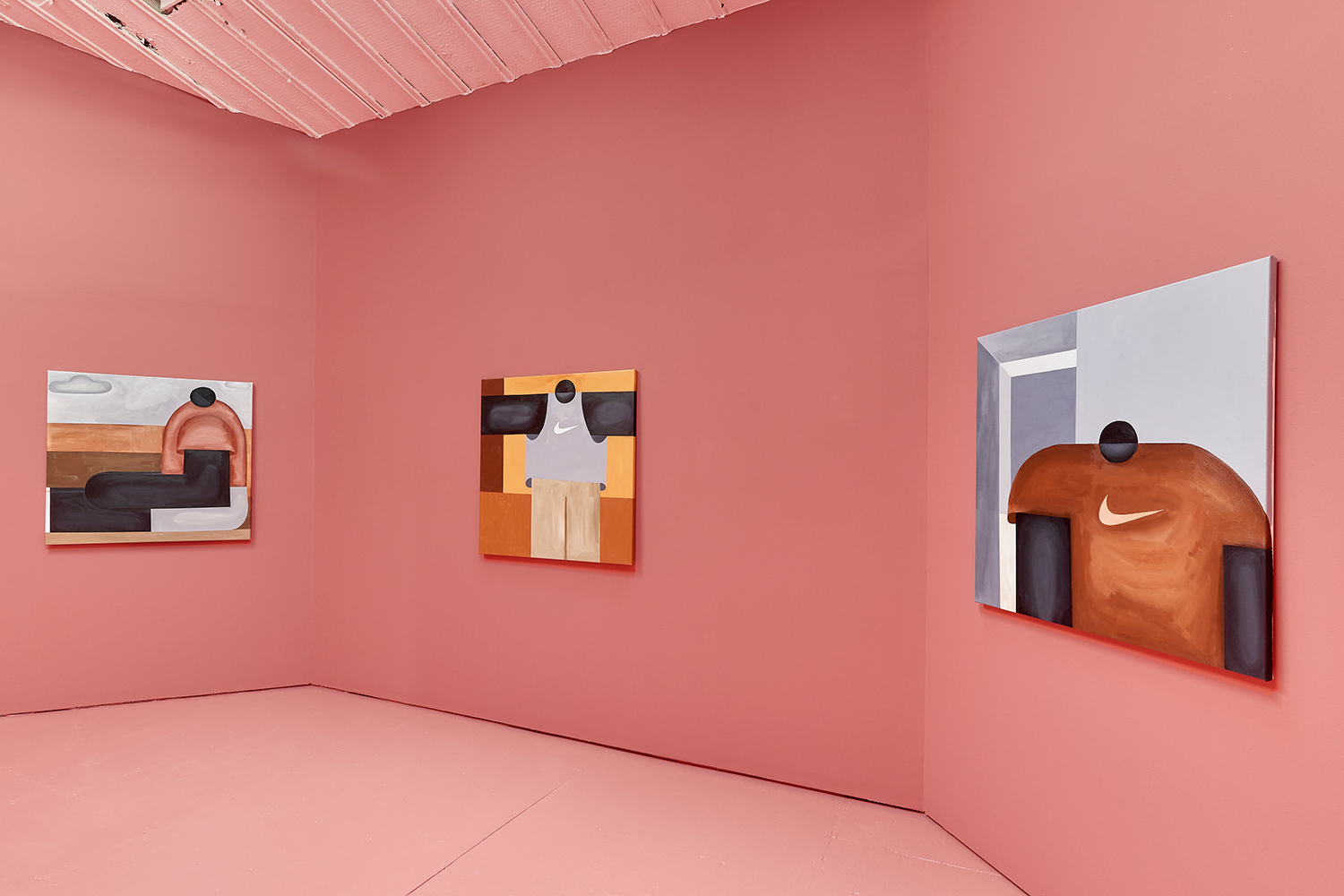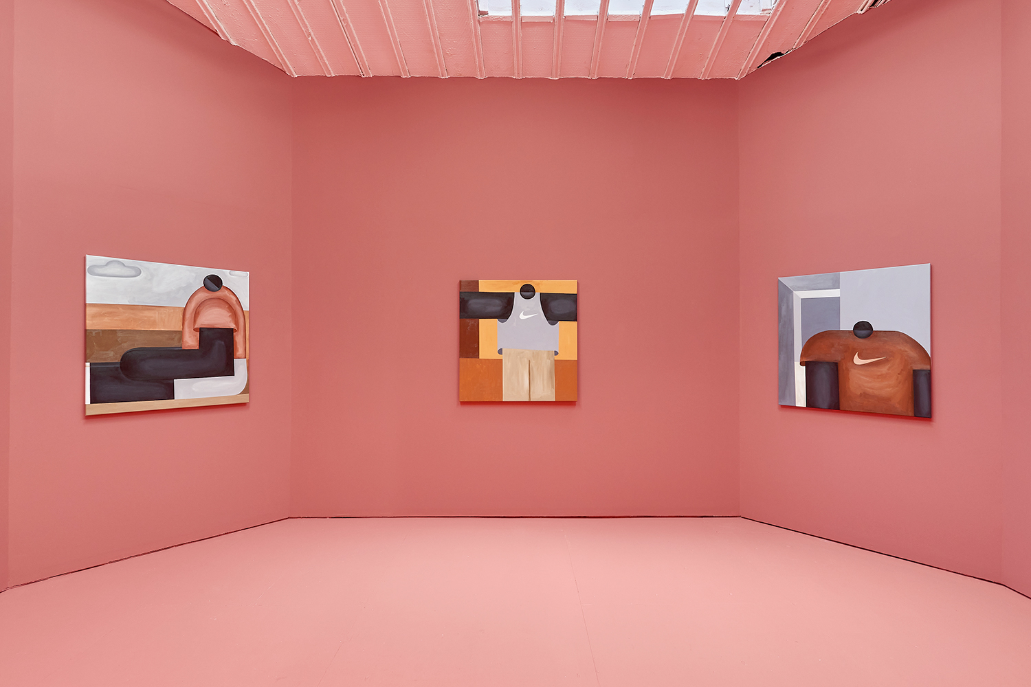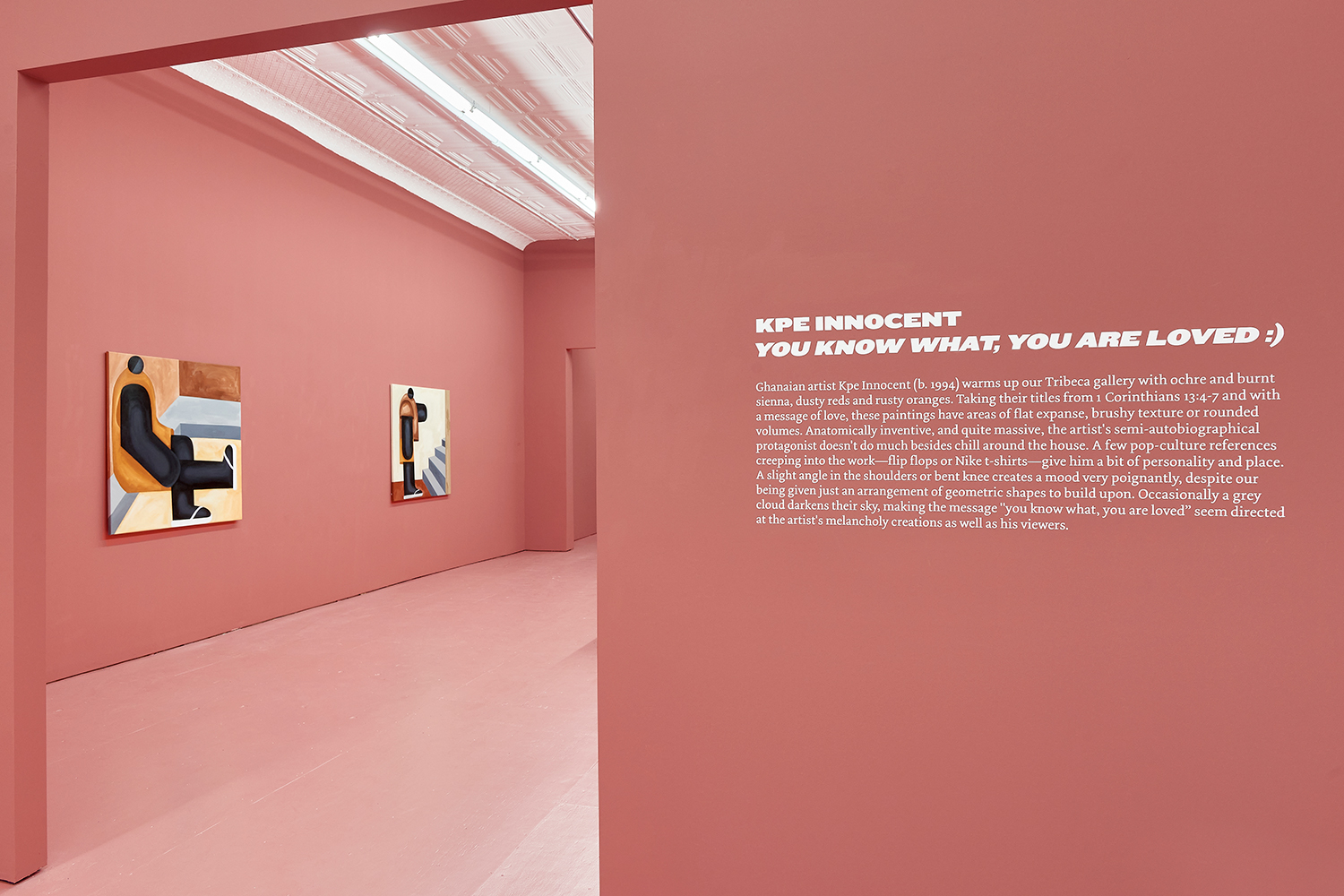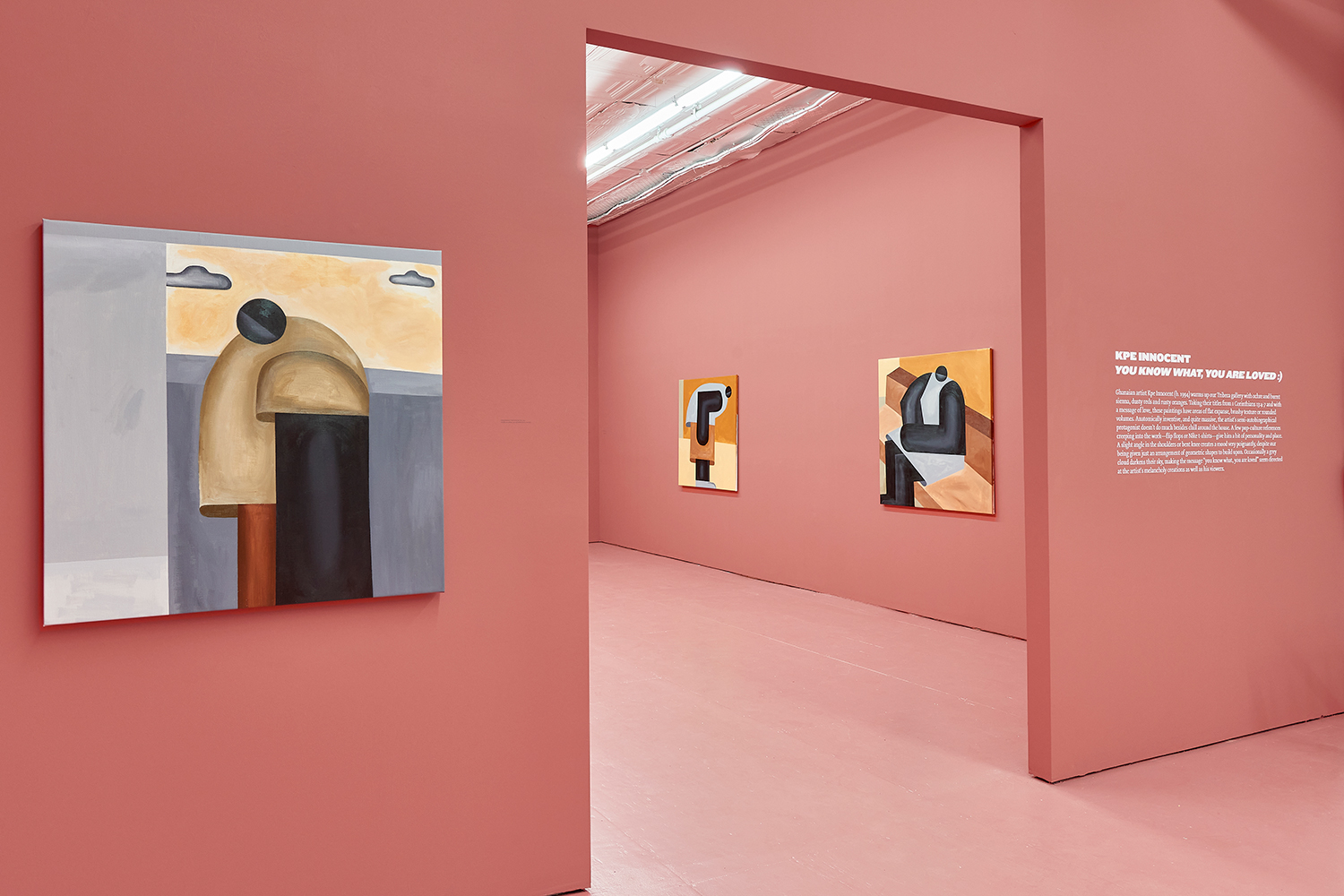 Taking their titles from snippets of 1 Corinthians 13:4-7 and with a message of love, these paintings include areas of flat expanse, brushy texture or rounded volumes. Anatomically inventive, and quite massive, his semi-autobiographical protagonist doesn’t do much besides chill around the house. A slight angle in the shoulders, or bent knee creates a mood very poignantly, despite our being given really just an arrangement of geometric shapes to build upon. An occasional grey cloud darkens his sky, making the message “you know what, you are loved :)” seem directed at his melancholy creations as well as his audience.