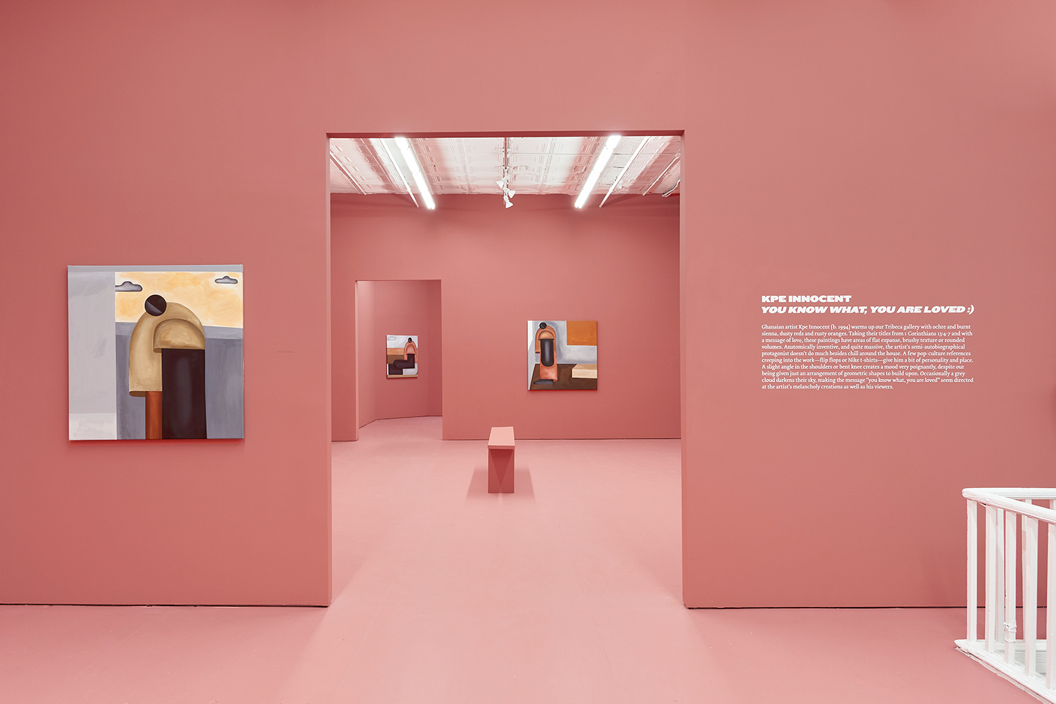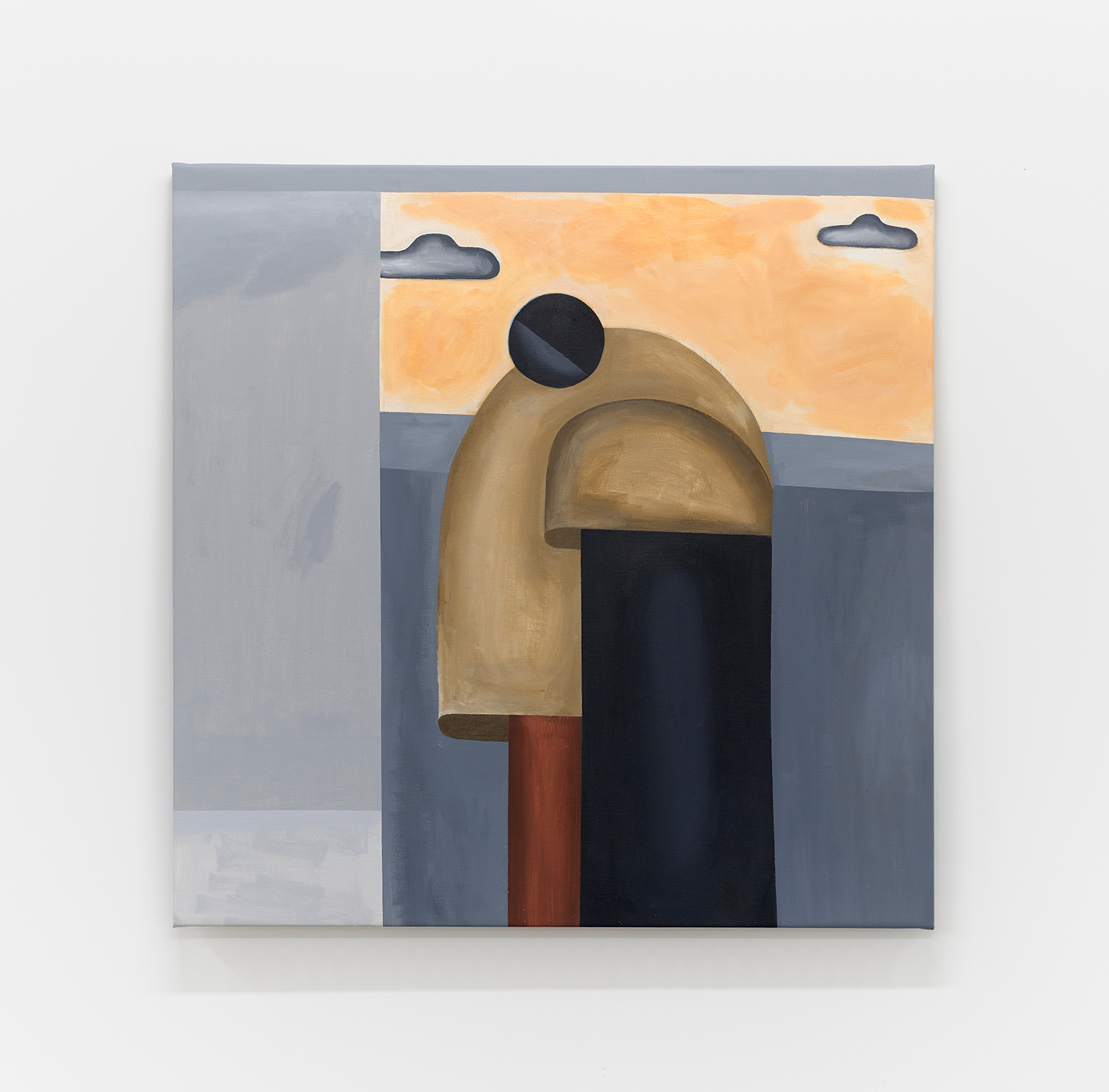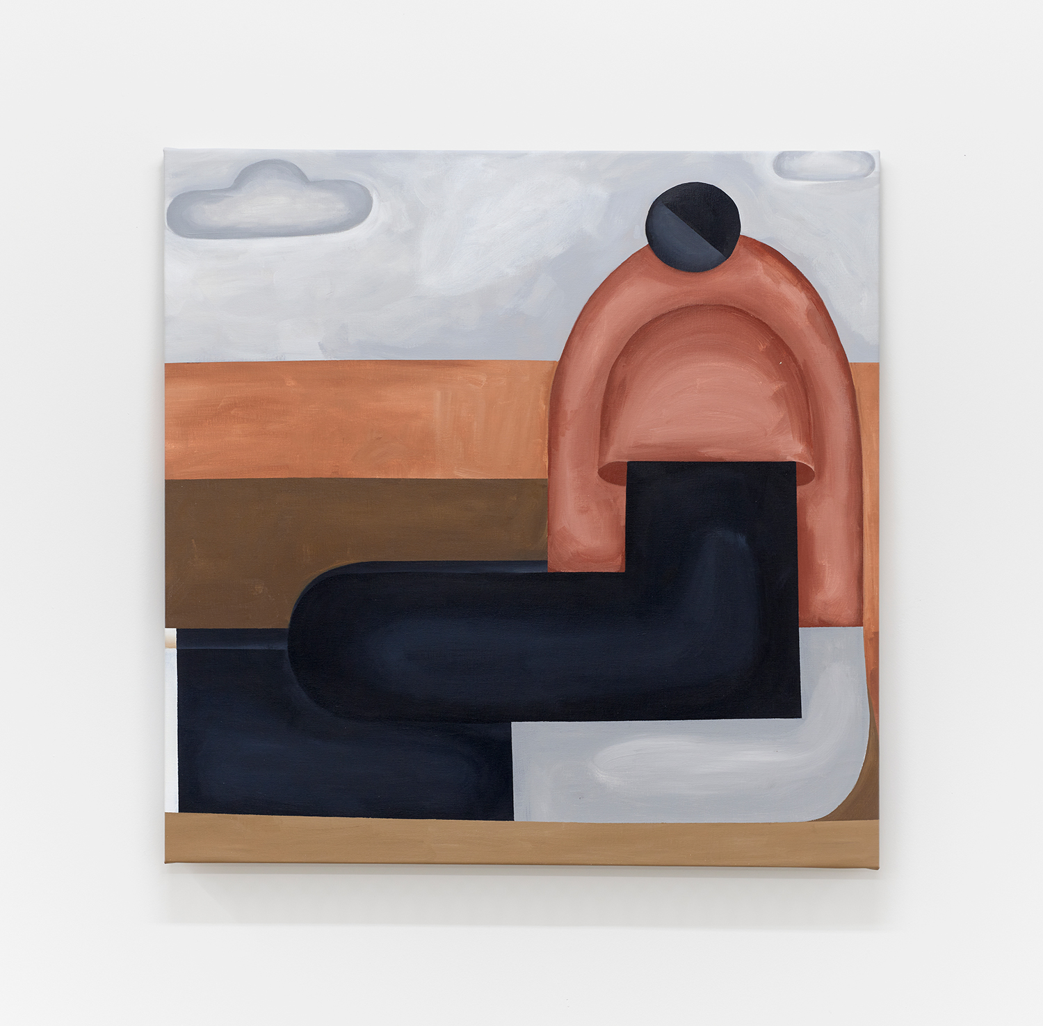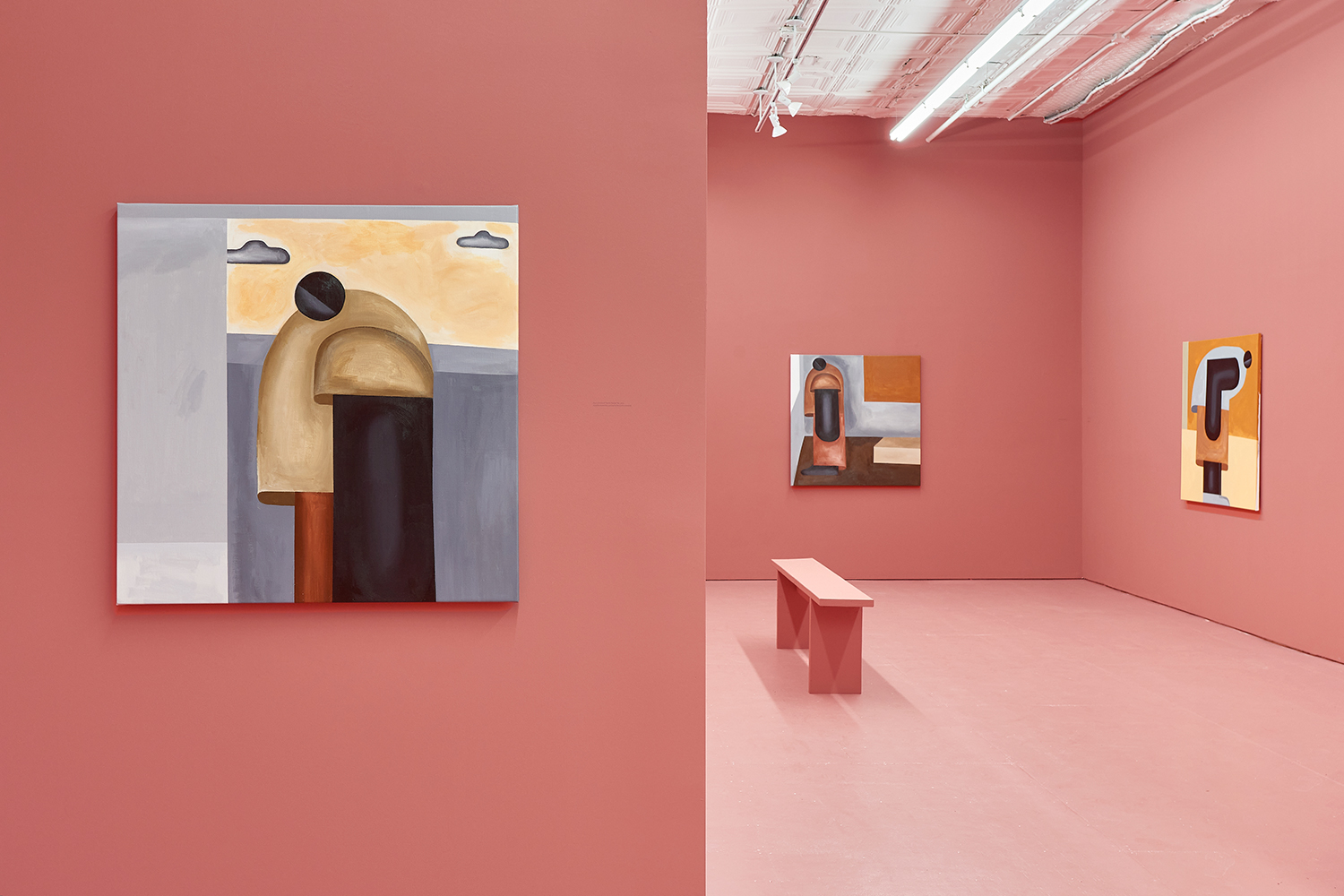 Taking their titles from snippets of 1 Corinthians 13:4-7 and with a message of love, these paintings include areas of flat expanse, brushy texture or rounded volumes. Anatomically inventive, and quite massive, his semi-autobiographical protagonist doesn’t do much besides chill around the house. A slight angle in the shoulders, or bent knee creates a mood very poignantly, despite our being given really just an arrangement of geometric shapes to build upon. An occasional grey cloud darkens his sky, making the message “you know what, you are loved :)” seem directed at his melancholy creations as well as his audience.