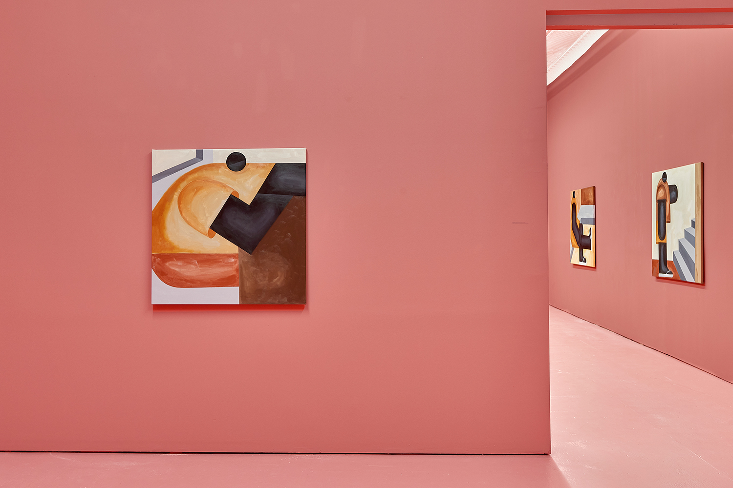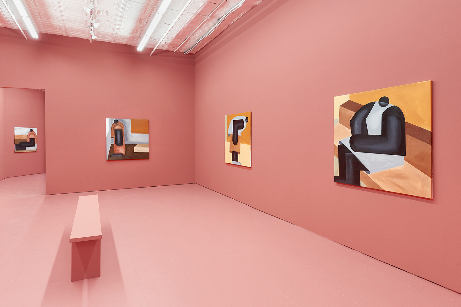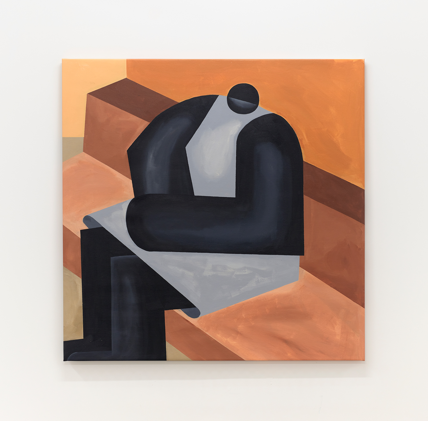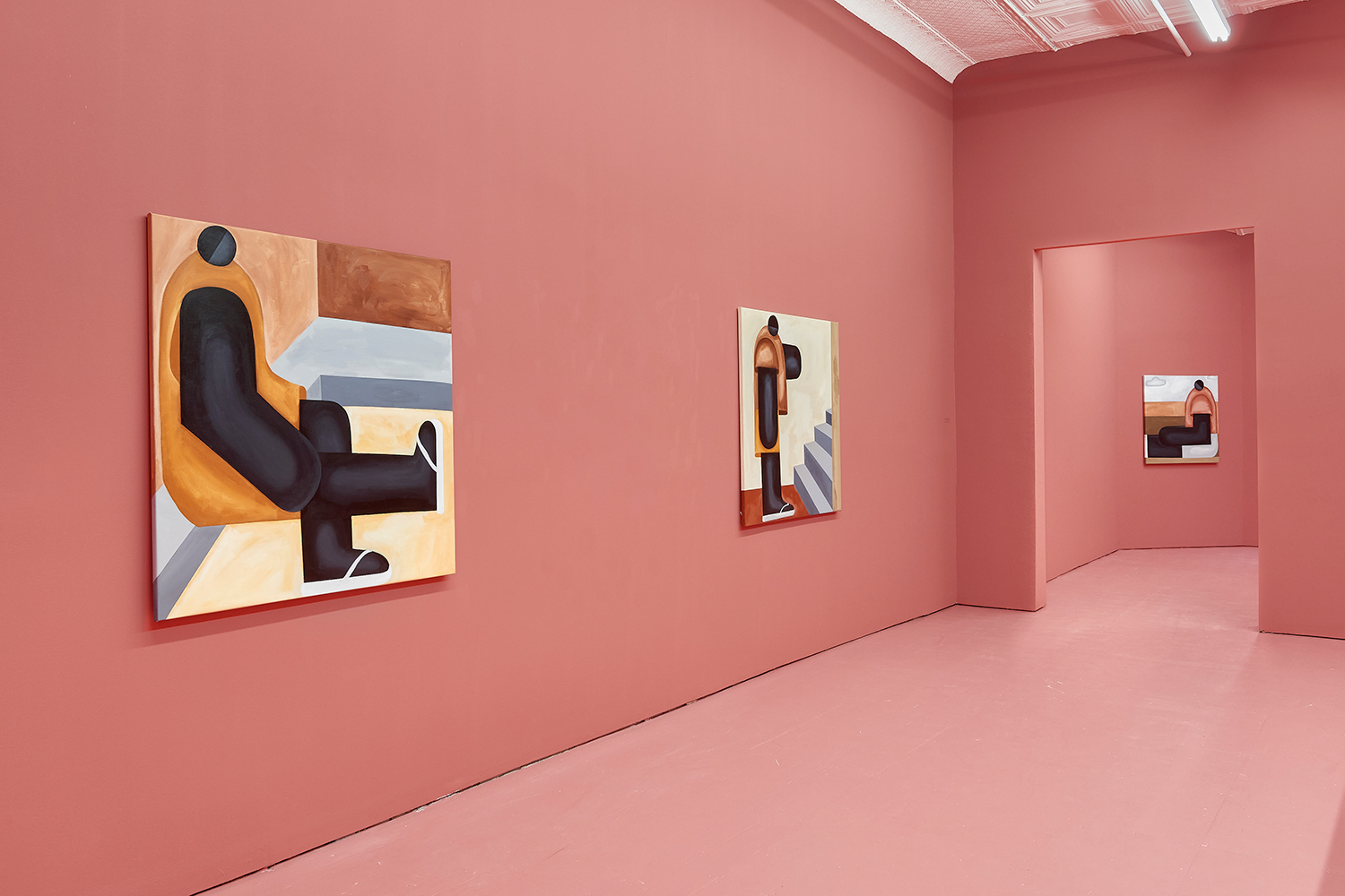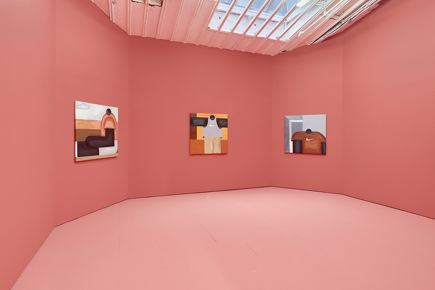 Taking their titles from snippets of 1 Corinthians 13:4-7 and with a message of love, these paintings include areas of flat expanse, brushy texture or rounded volumes. Anatomically inventive, and quite massive, his semi-autobiographical protagonist doesn’t do much besides chill around the house. A slight angle in the shoulders, or bent knee creates a mood very poignantly, despite our being given really just an arrangement of geometric shapes to build upon. An occasional grey cloud darkens his sky, making the message “you know what, you are loved :)” seem directed at his melancholy creations as well as his audience.