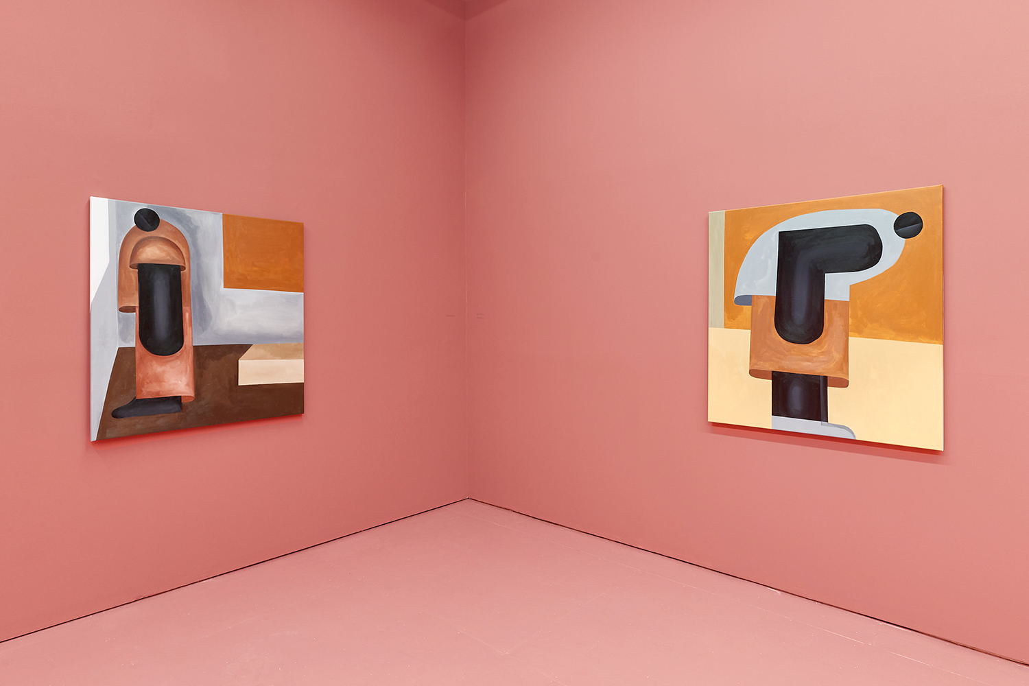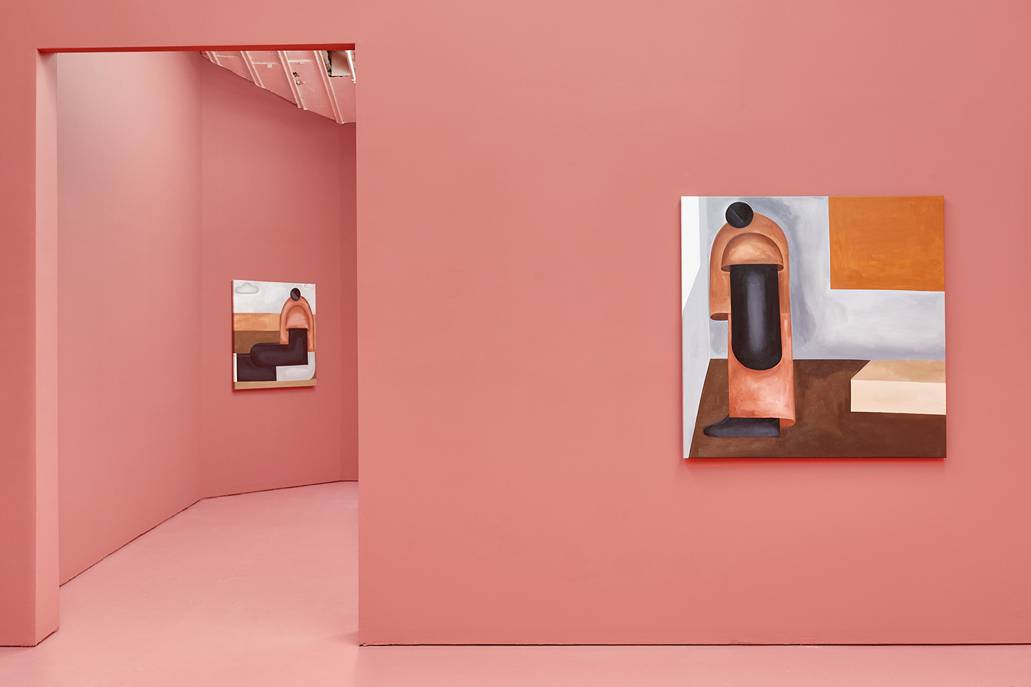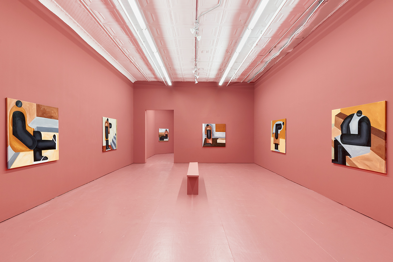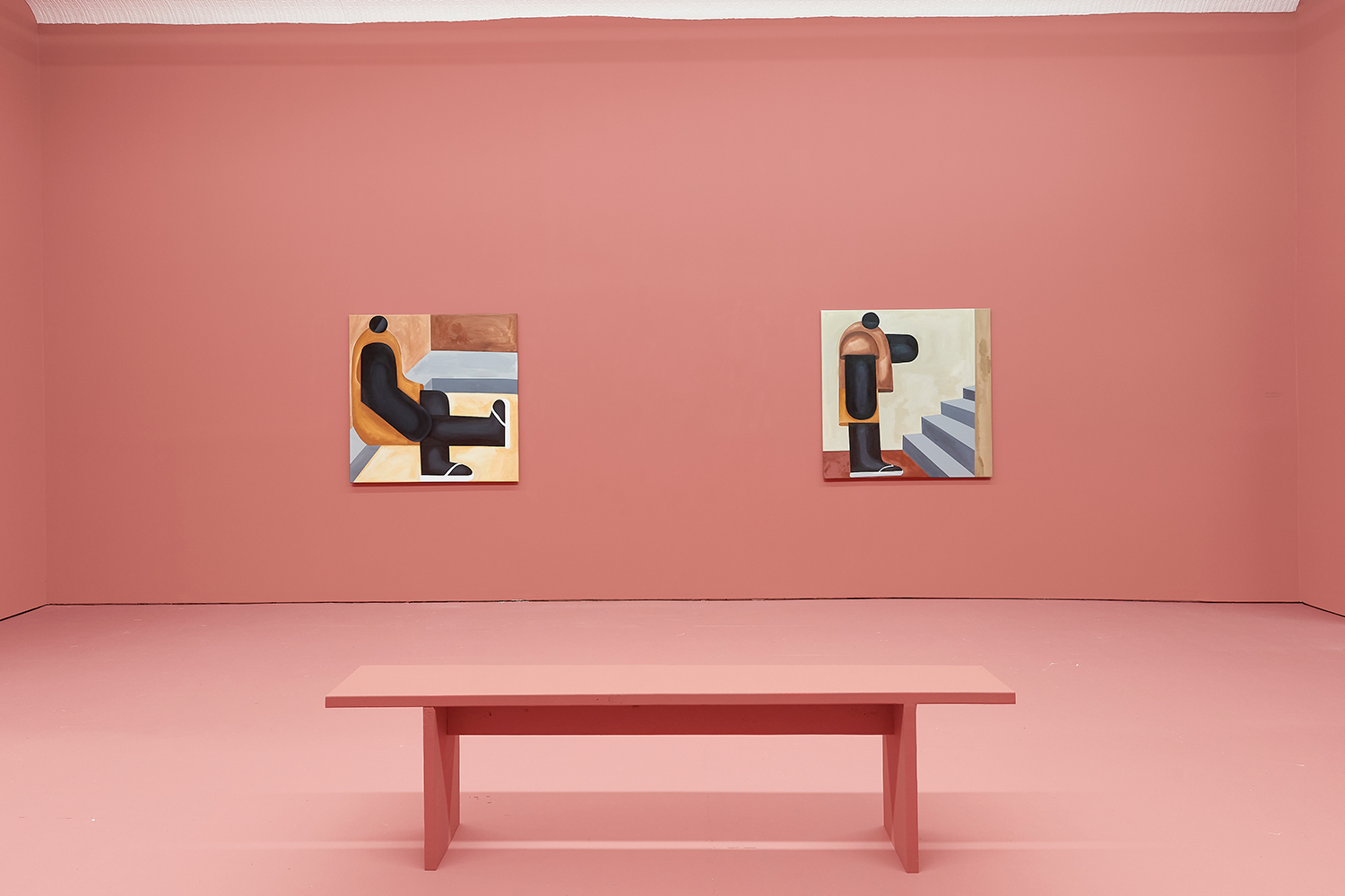 Taking their titles from snippets of 1 Corinthians 13:4-7 and with a message of love, these paintings include areas of flat expanse, brushy texture or rounded volumes. Anatomically inventive, and quite massive, his semi-autobiographical protagonist doesn’t do much besides chill around the house. A slight angle in the shoulders, or bent knee creates a mood very poignantly, despite our being given really just an arrangement of geometric shapes to build upon. An occasional grey cloud darkens his sky, making the message “you know what, you are loved :)” seem directed at his melancholy creations as well as his audience.