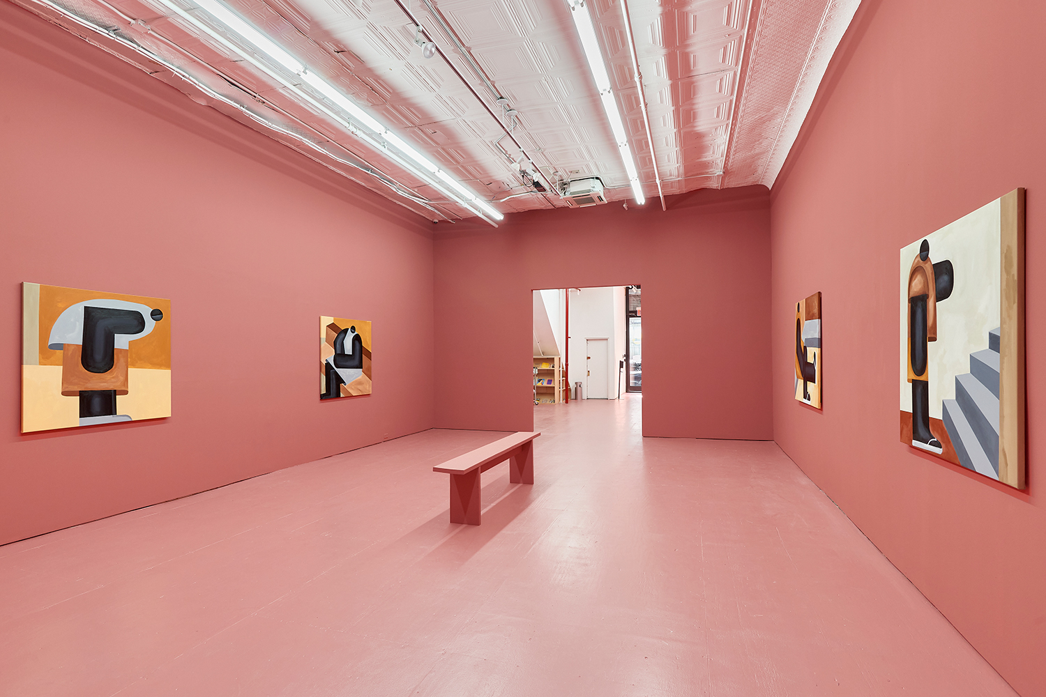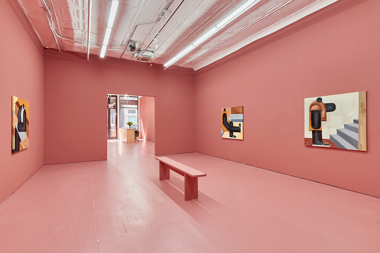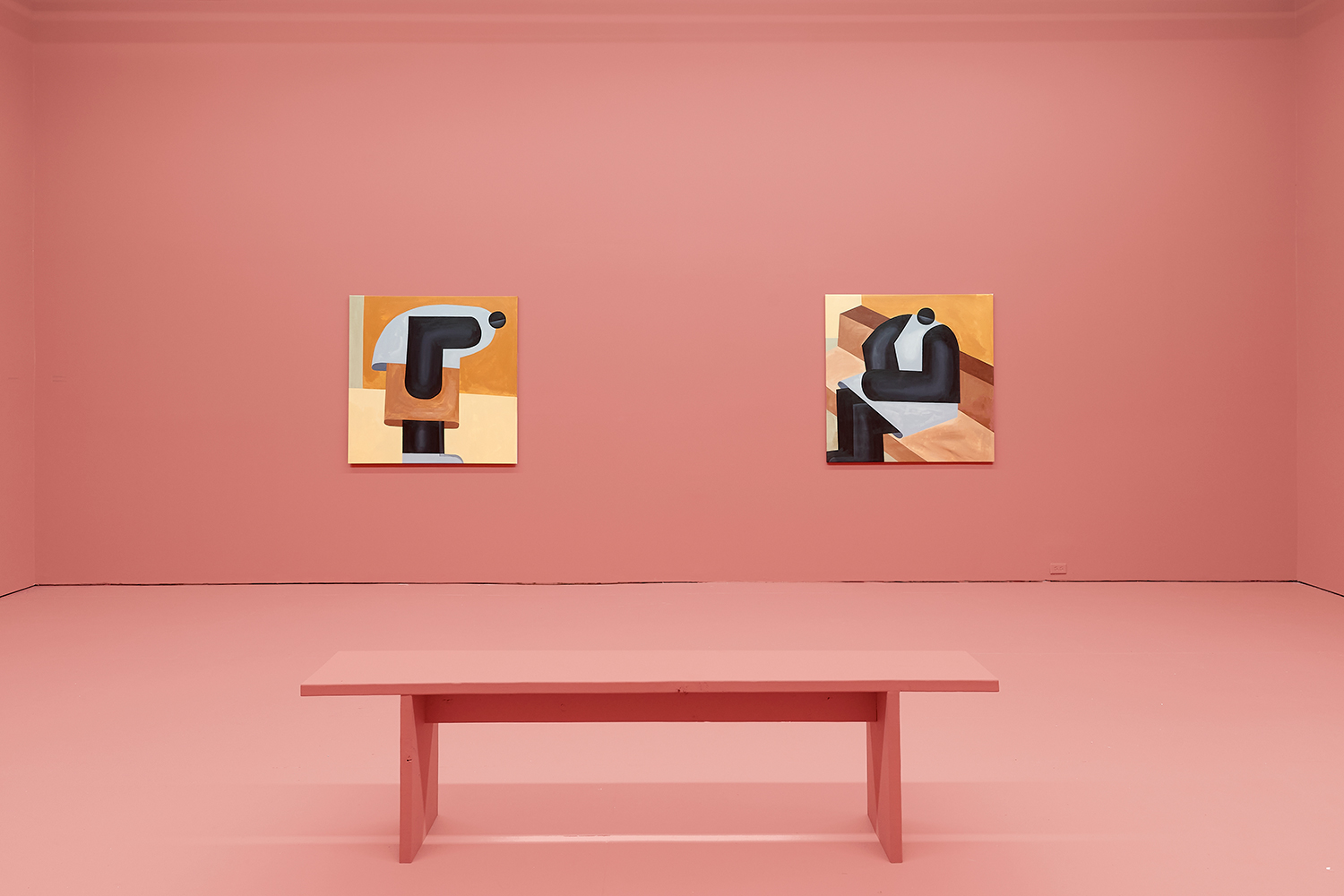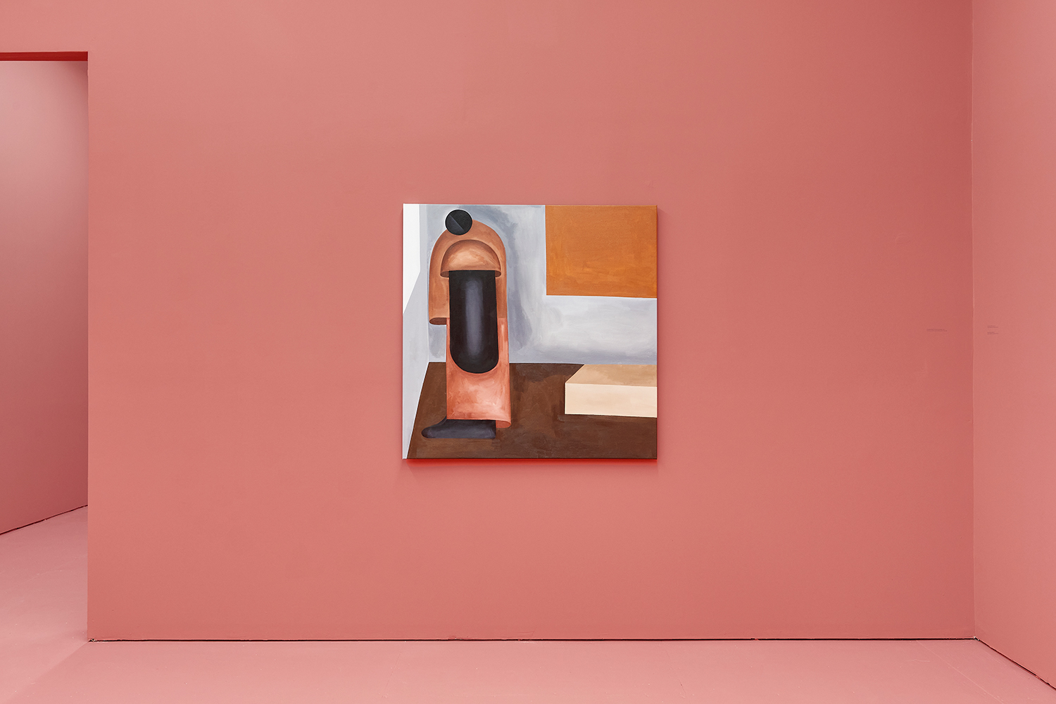 Taking their titles from snippets of 1 Corinthians 13:4-7 and with a message of love, these paintings include areas of flat expanse, brushy texture or rounded volumes. Anatomically inventive, and quite massive, his semi-autobiographical protagonist doesn’t do much besides chill around the house. A slight angle in the shoulders, or bent knee creates a mood very poignantly, despite our being given really just an arrangement of geometric shapes to build upon. An occasional grey cloud darkens his sky, making the message “you know what, you are loved :)” seem directed at his melancholy creations as well as his audience.