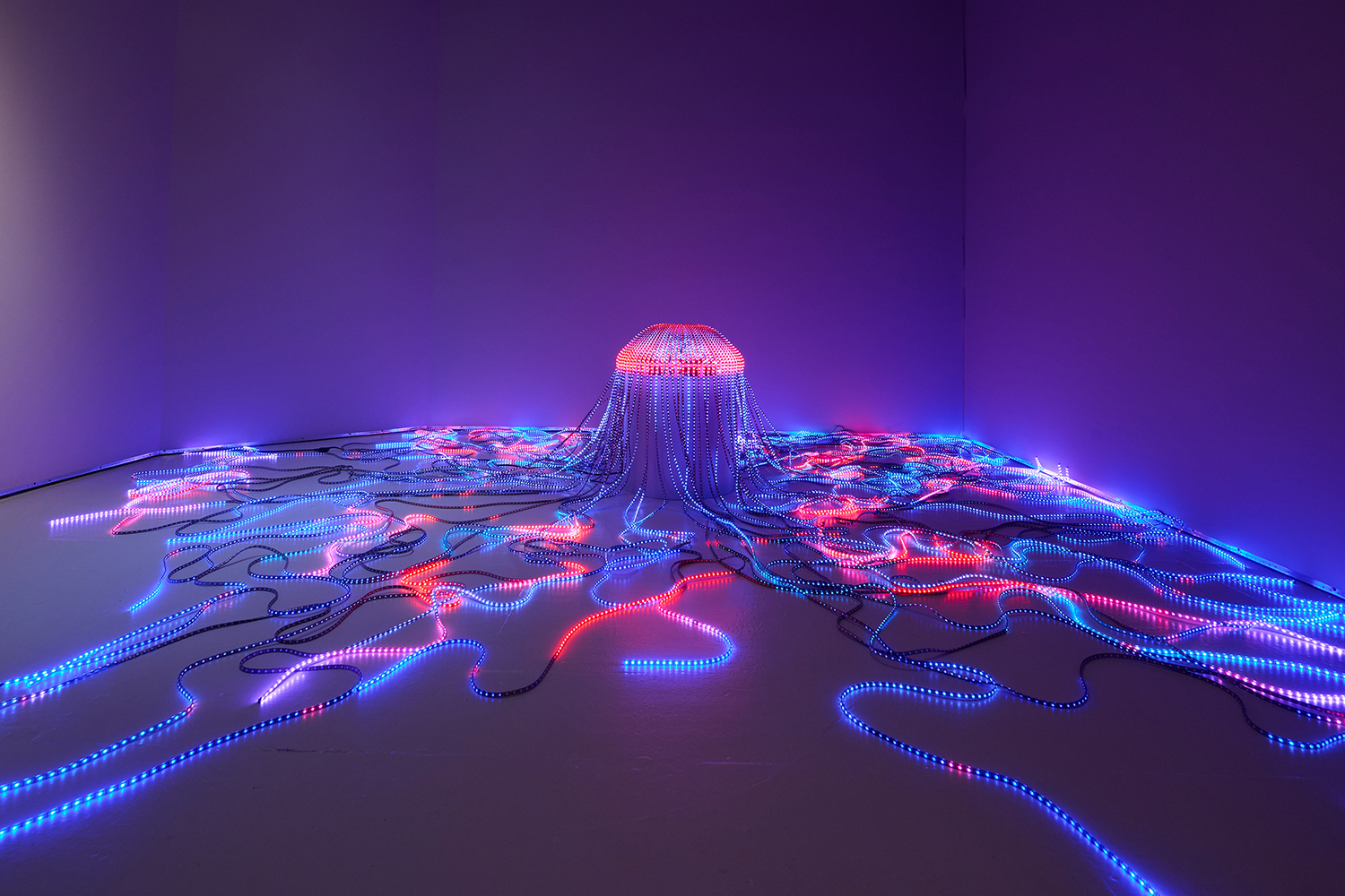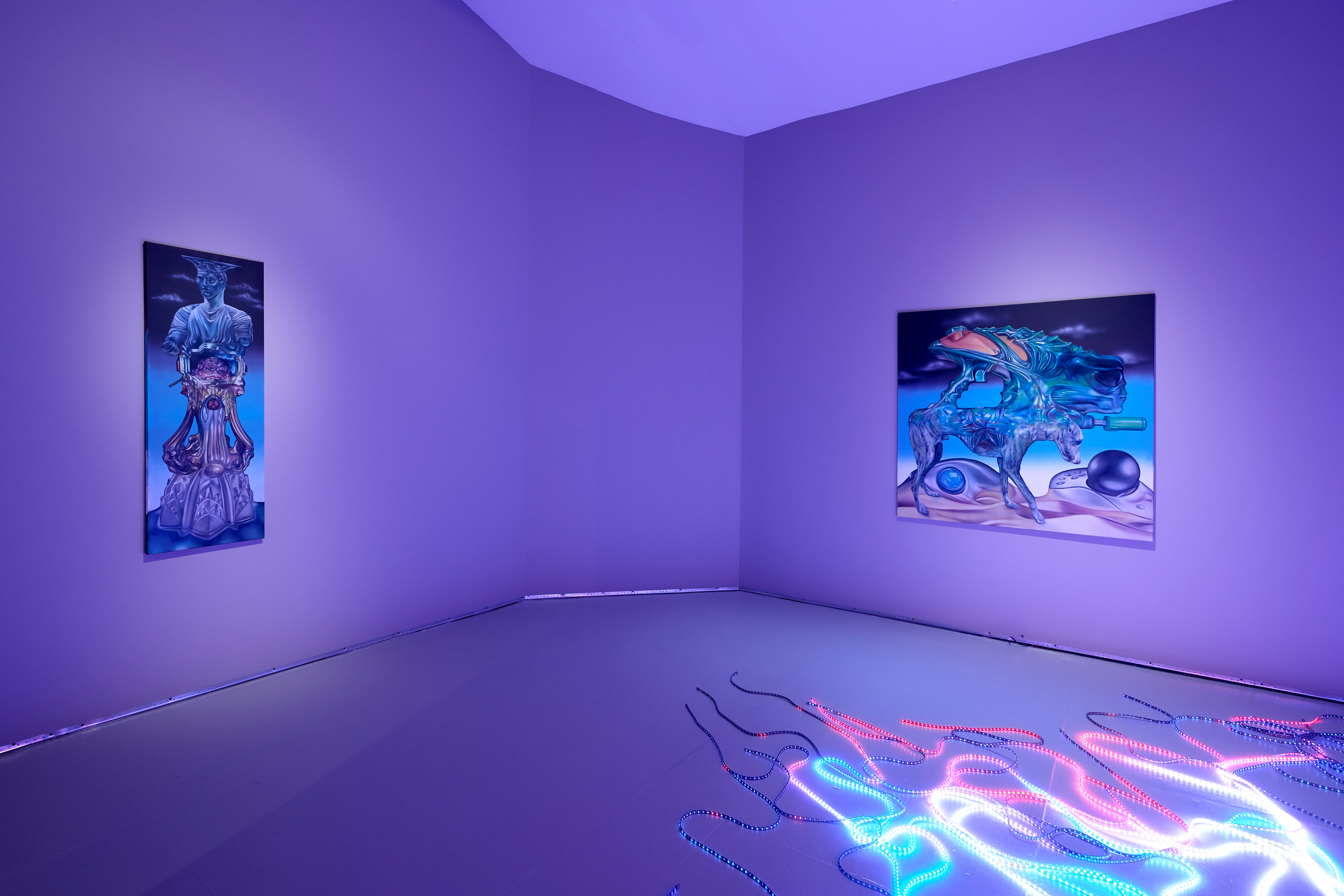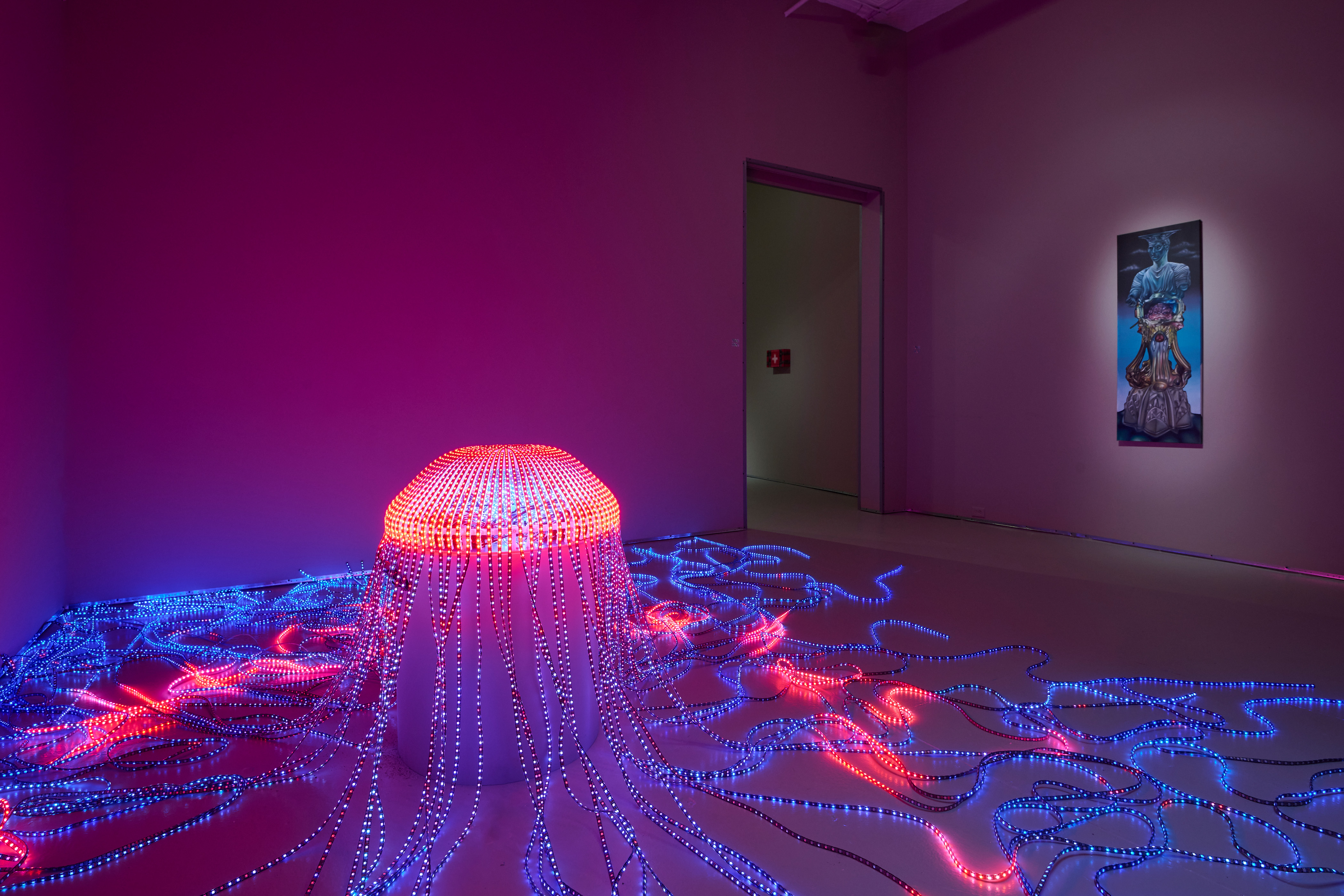 Ksawery Komputery, Bios, 2025, oil paint on wood panels in 3 pieces, interactive light installation / led, 3d print, custom hardware and software, 28 x 12 inches (main structure) + 196 inches (long LED strips), 70 cm x 30 cm + 5 m