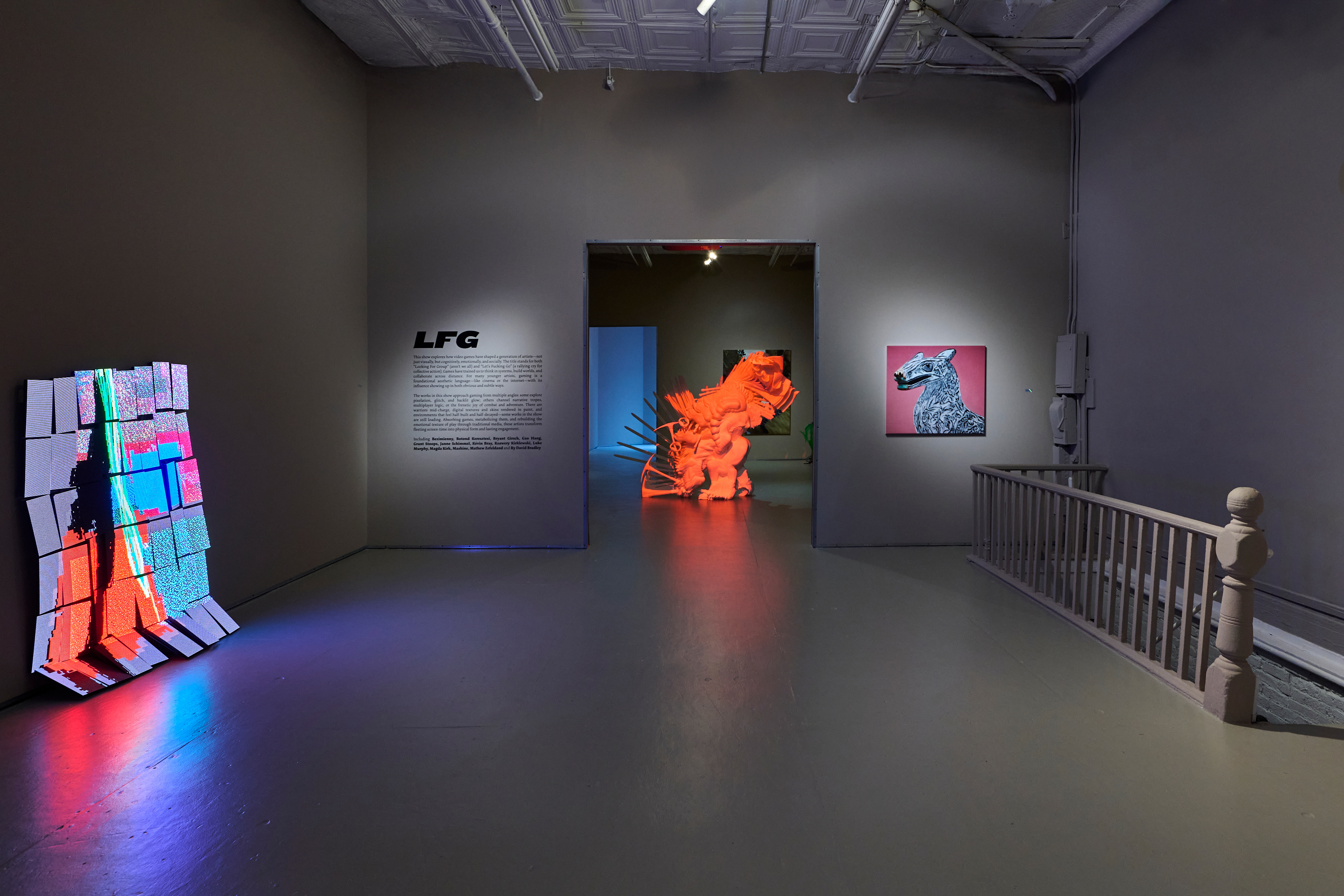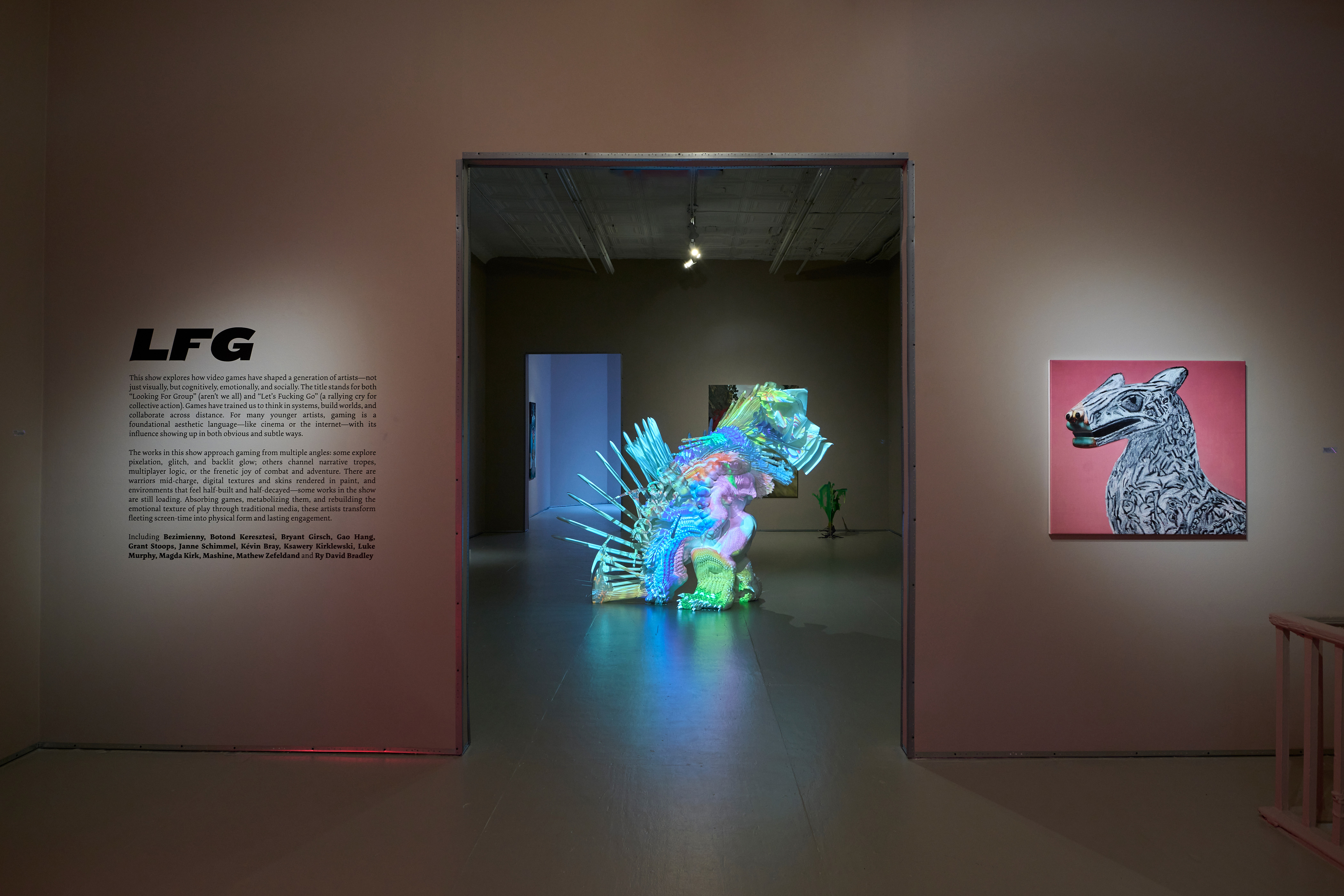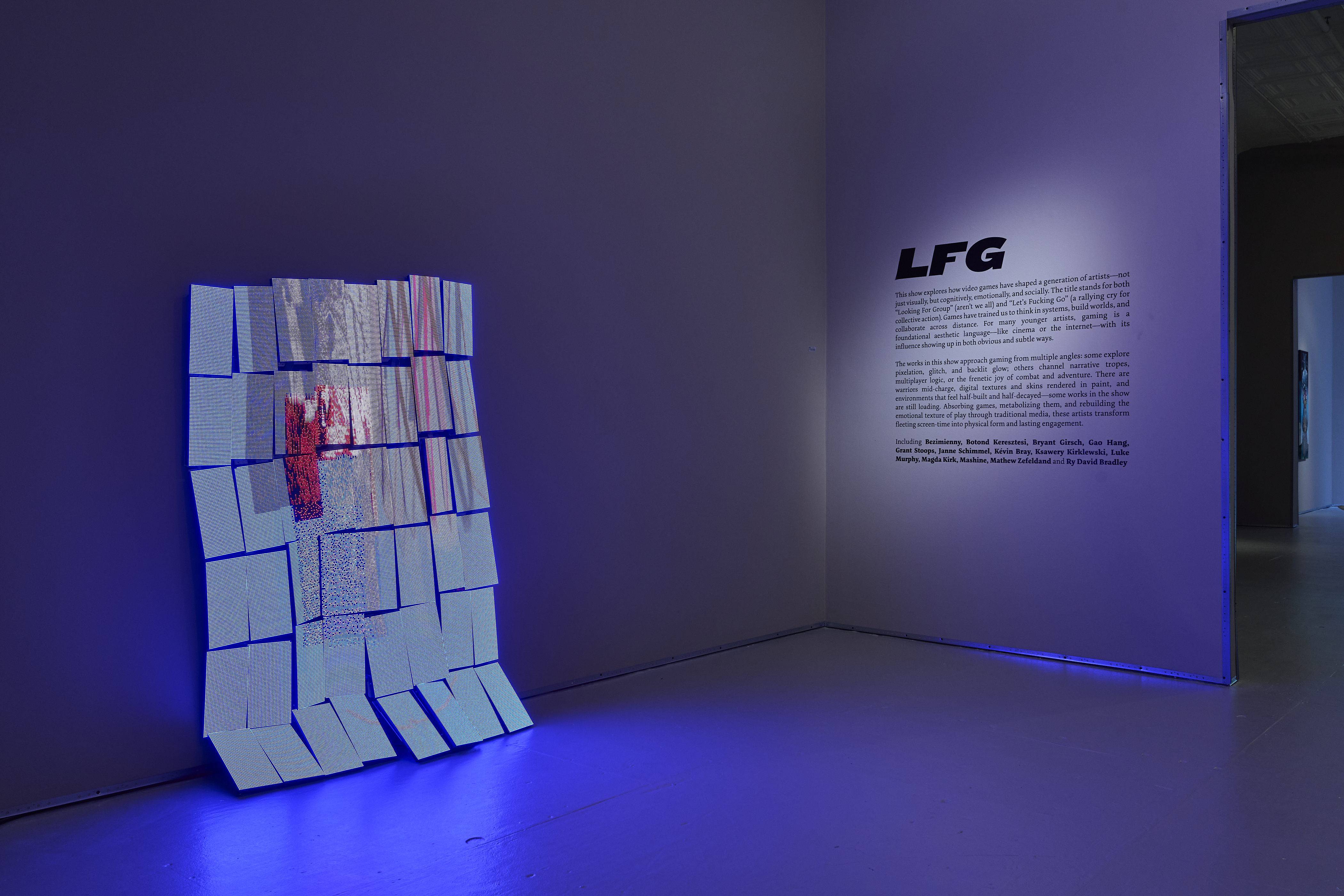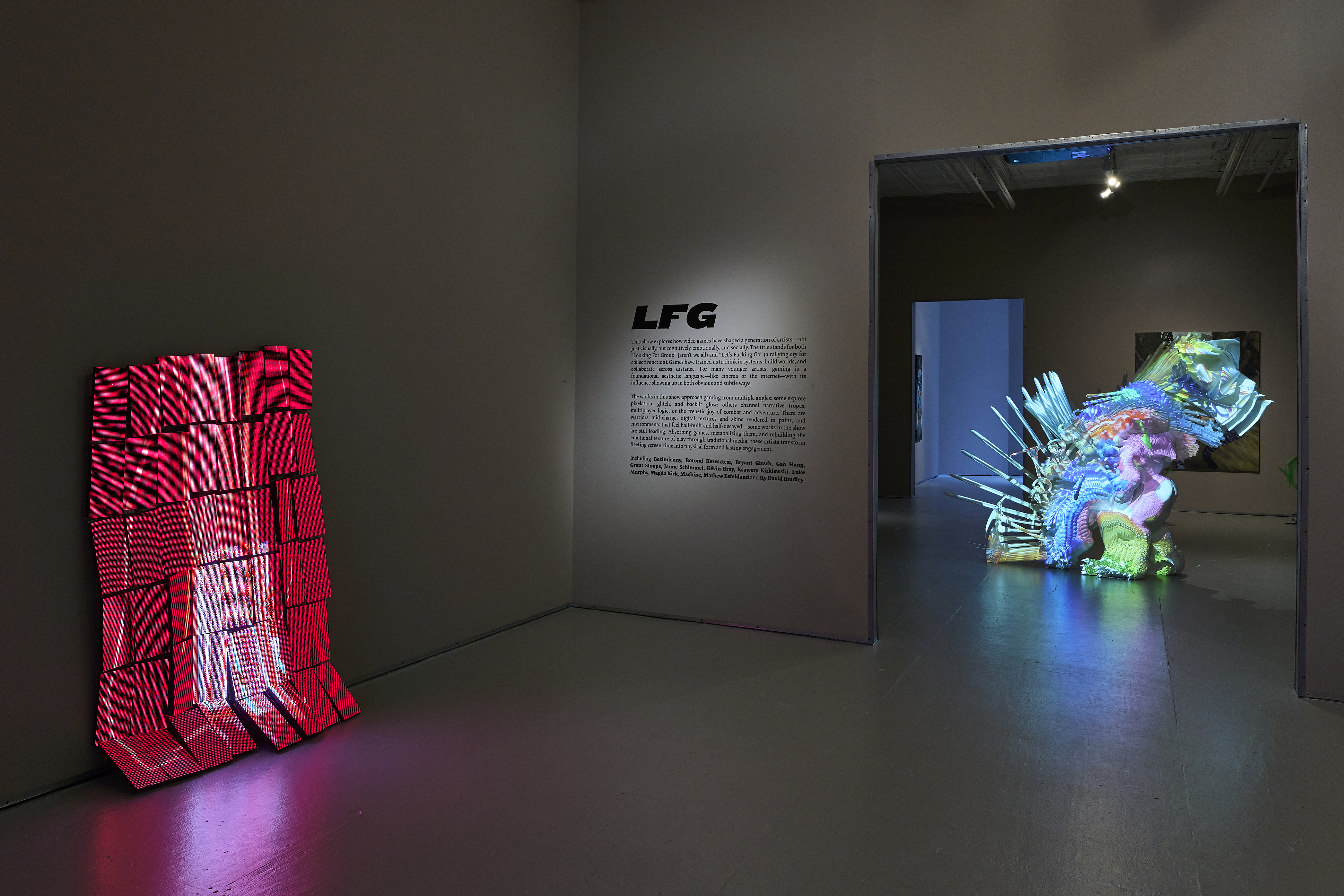 It includes some of the most interesting current art exploring video games’ aesthetics, logic, and cultural impact. “LFG” originated as “Looking For Group” (and aren’t we all?) but these days more often means “Let’s Fucking Go,” the rallying cry of gamers launching a group quest, raid, attack, etc. Multiplayer games, especially RPGs, have made gaming surprisingly social: I had an older brother to play endless hours of Super Mario Kart with in 1992, but years later, coordinating attacks with ten strangers across five continents on a Discord call felt crazy and awesome. Whether storming a dungeon to loot rare armor, healing your tank while dodging area-of-effect fireballs, reviving your squadmate mid-firefight in Call of Duty, dancing on the corpses of your enemies in Fortnite, defending a fortress from Creepers in Minecraft, syncing getaway cars for a casino heist in GTA, or just grinding XP in the desert while getting made fun of—we have found our teams.