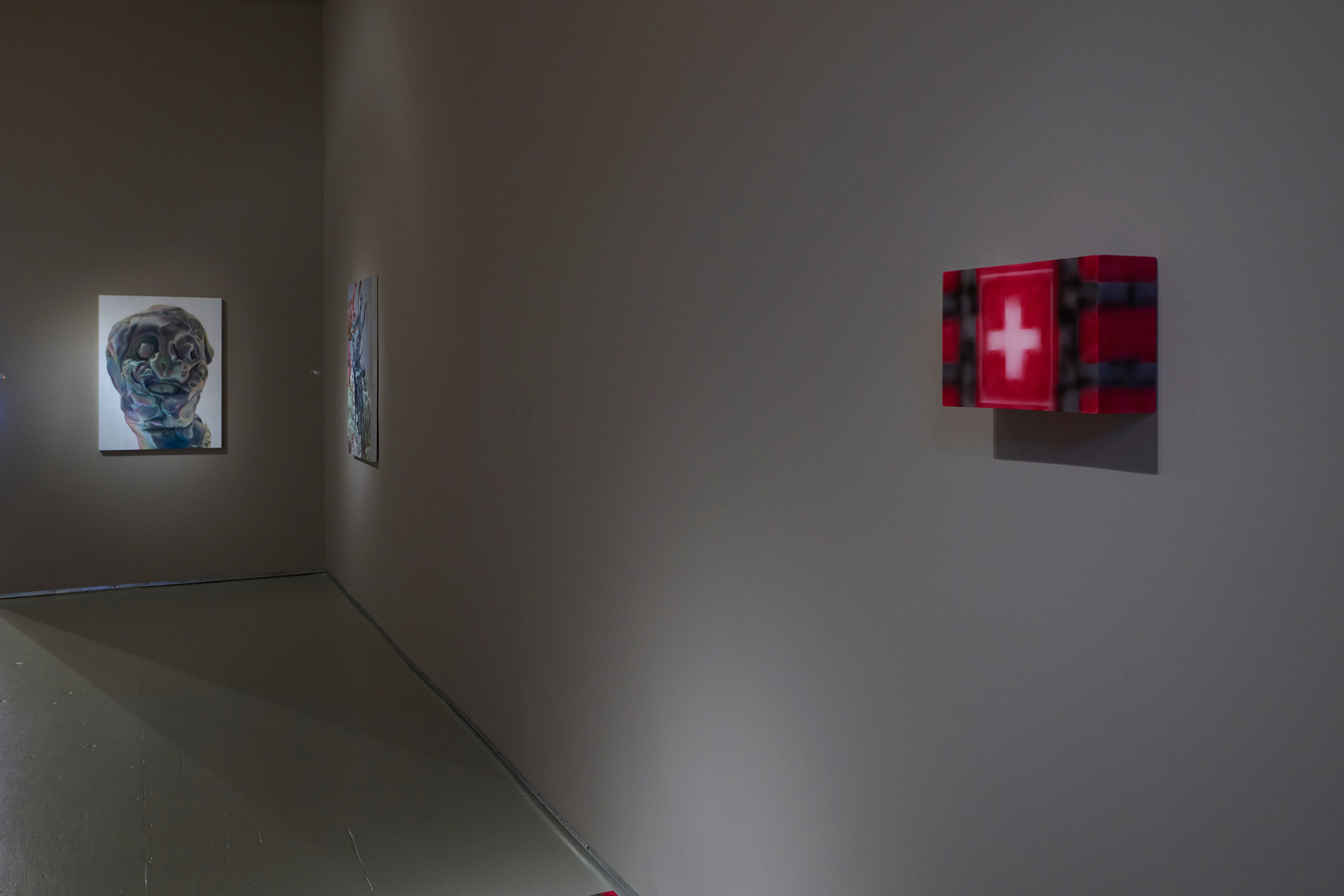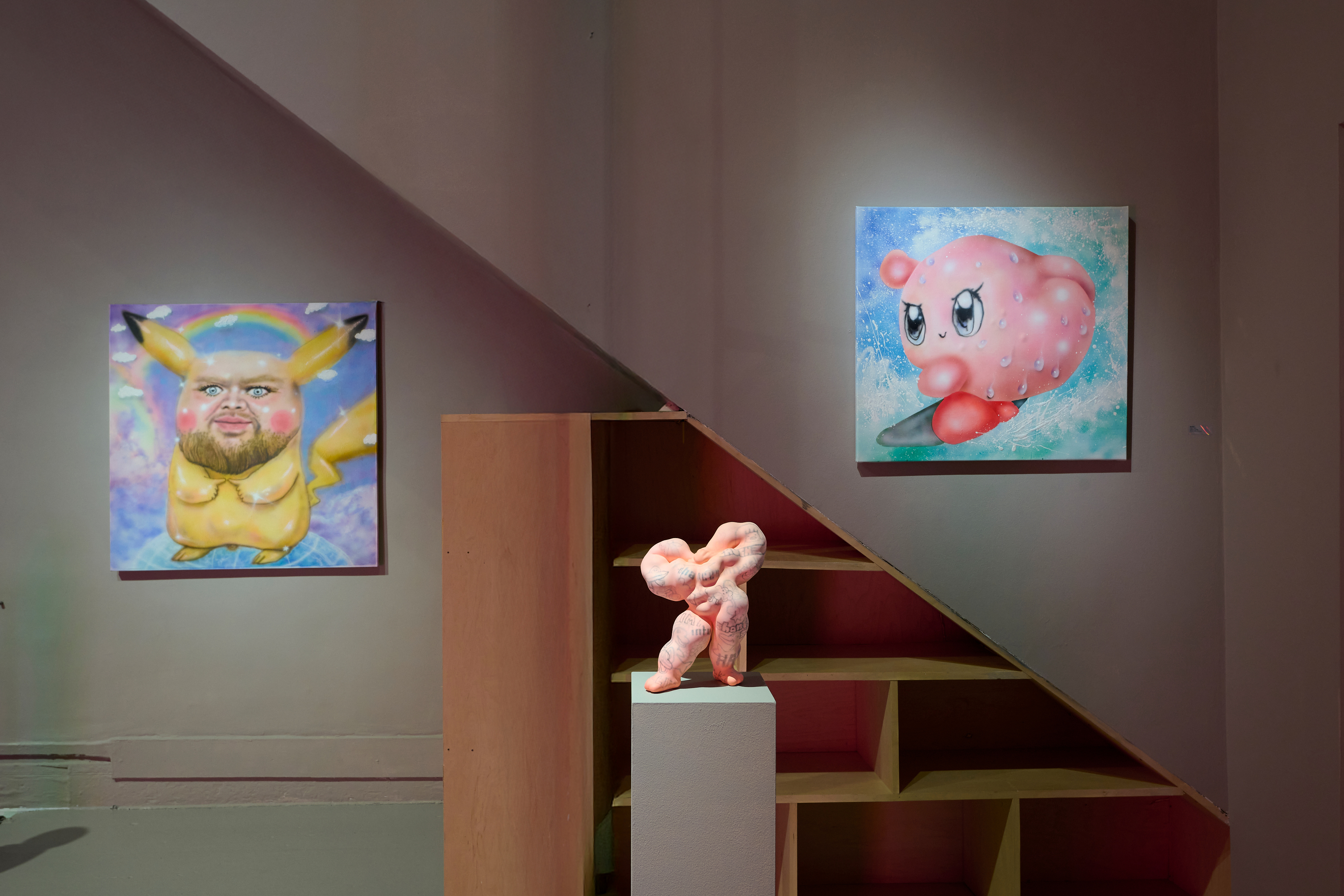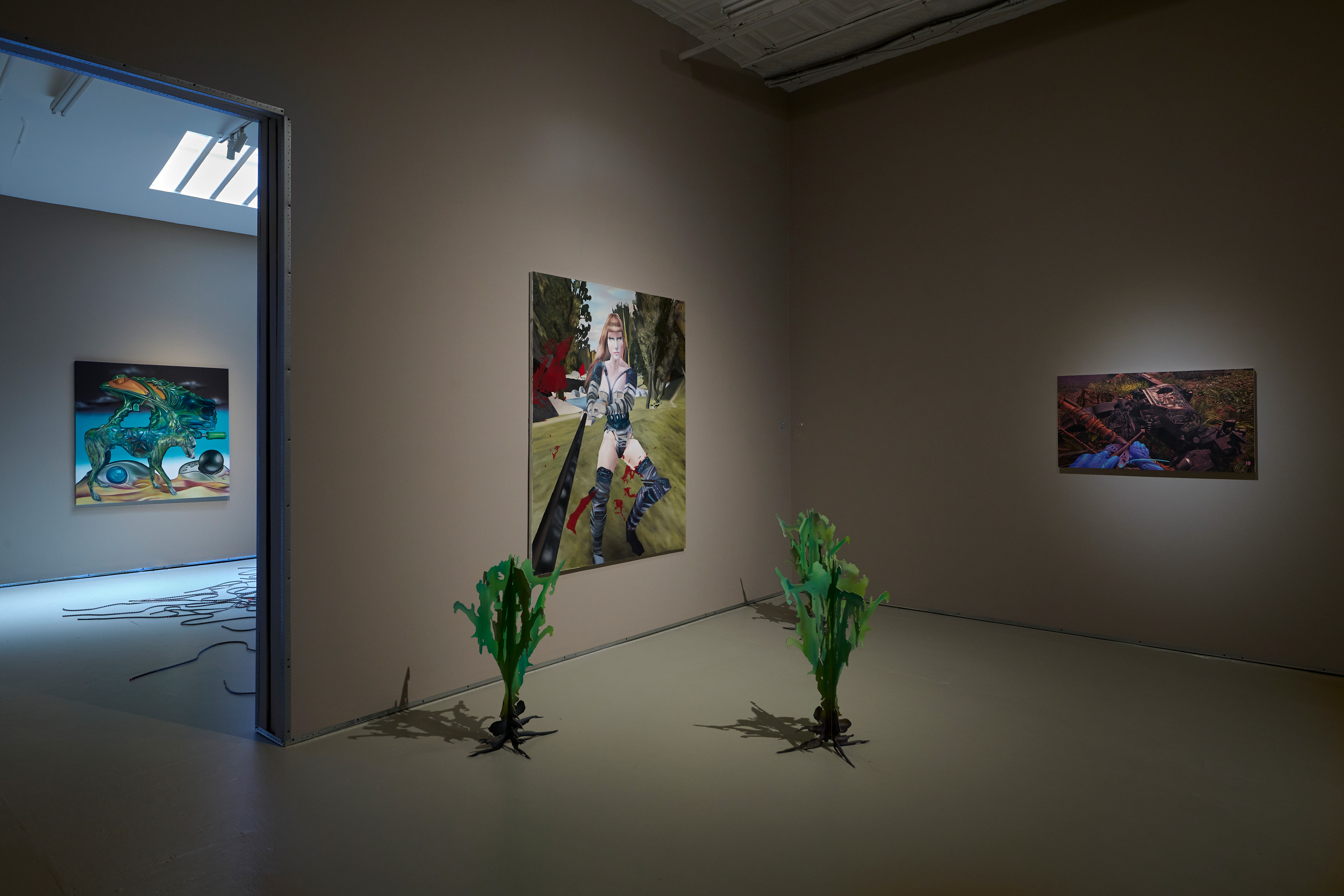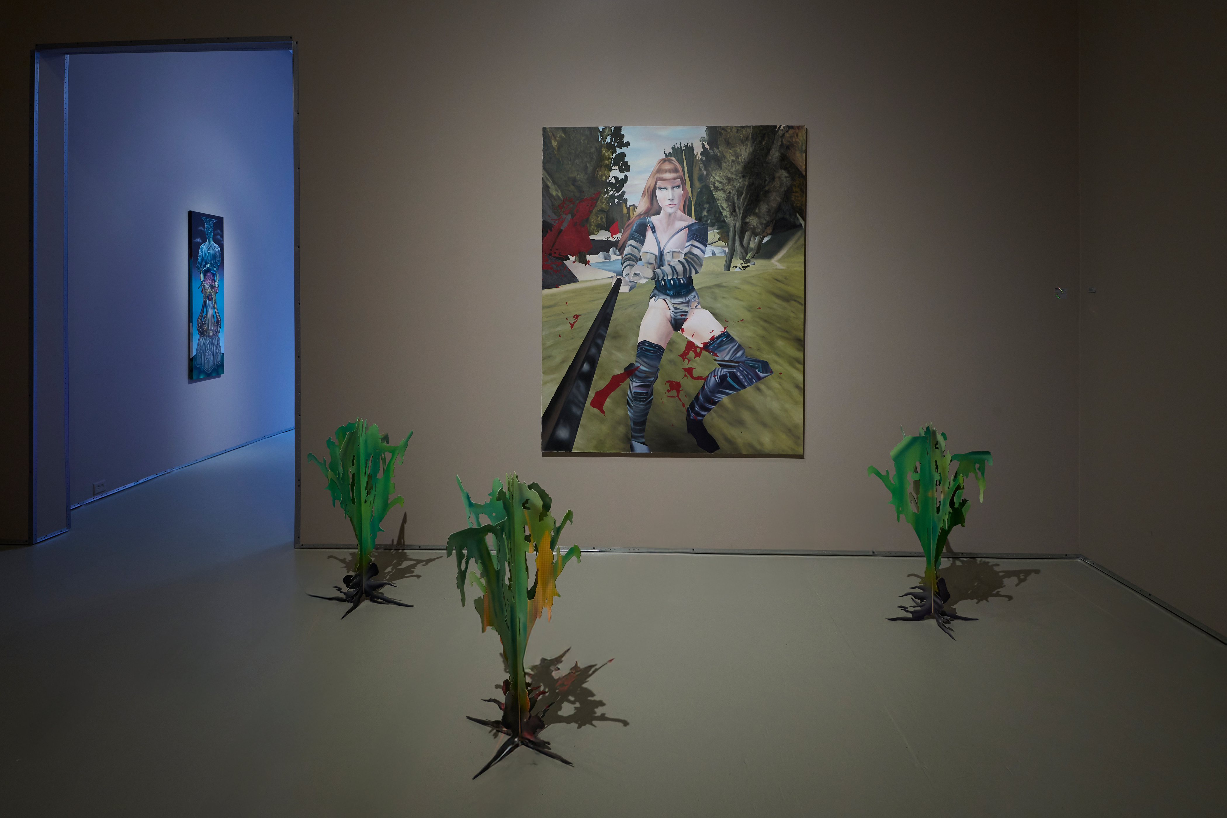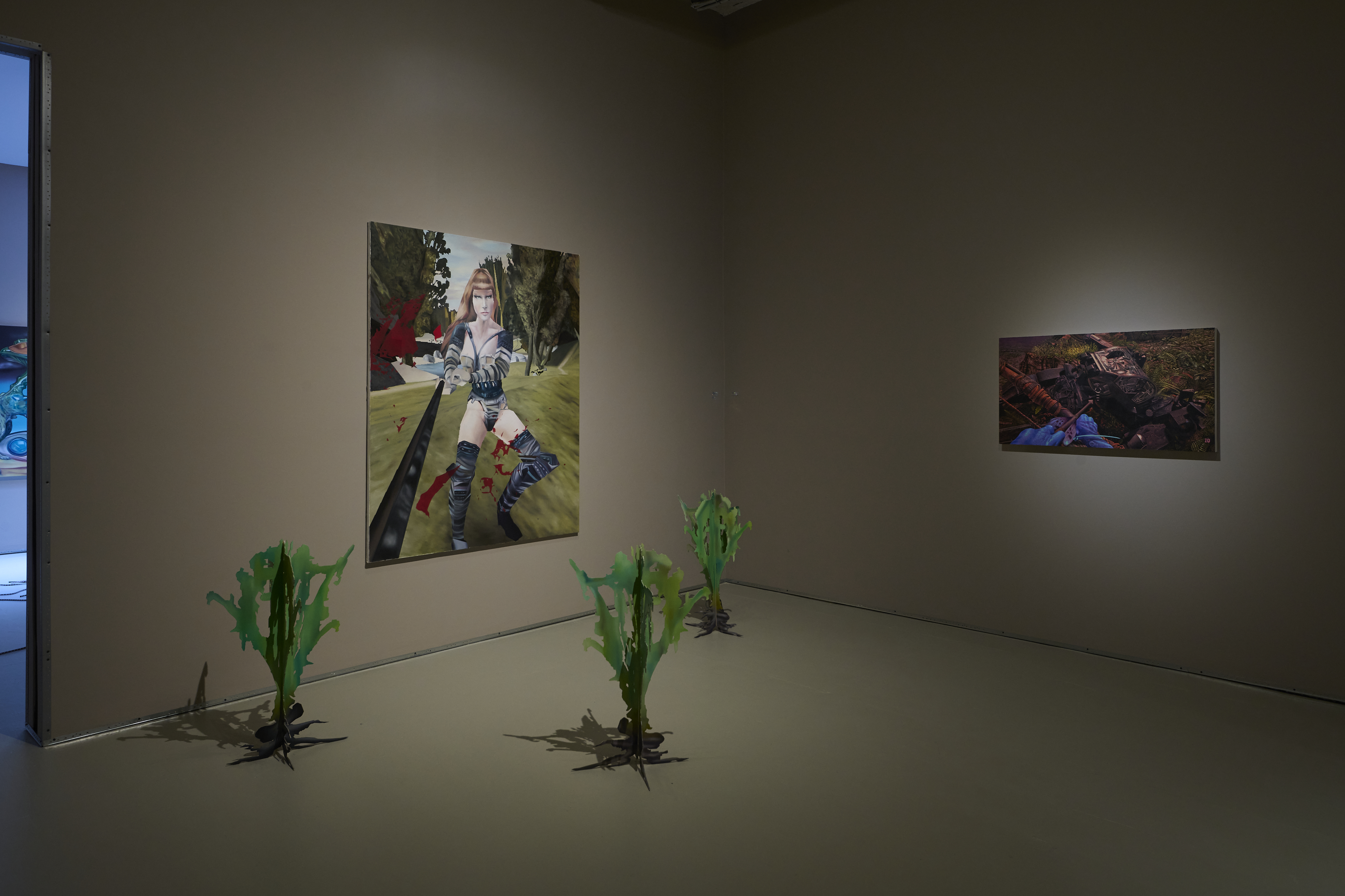 Our war team includes Polish trio Bezimienny, Mathew Zefeldt, Kévin Bray, and a wonderful little Bryant Girsch painting titled Battle Boy, where a medieval-helmed fellow reveals his nipple-ringed bare chest. Probing the contrast between human player and game avatar, Bezimienny paints a warrior princess; Zefeldt’s blue babe wields a bow and arrow at a robot while Kevin’s chimeric beast clangs an axe in endless, fragmented motion. Matching Bezimienny’s sculptural little plants are Gao Hang’s First Aid Kits—a relief to refill your stamina after the battle.