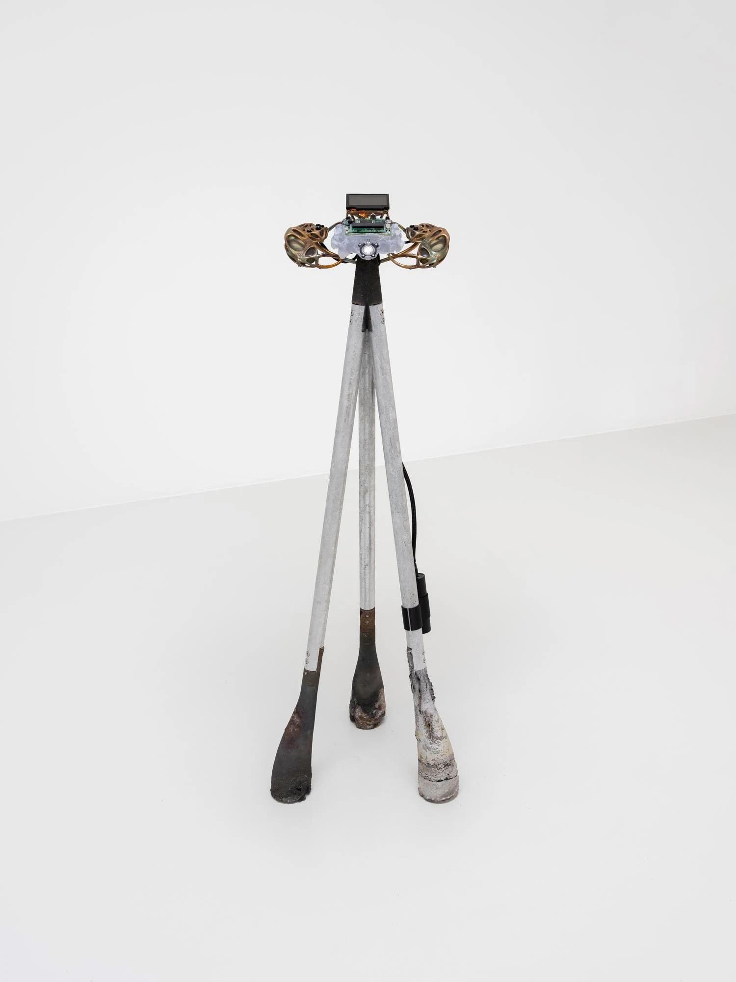 Janne Schimmel, Homebrew Baby 2, 2024, casted aluminum, casted tin, 3d printed resin, gameboy hardware, fabric, various hardware, various gemstones, 42.5 x 12 x 11 inches, 108 x 31 x 28 cm