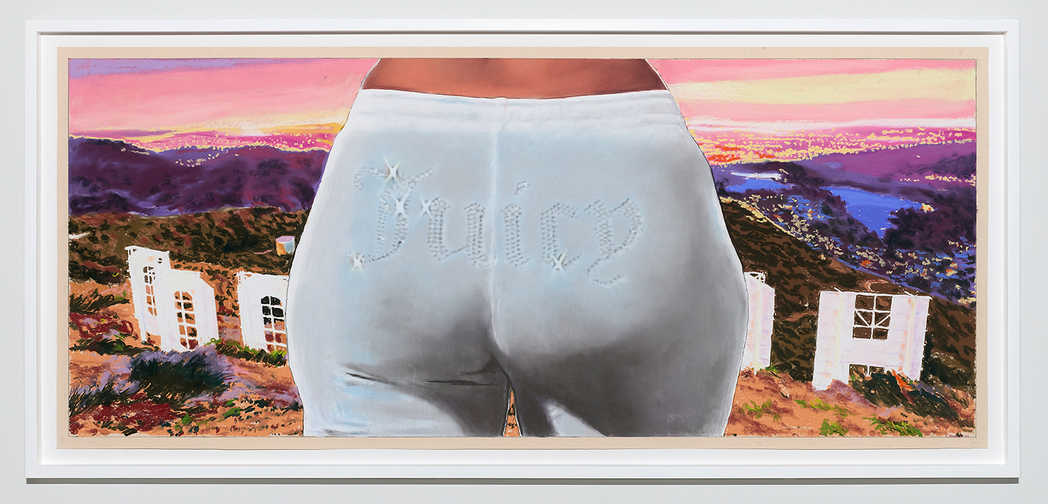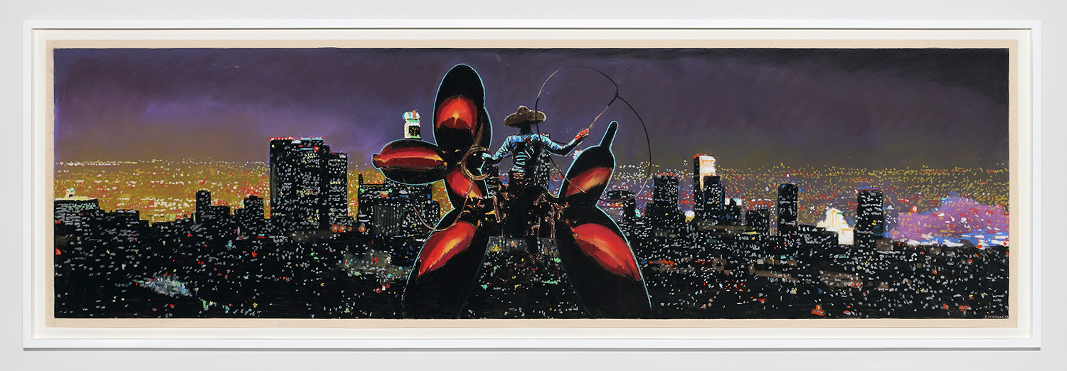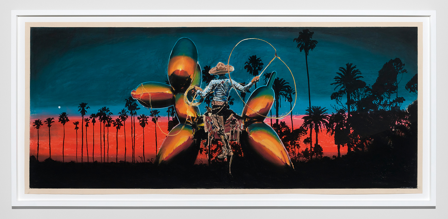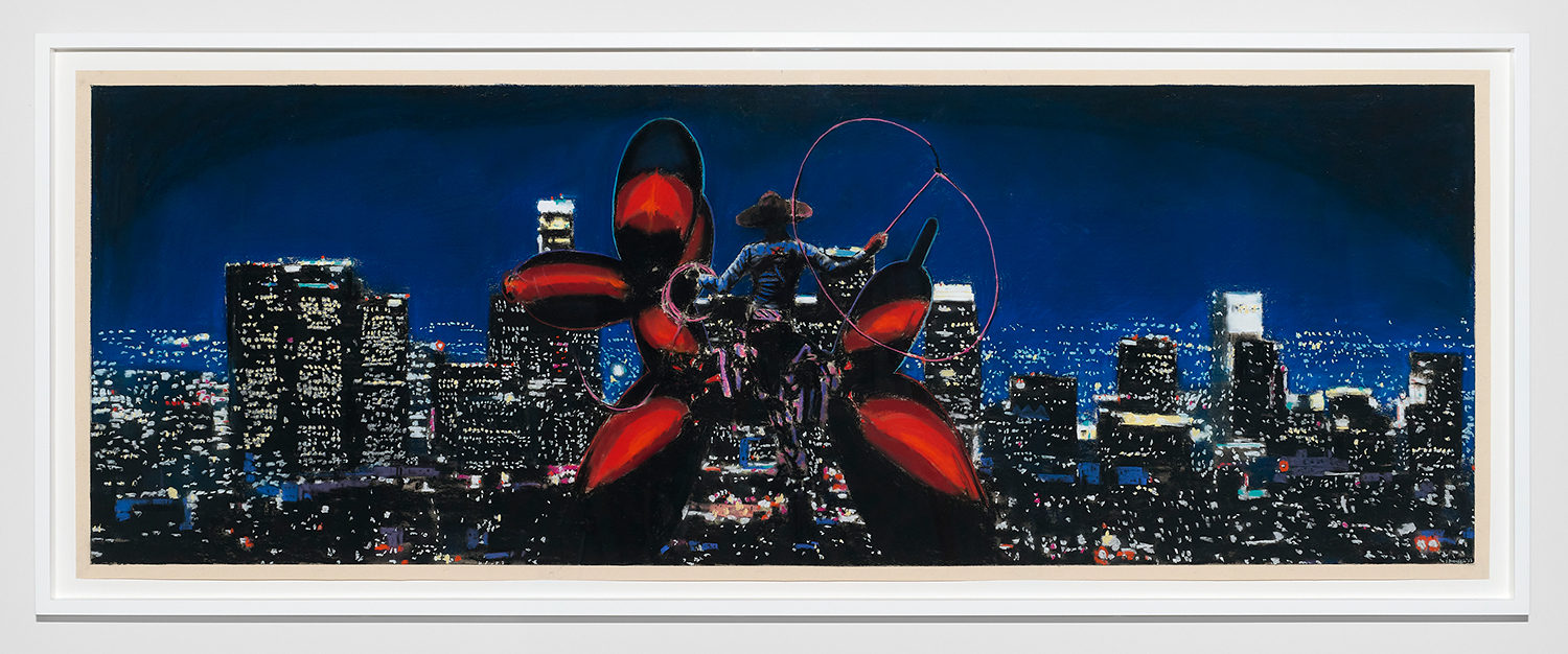Of the nine panoramic landscapes in pastel on sandpaper, four are titled Lost Angeles (Balloon Ride), featuring a vaquero astride a Jeff Koons balloon dog, lasso mid-swing, surveying a dramatic cityscape. In another, Lost Angeles #24, Kobe Bryant’s jersey floats high in an evening sky over the valley. There are boobs under a baby tee and velour-clad Juicy™ butts, center-frame, upstaging the Hollywood sign. These drawings are cinematic and evocative in a way that needs no explanation, but if you were to ask Yahnker about them he might say, “Did you know Los Angeles is short for El Pueblo de Nuestra Señora la Reina de los Ángeles del Río Porciúncula?” or, “There was a time when I myself had sculpted eyebrows and frosted tips.”