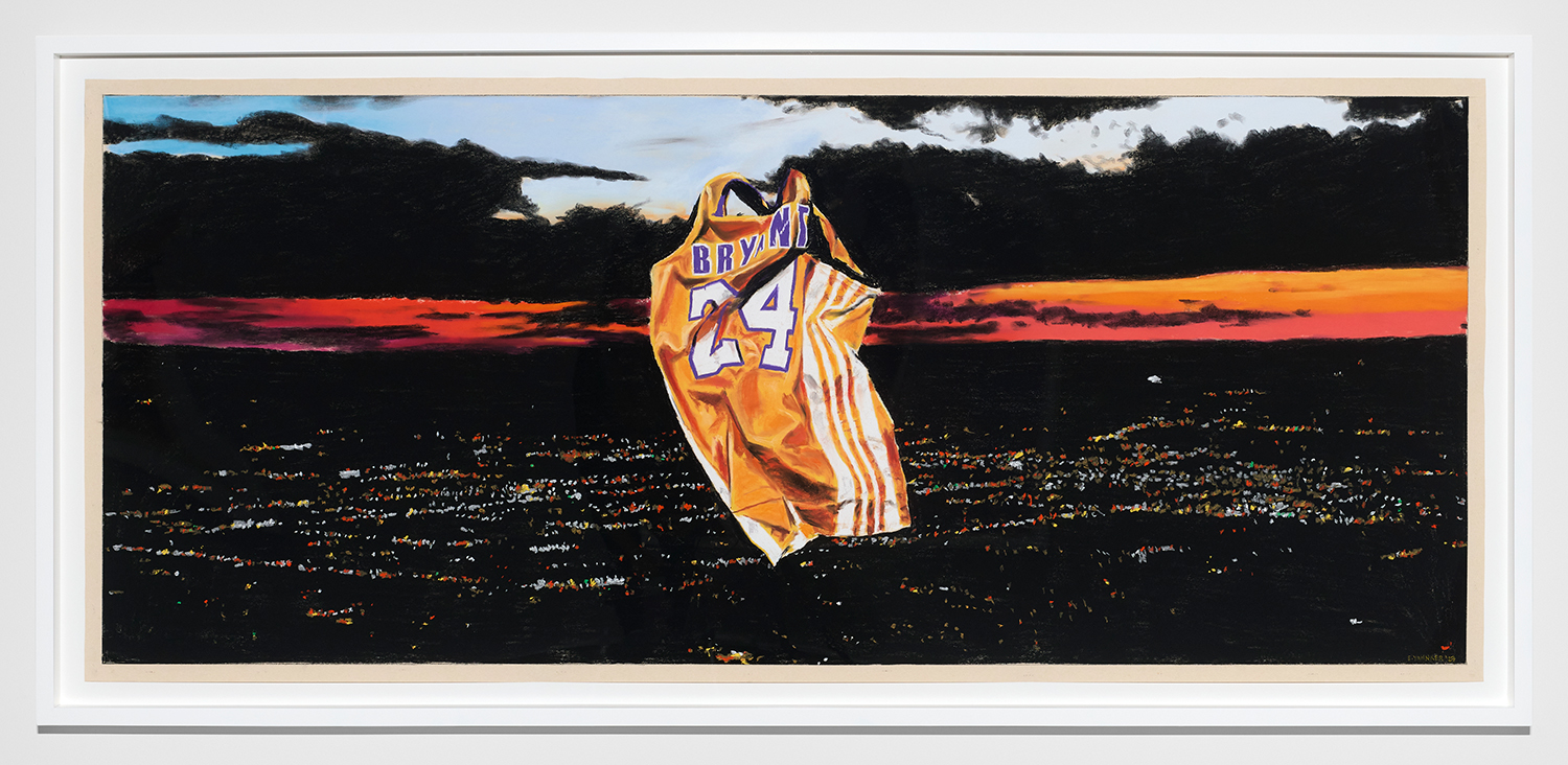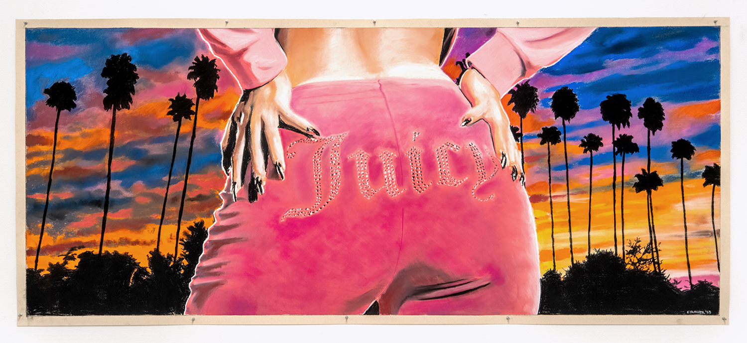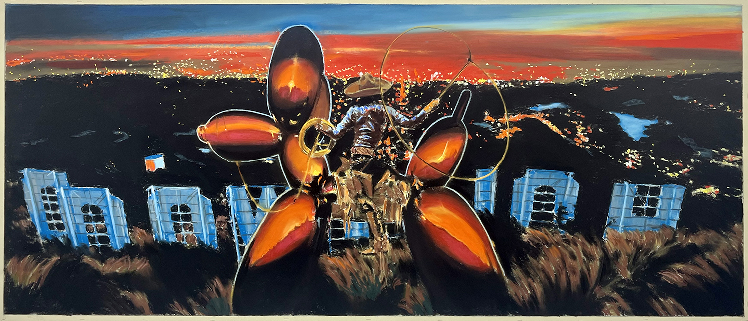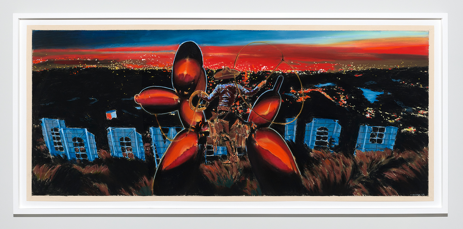 Of the nine panoramic landscapes in pastel on sandpaper, four are titled Lost Angeles (Balloon Ride), featuring a vaquero astride a Jeff Koons balloon dog, lasso mid-swing, surveying a dramatic cityscape. In another, Lost Angeles #24, Kobe Bryant’s jersey floats high in an evening sky over the valley. There are boobs under a baby tee and velour-clad Juicy™ butts, center-frame, upstaging the Hollywood sign. These drawings are cinematic and evocative in a way that needs no explanation, but if you were to ask Yahnker about them he might say, “Did you know Los Angeles is short for El Pueblo de Nuestra Señora la Reina de los Ángeles del Río Porciúncula?” or, “There was a time when I myself had sculpted eyebrows and frosted tips.”