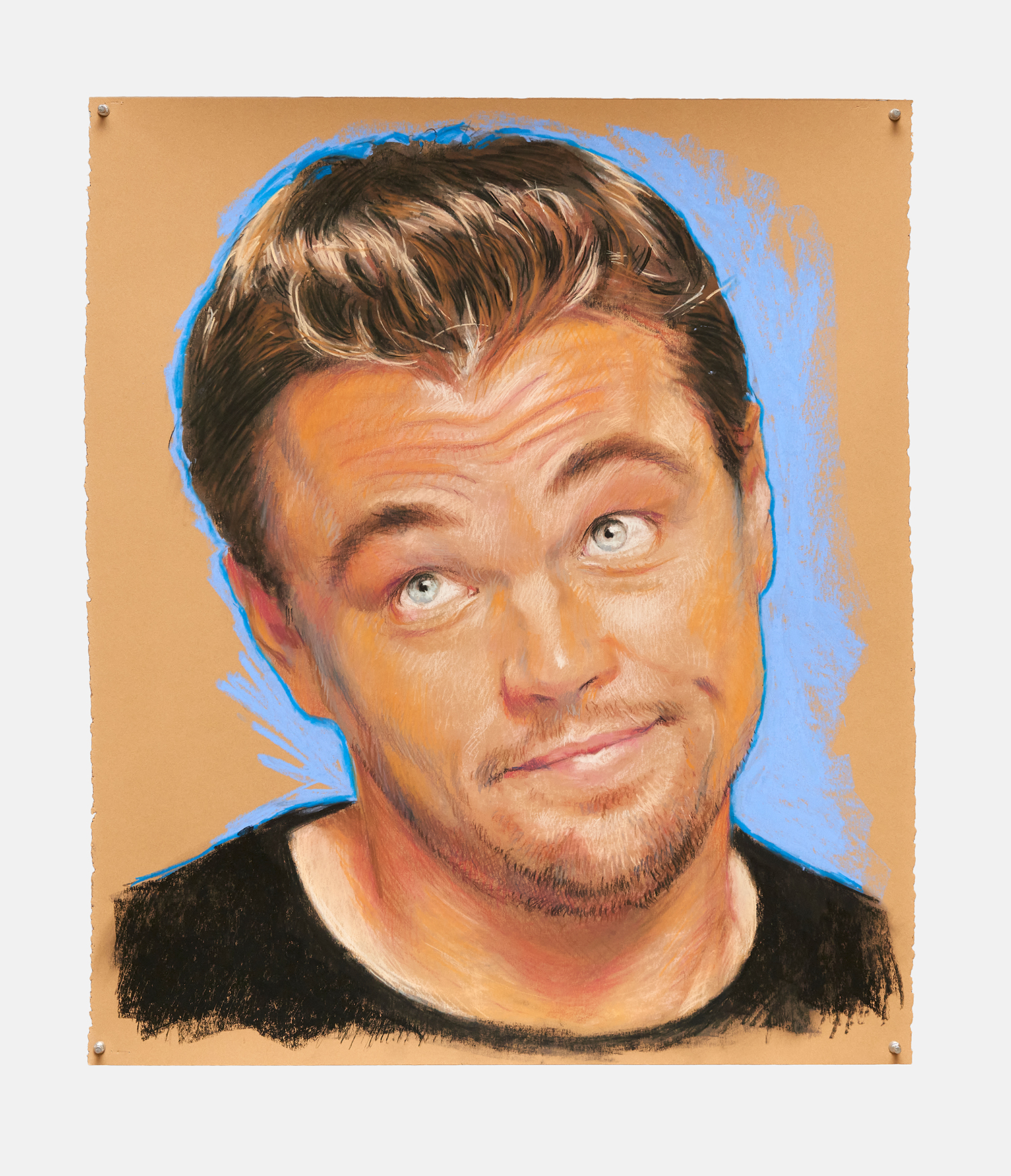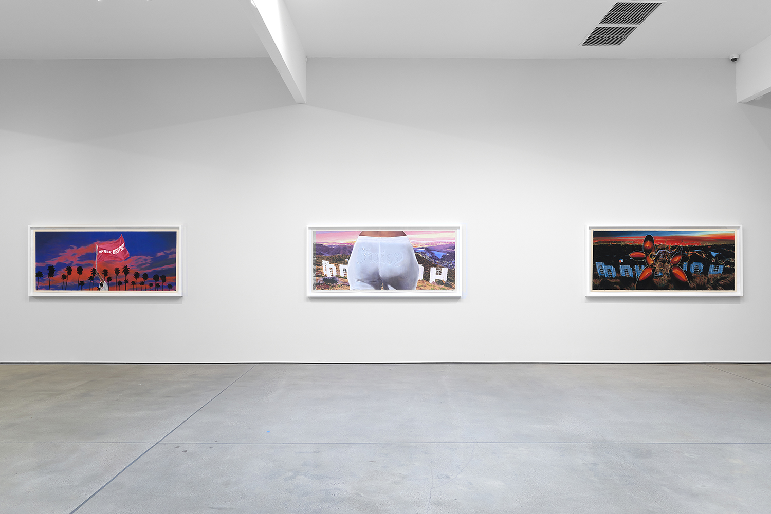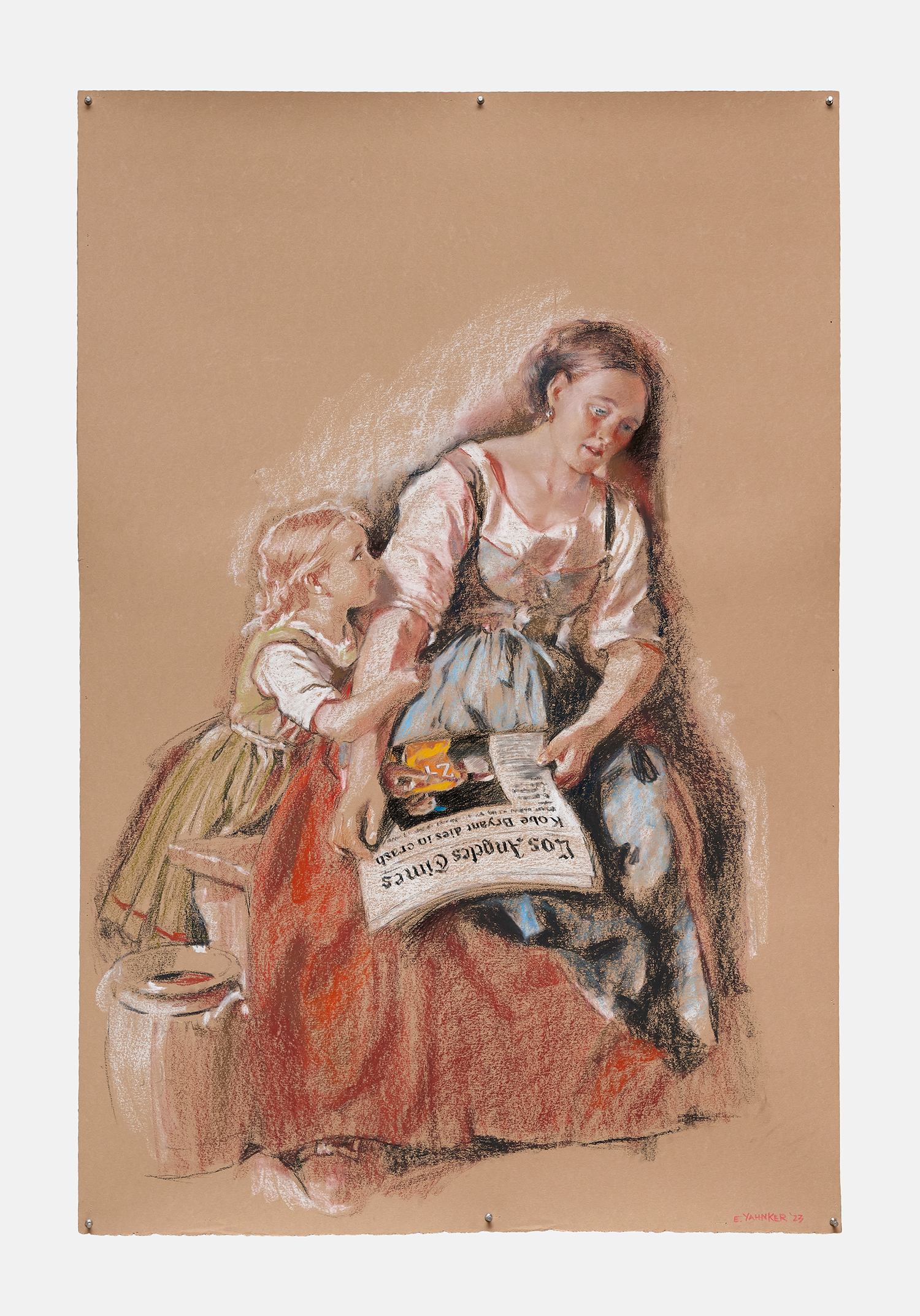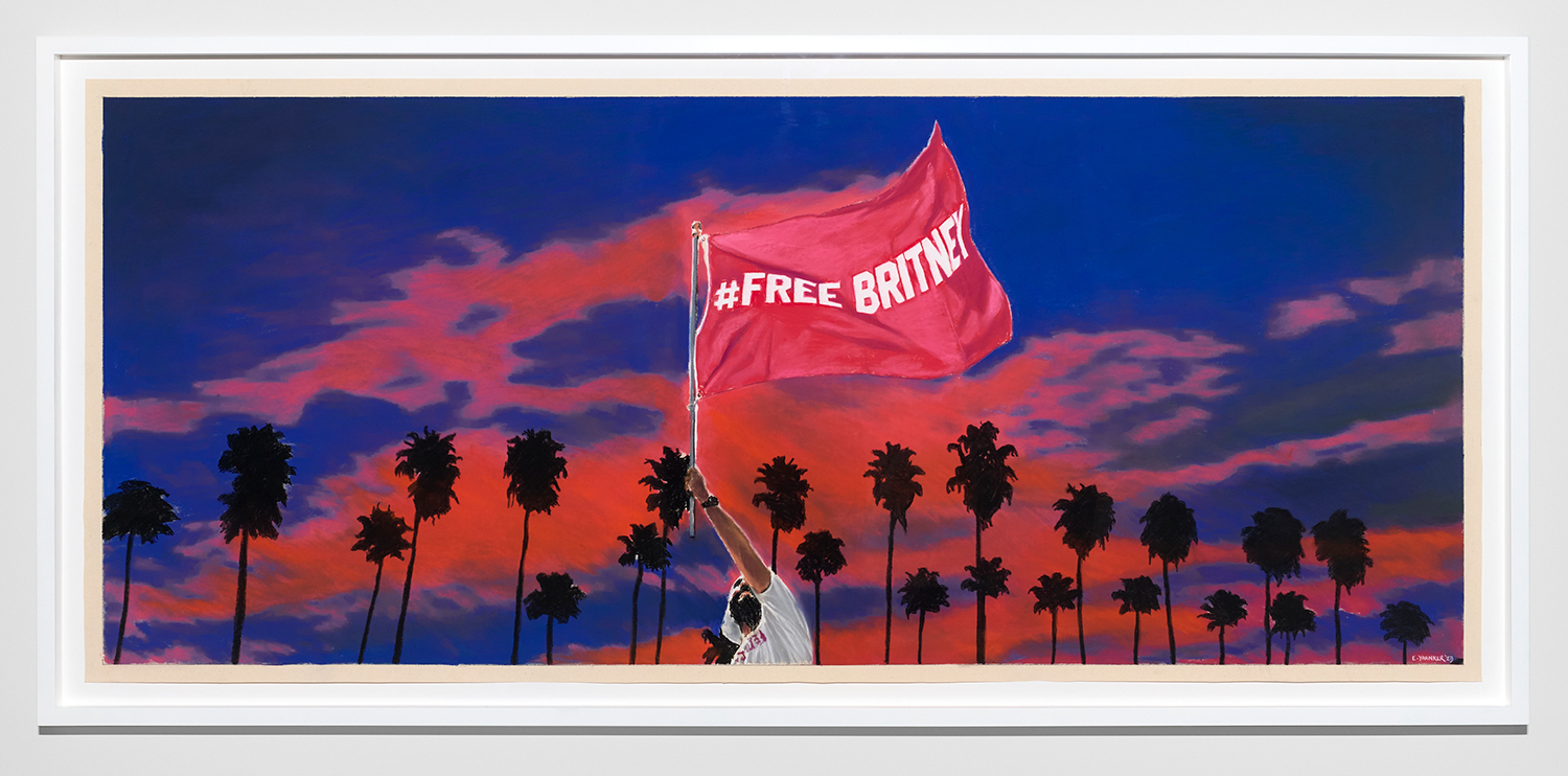 Of the nine panoramic landscapes in pastel on sandpaper, four are titled Lost Angeles (Balloon Ride), featuring a vaquero astride a Jeff Koons balloon dog, lasso mid-swing, surveying a dramatic cityscape. In another, Lost Angeles #24, Kobe Bryant’s jersey floats high in an evening sky over the valley. There are boobs under a baby tee and velour-clad Juicy™ butts, center-frame, upstaging the Hollywood sign. These drawings are cinematic and evocative in a way that needs no explanation, but if you were to ask Yahnker about them he might say, “Did you know Los Angeles is short for El Pueblo de Nuestra Señora la Reina de los Ángeles del Río Porciúncula?” or, “There was a time when I myself had sculpted eyebrows and frosted tips.”