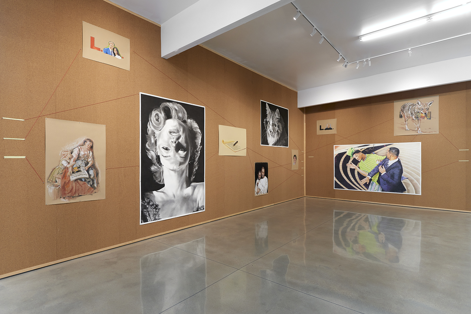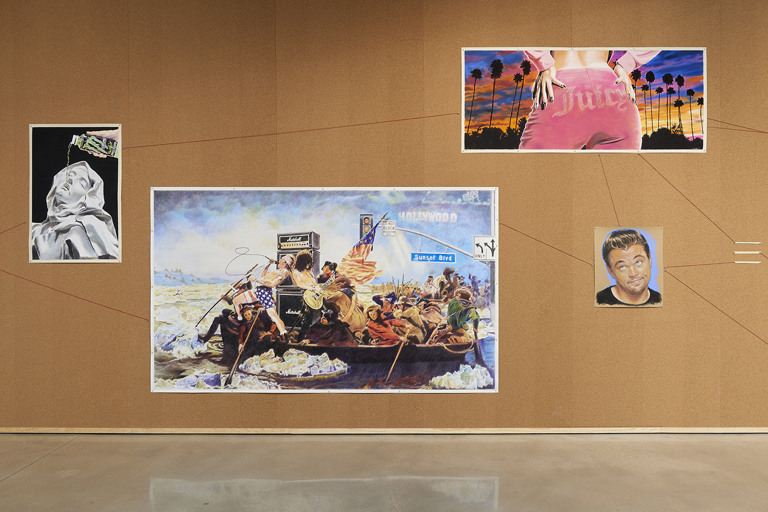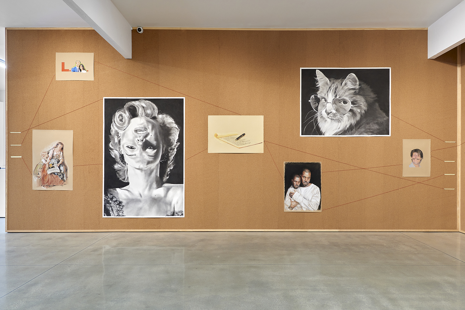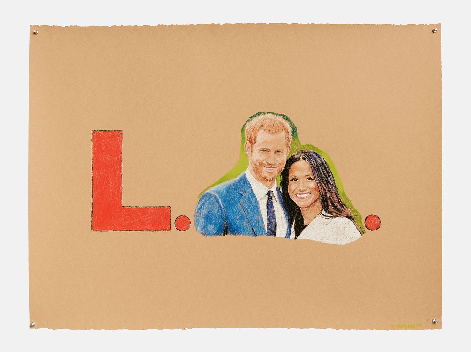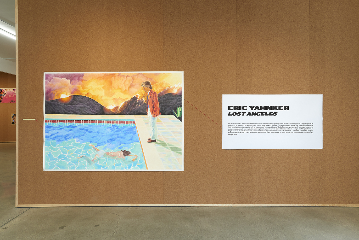 The Hole is excited to announce our fifth solo exhibition of new works by Sky Valley–based artist Eric Yahnker (b. 1976). Yahnker lived in Los Angeles for 40 years until, in what he calls a “reverse David Hockney,” he moved away to gain some perspective. In a corkboard-covered front room he pins up in paranoiac style an assortment of interrelated images. These 26 drawings and two video works in Lost Angeles are about getting lost, mourning loss, and completely losing it in LA.