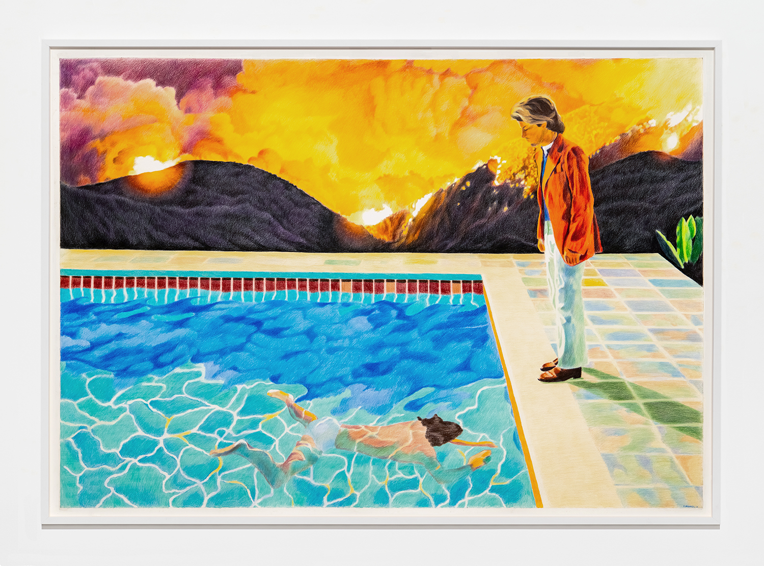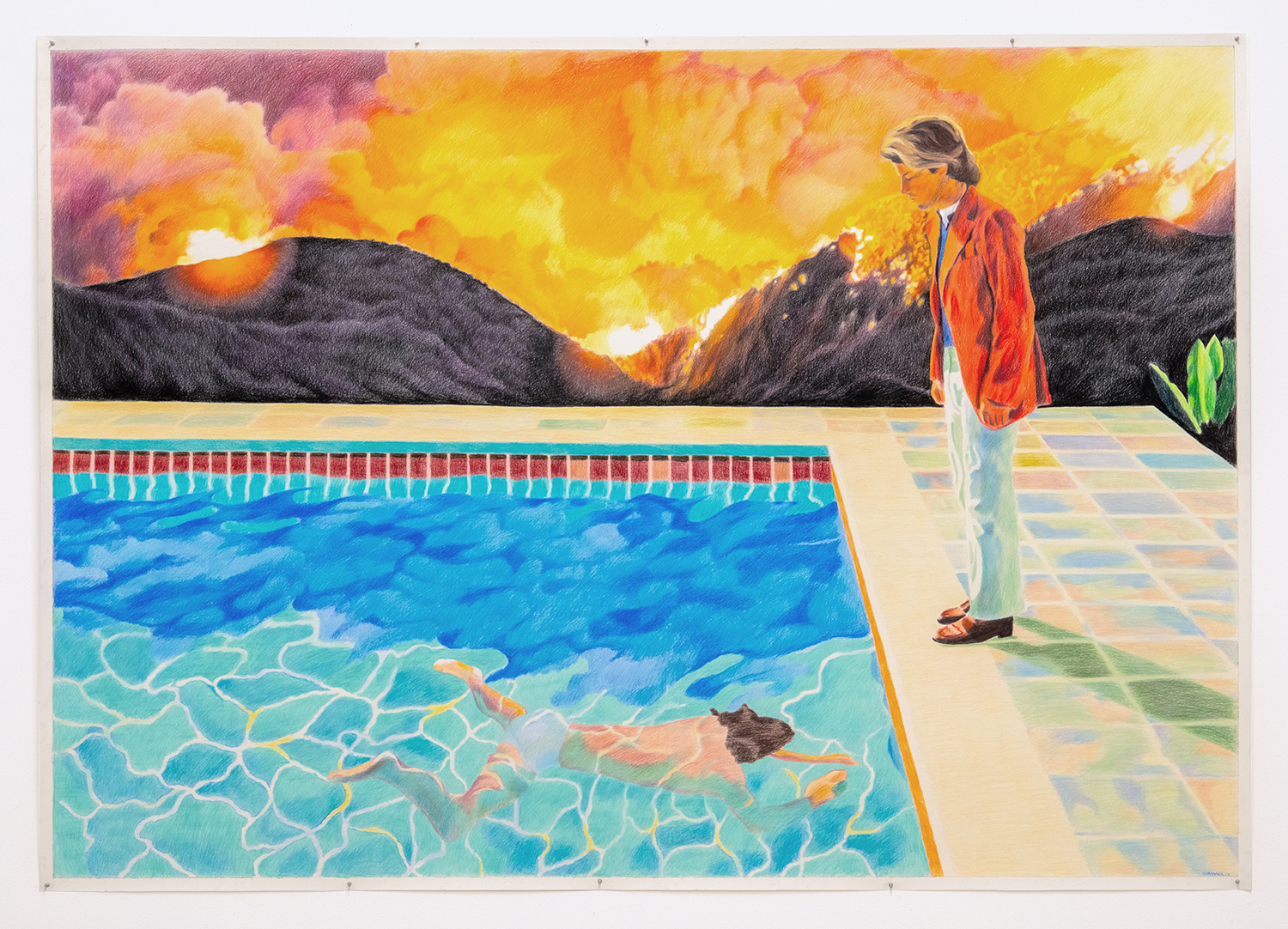 Pool With Two Figures, 2023, Colored pencil on paper, 65 x 92 inches, 165 x 234 cm.