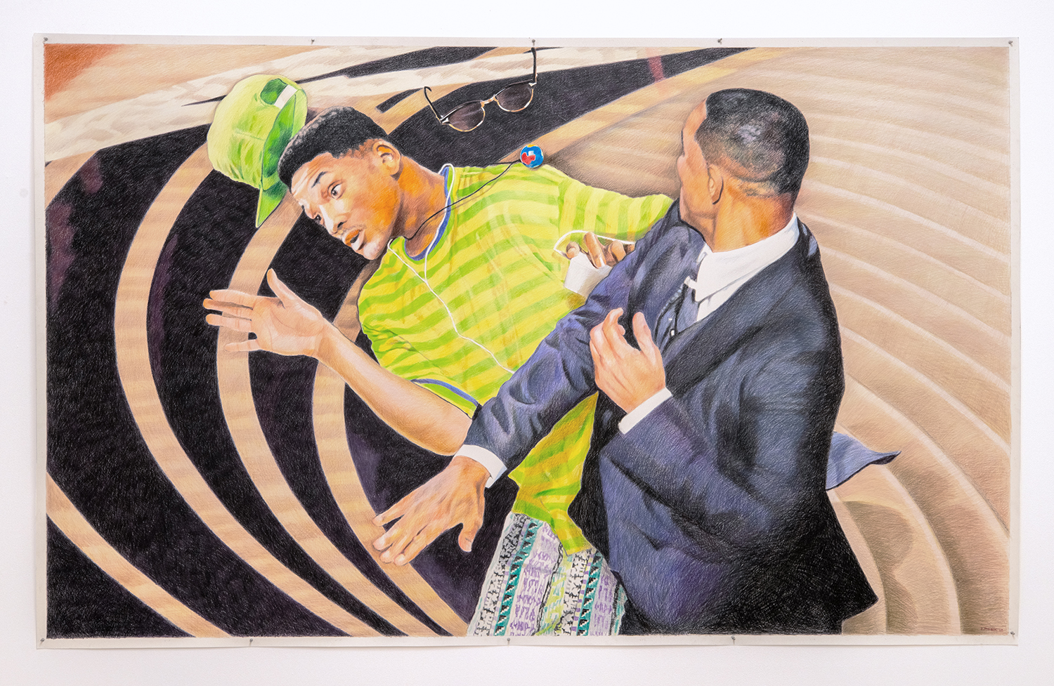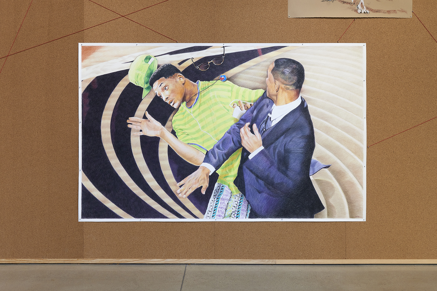 Of Self Flagellation, featuring Will Smith: “Something happened that night that was so internal and at the same time so universal, the difference being that our own Beelzebubs don’t escape on stage at the Oscars.” And, although this exhibition depicts public figures, “they are stand-ins for my own madness, loneliness and grief. Fairly or unfairly, things I’m too insecure to share get grafted onto these subjects. They are my outlet to hide in, but in truth, all the warts, bruises and masks they wear are my own.”