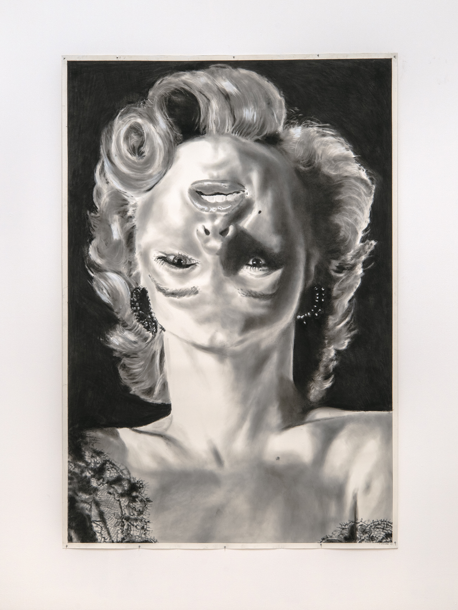 Upside Marilyn, 2023, Charcoal and graphite on paper, 96 x 65 inches, 244 x 165 cm.