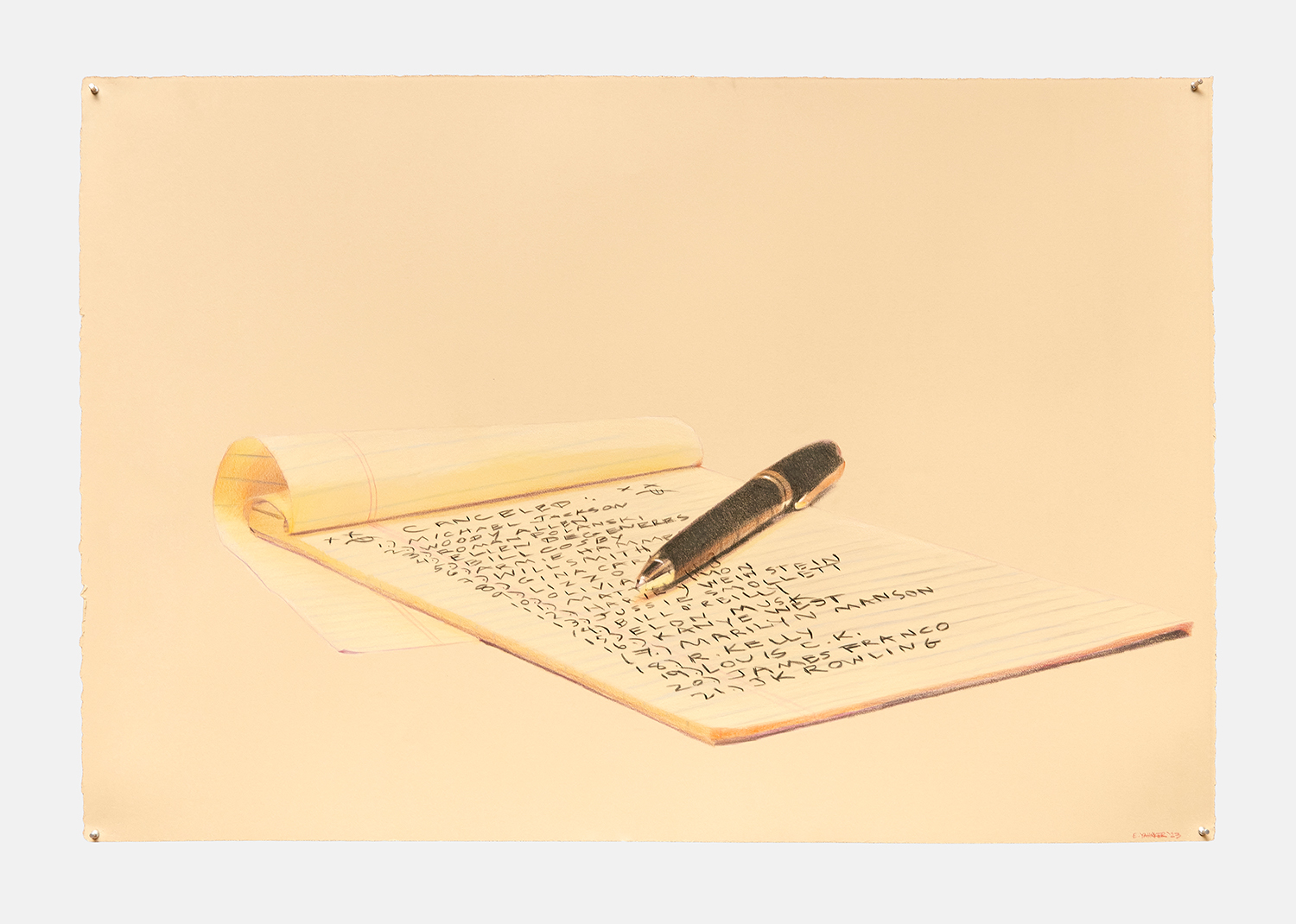Eric Yahnker (b. 1976, Torrance, CA) works primarily in large-scale drawings. After studying journalism at USC, Yahnker received a BFA in animation from California Institute of the Arts. Since 2008, Yahnker has had solo exhibitions at The Hole in New York, Kim Light, Ambach & Rice, and Zevitas Marcus in Los Angeles, Paradise Row in London and Jeanroch Dard in Paris. His first museum solo exhibition, The Long Goodbye, took place at CAM Raleigh in North Carolina. His work has been reviewed in The New York Times, New York Magazine, W Magazine, i-D, and Artforum.com, among others.