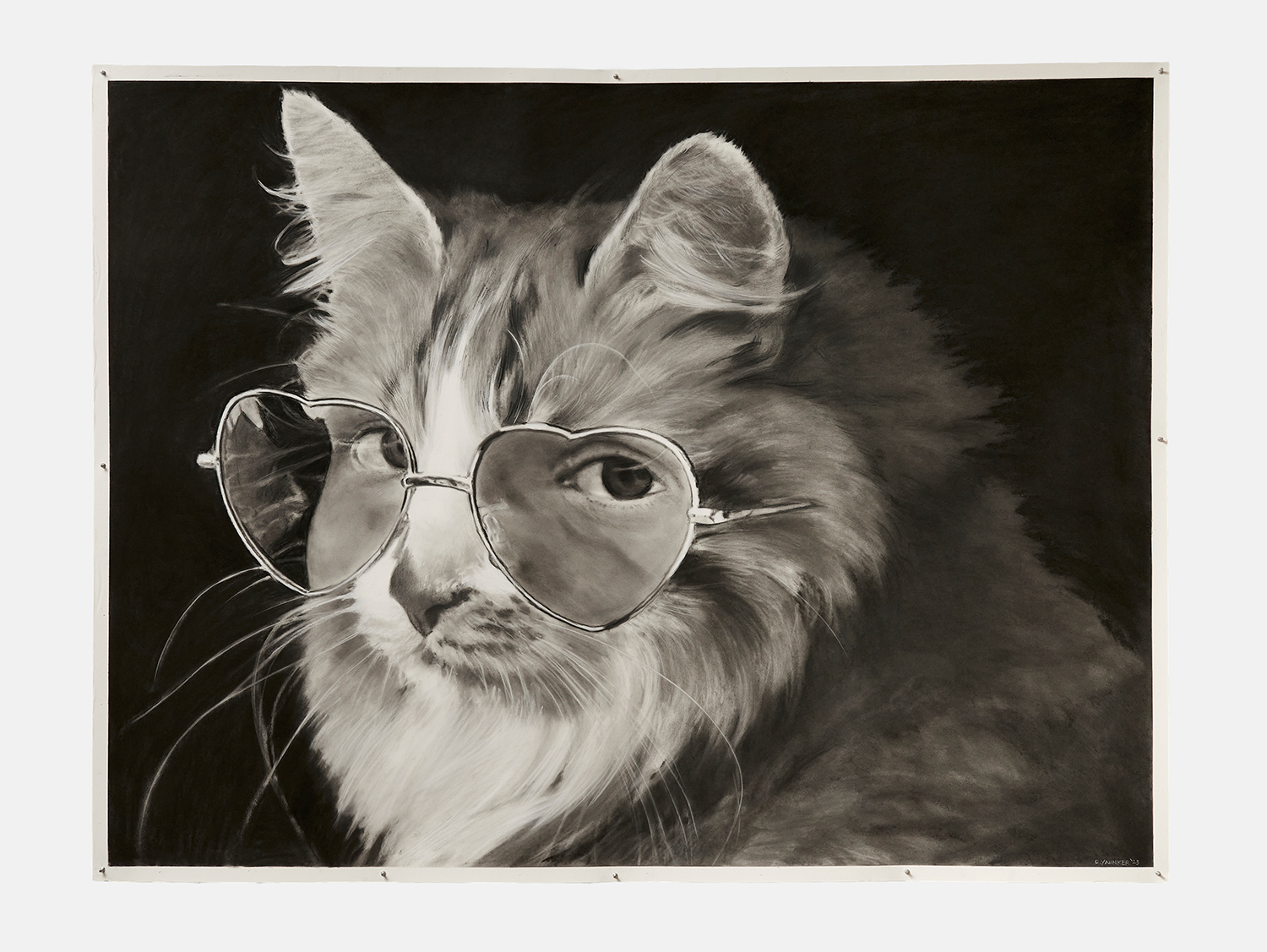 Nearsighted Cat, 2023, Charcoal and graphite on paper, 55 x 72 inches, 140 x 183 cm.