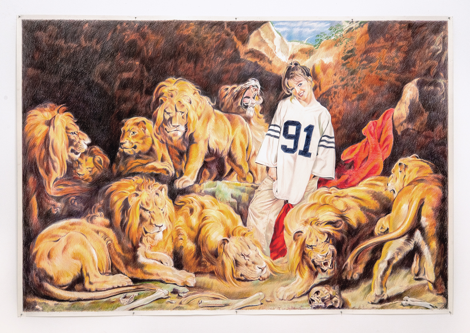 Britney in the Lion's Den, 2023, Colored pencil on paper, 66.5 x 96.5 inches, 169 x 245 cm.