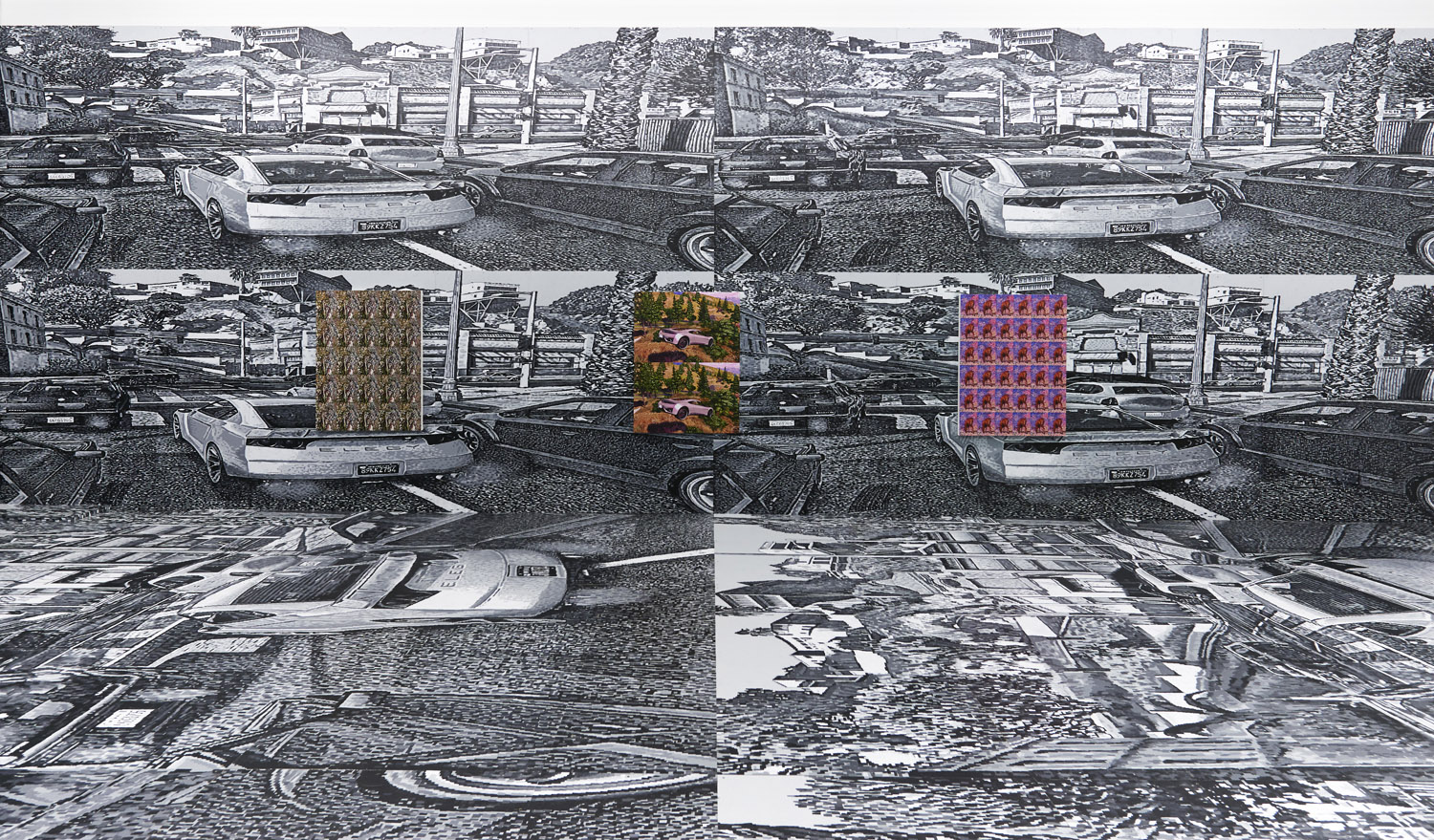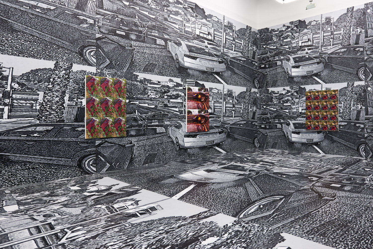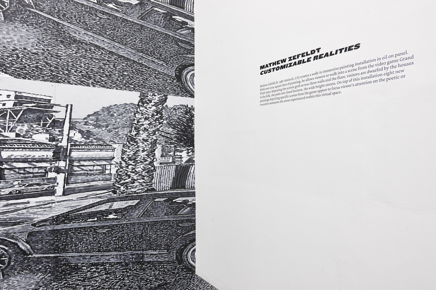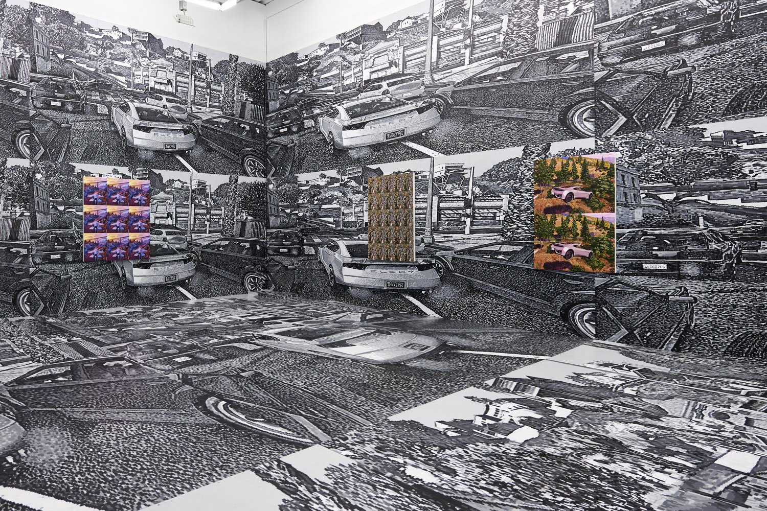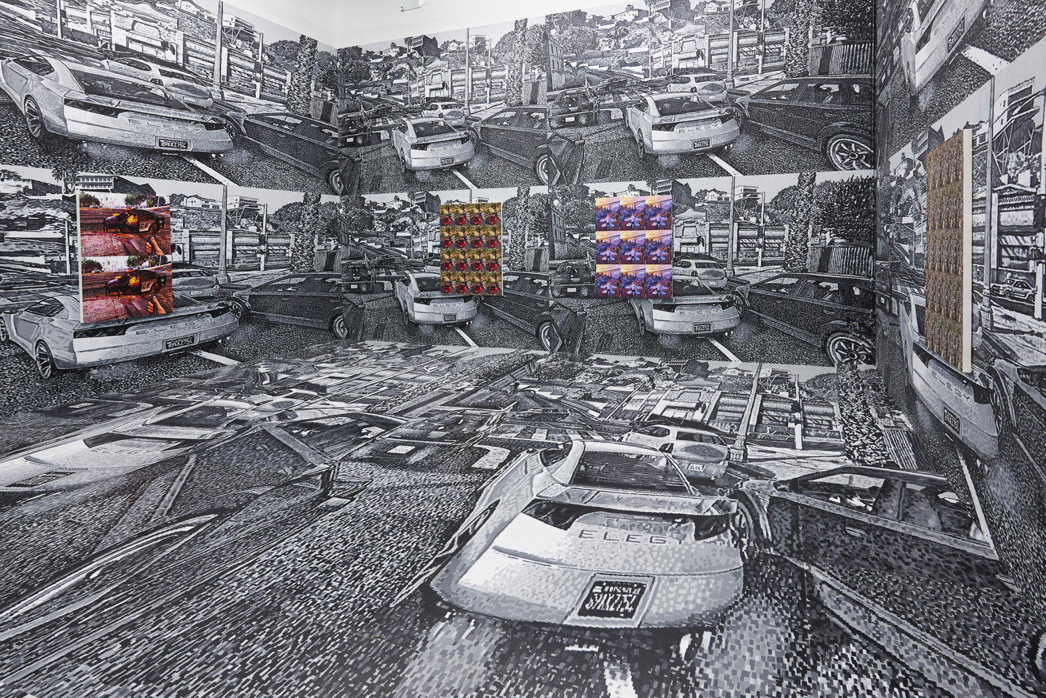 As the artist had to meticulously plan this out months ago, we know that exactly 2104 square feet of painting was generated for this installation. Executed with black and greyscale oil paint on panel, this walk-in mural consists sixteen repeated screen shot images from the video game Grand Theft Auto V (2013). The LA car-scape with houses in the hills and a palm-tree lined horizon surrounds you, the wide streets dotted with cars take you into the world of the video game; a layering of imperfect squares of paint evokes the sort of glitteringly bright LA light and also the light from behind screen of the video game.