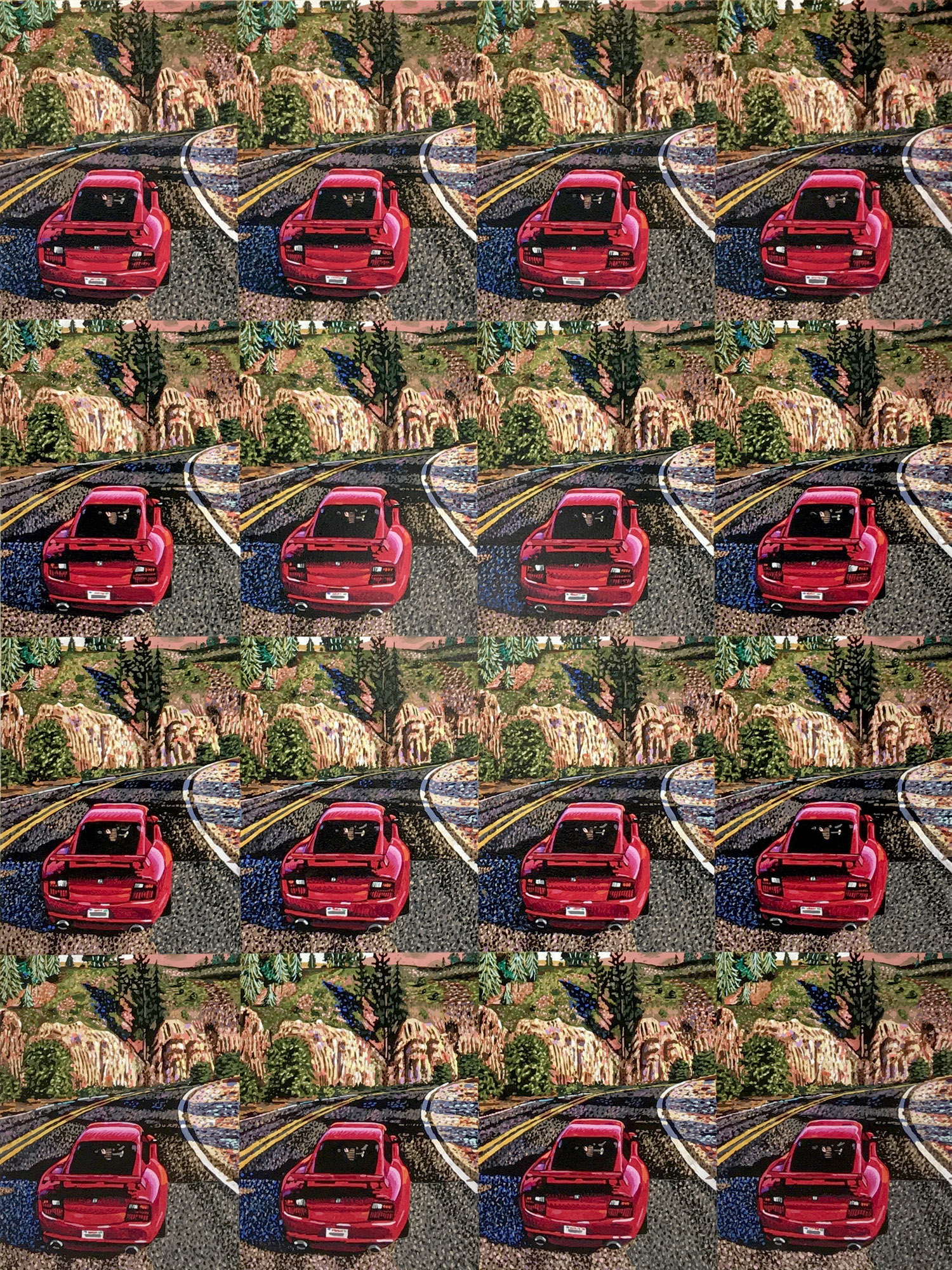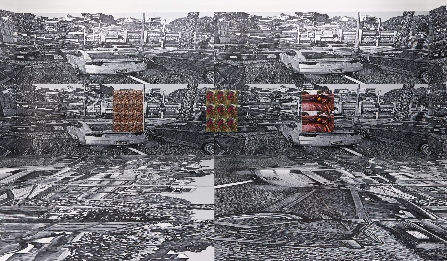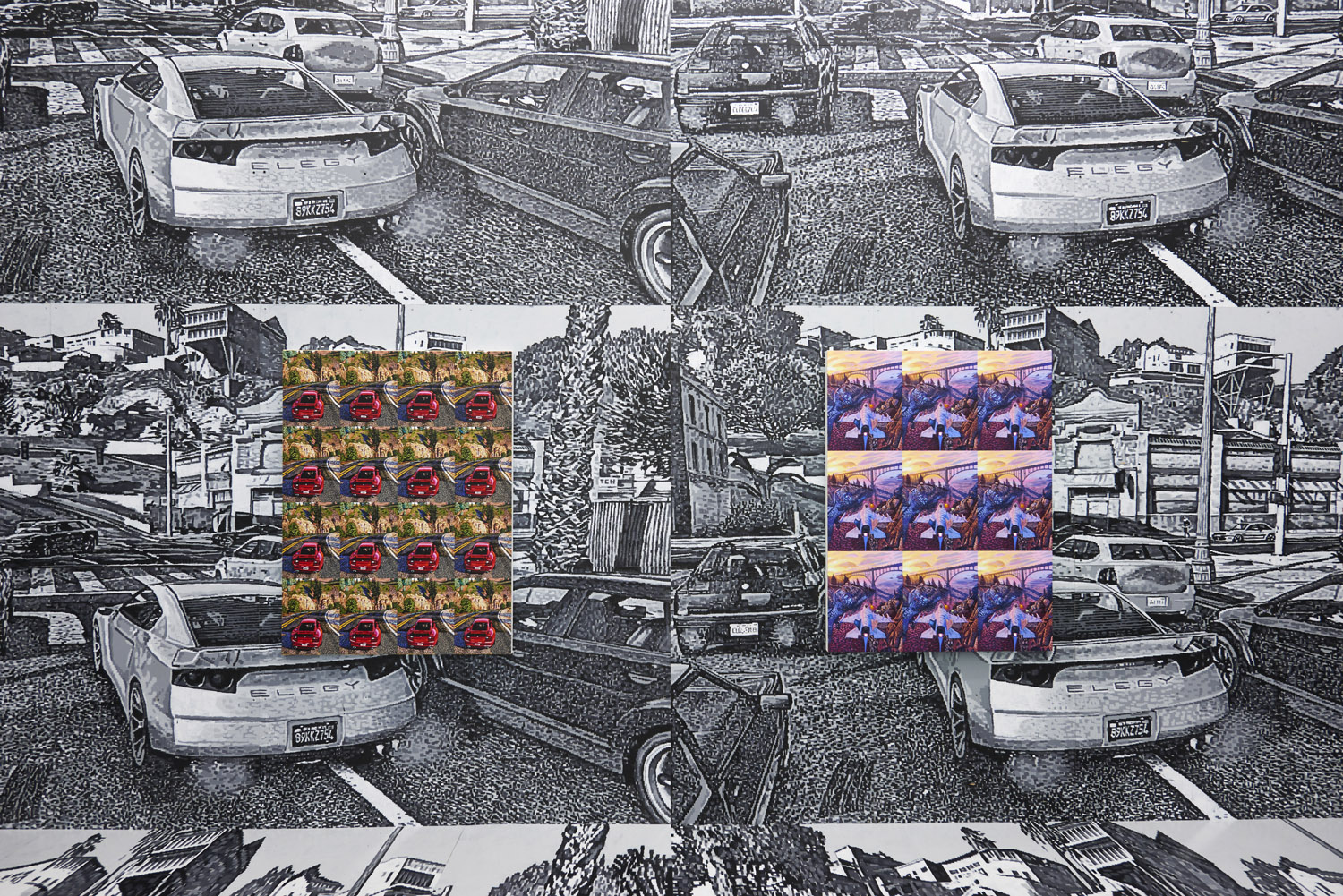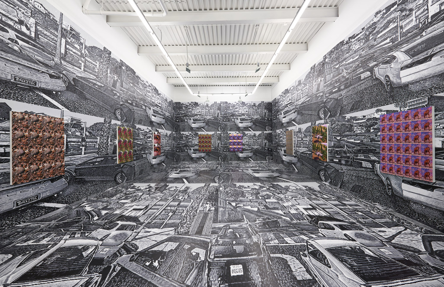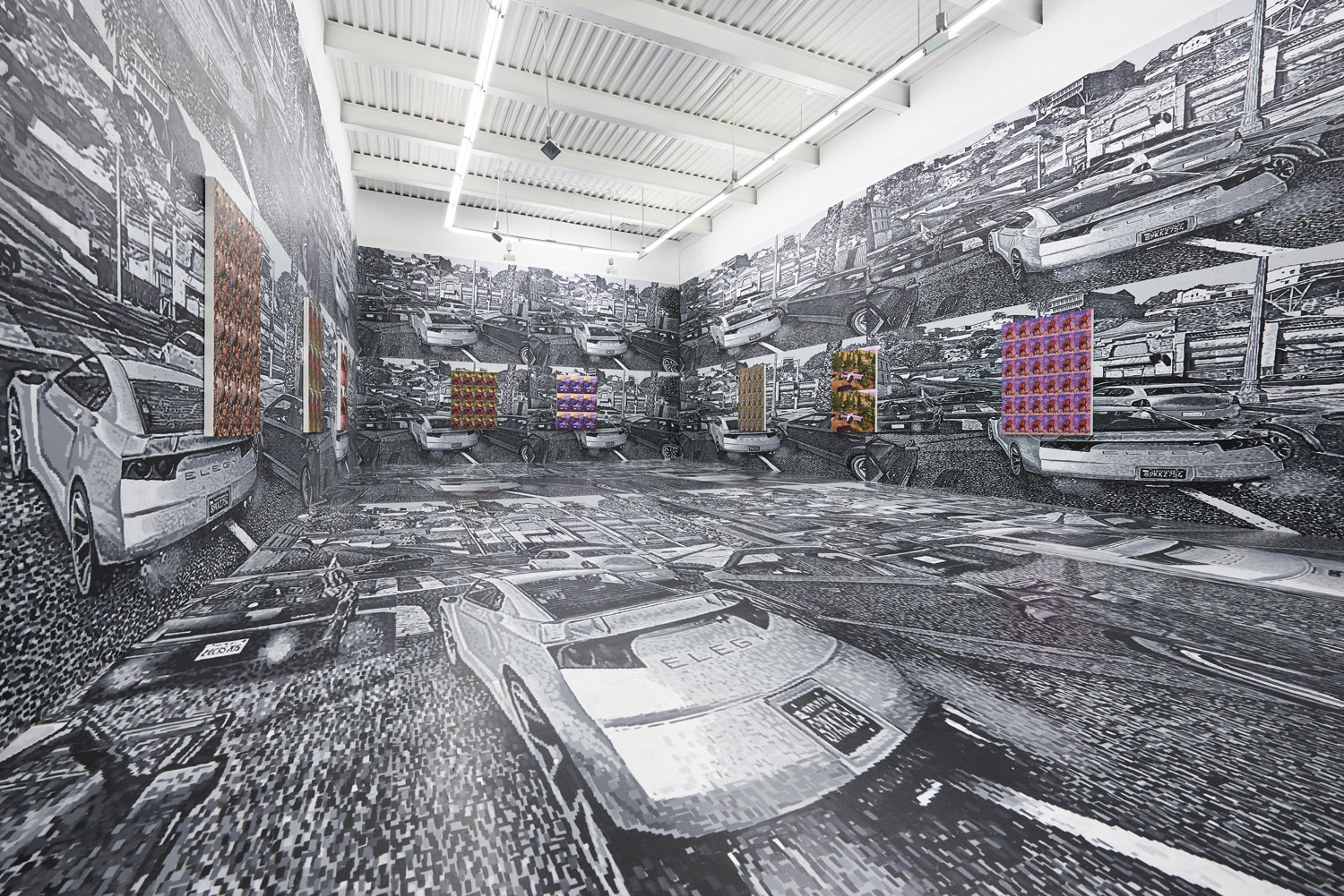 As the artist had to meticulously plan this out months ago, we know that exactly 2104 square feet of painting was generated for this installation. Executed with black and greyscale oil paint on panel, this walk-in mural consists sixteen repeated screen shot images from the video game Grand Theft Auto V (2013). The LA car-scape with houses in the hills and a palm-tree lined horizon surrounds you, the wide streets dotted with cars take you into the world of the video game; a layering of imperfect squares of paint evokes the sort of glitteringly bright LA light and also the light from behind screen of the video game.