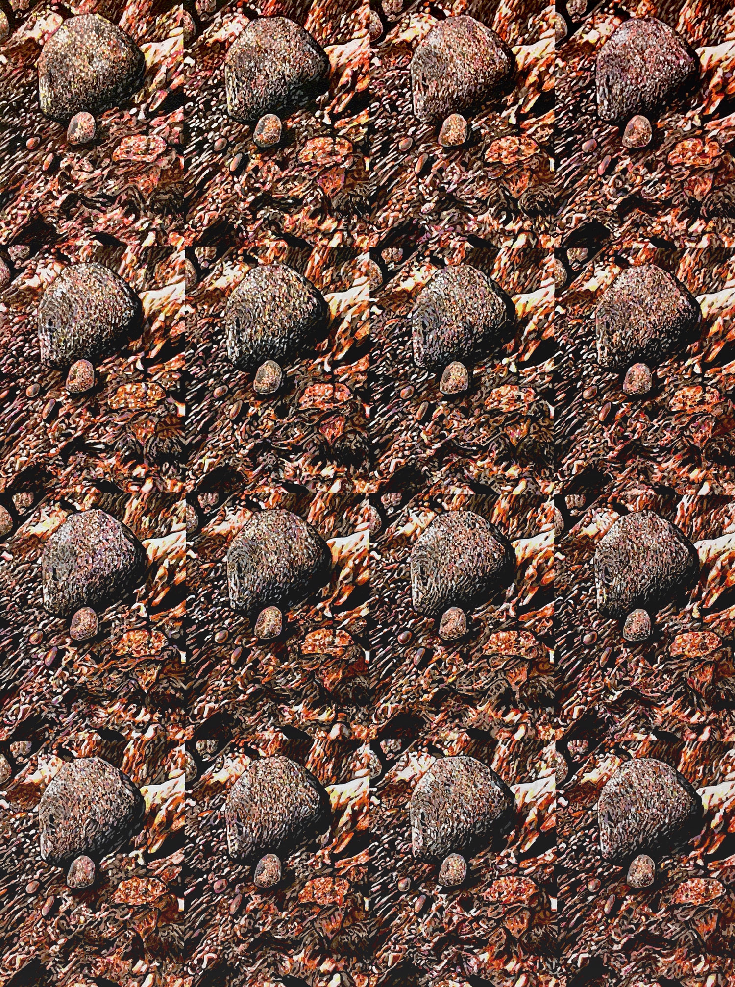Each painting depicts repeated images like a tiled desktop, from two to nine to thirty in some panels; painted over and over again by hand, matching almost perfectly with its twins. Such repetition is not natural to analog life, rather it is the realm of cut and pasteable endlessly iterable images in the digital realm. Why bother? It must be maddening to execute and “meditative” seems doubtful given the subject matter.