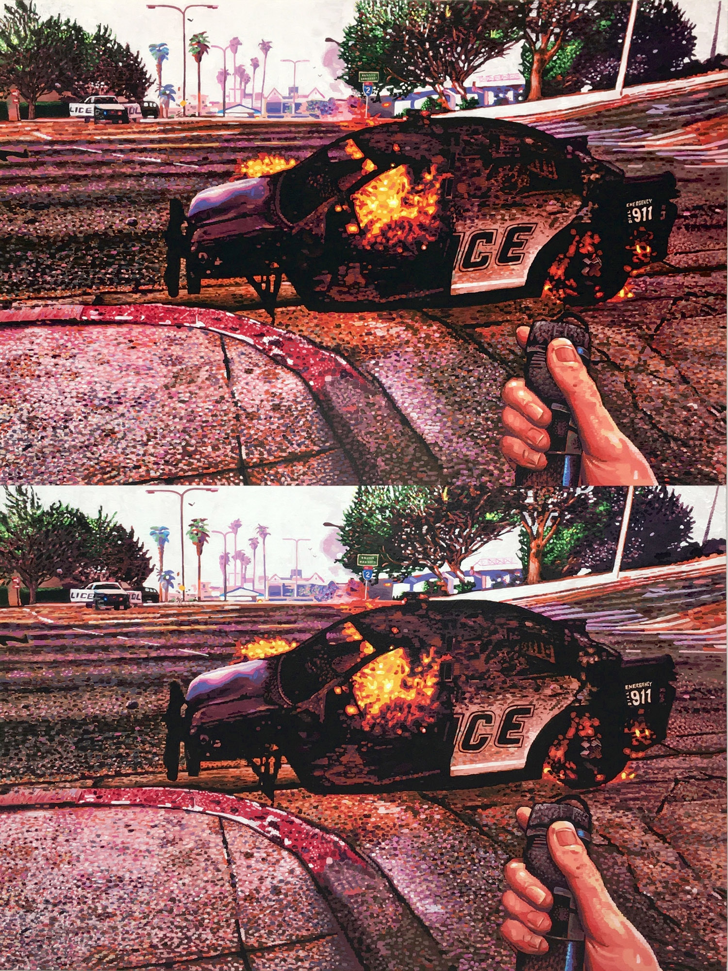 Mathew Zefeldt, Pipe Bomb and Police Car, 2018, acrylic on canvas over panel, 48 x 36 inches, 122 x 91 cm.