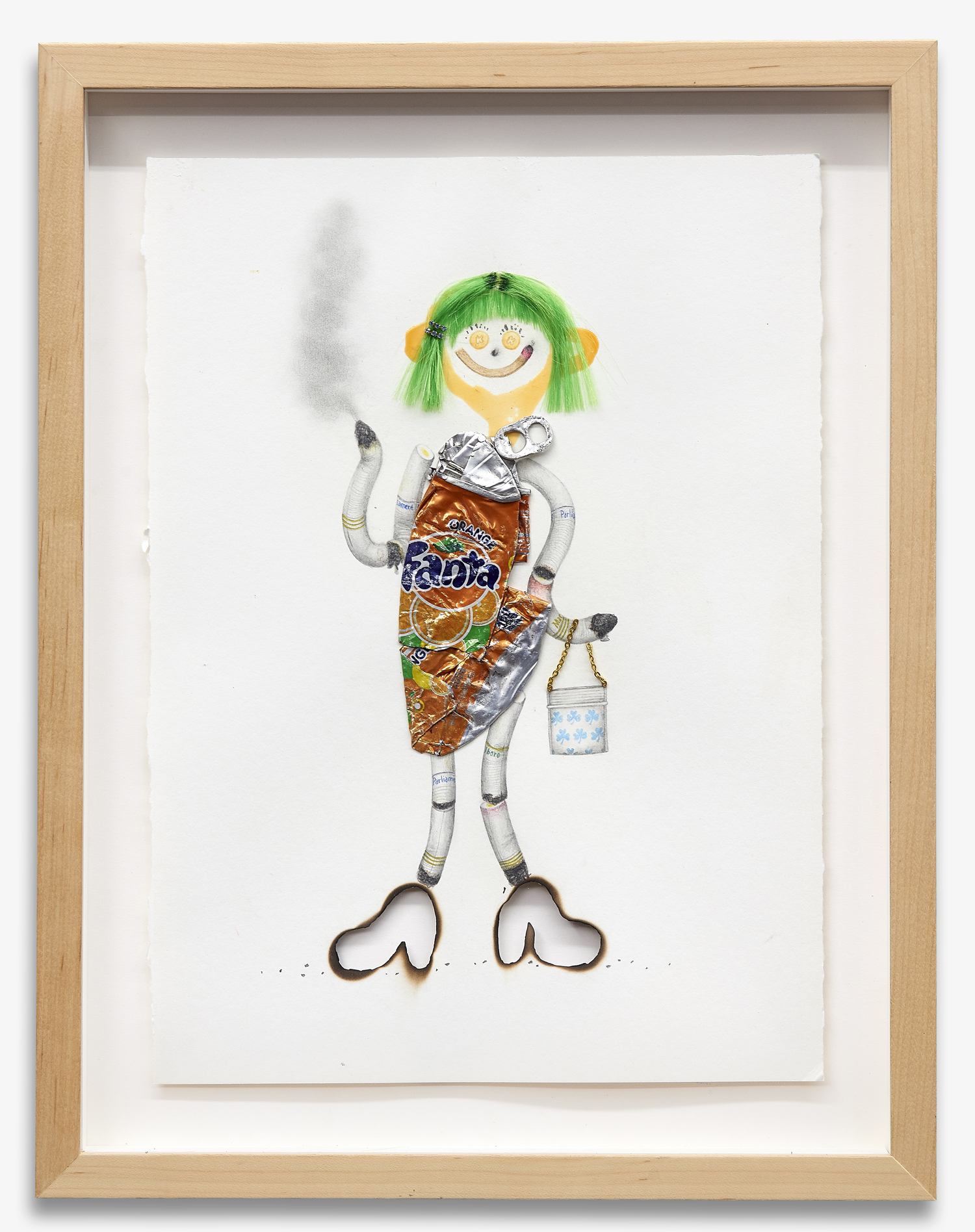 Aurel Schmidt, Drug Voodoo (Fanta), 2019. Color pencil, pencil, acrylic, crushed Fanta can, wig hair, Swarovski Crystals, metal, archival glue, burn holes on paper, 15.5 x 11 inches, 39 x 28 cm