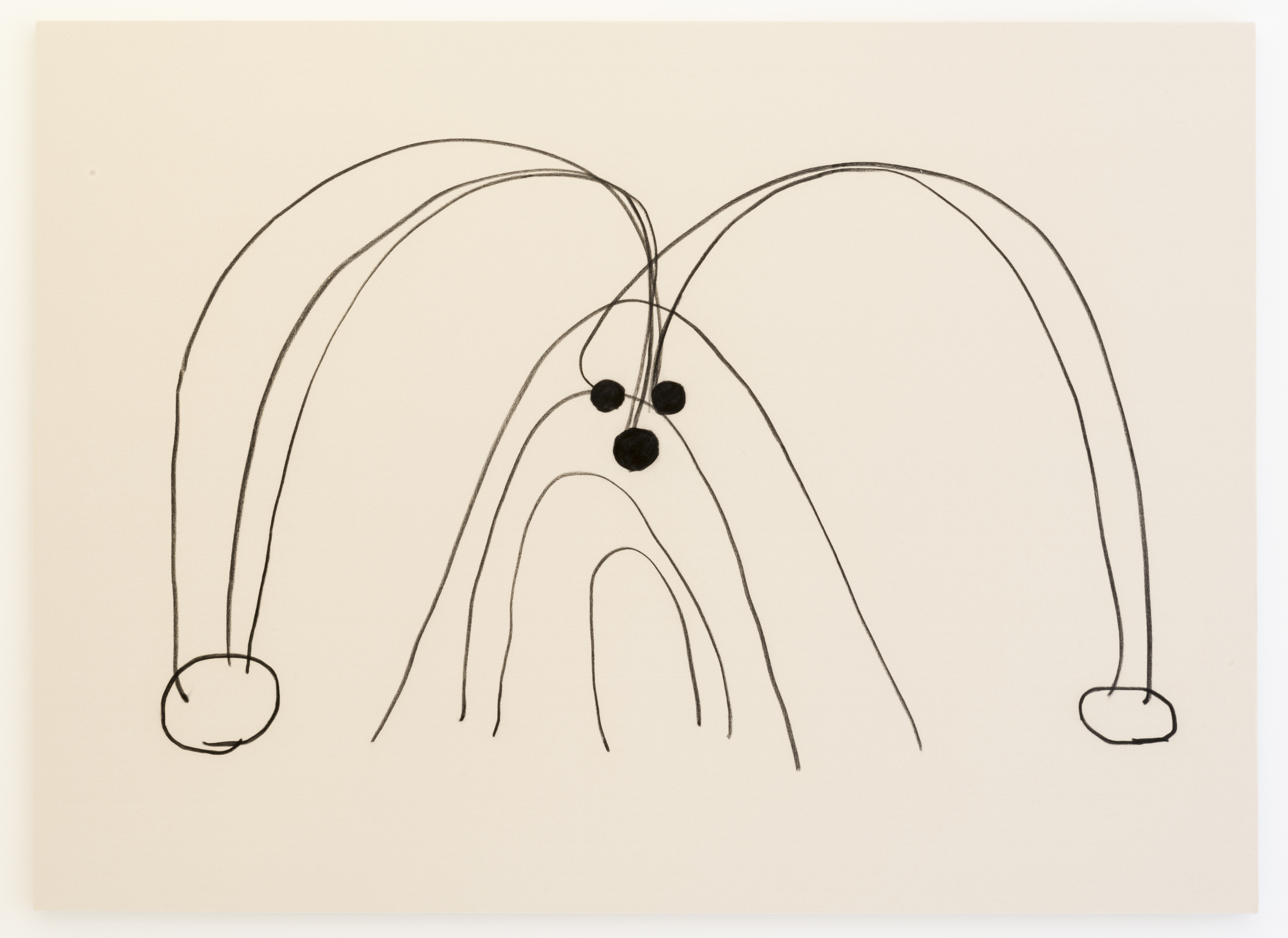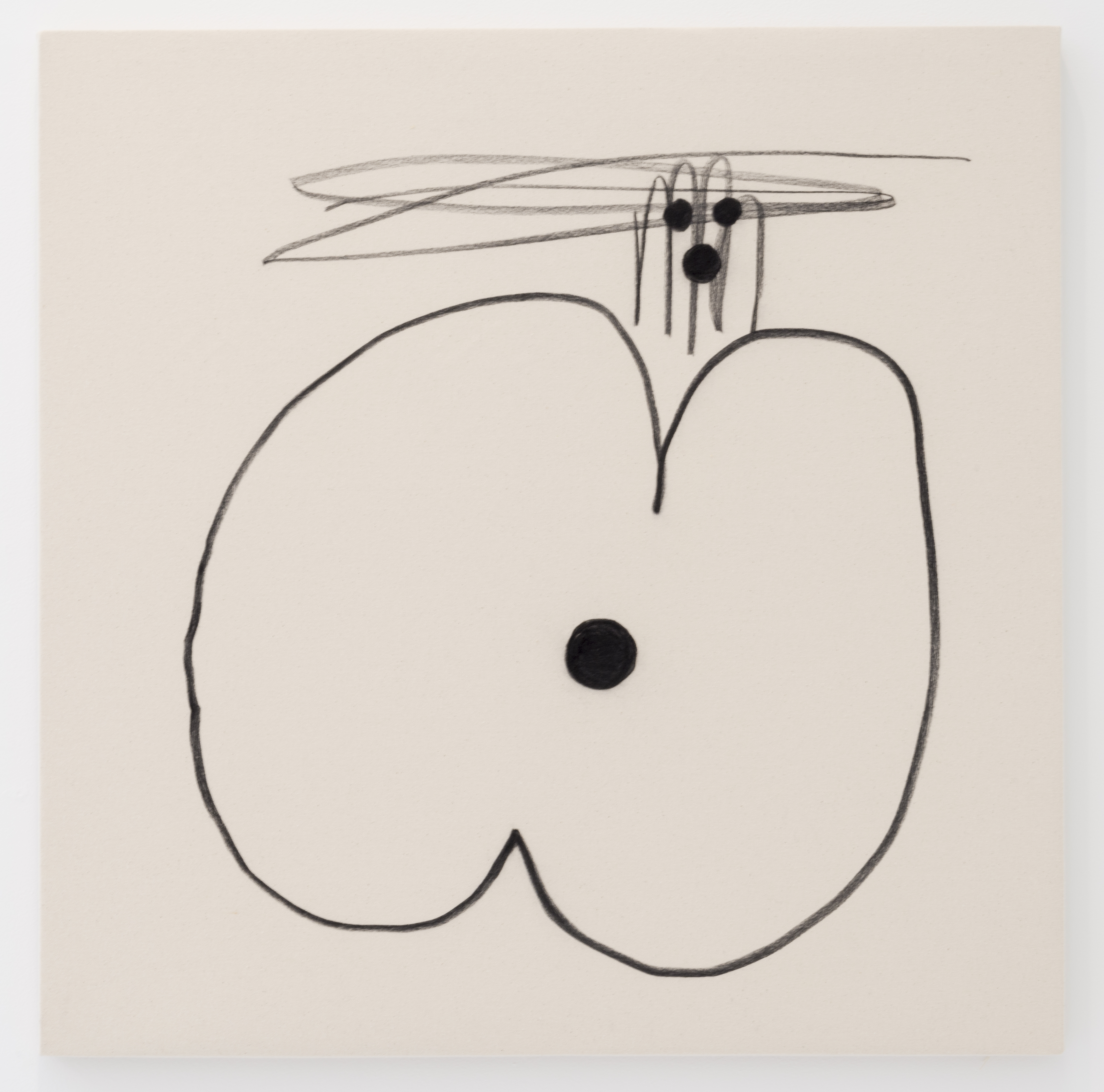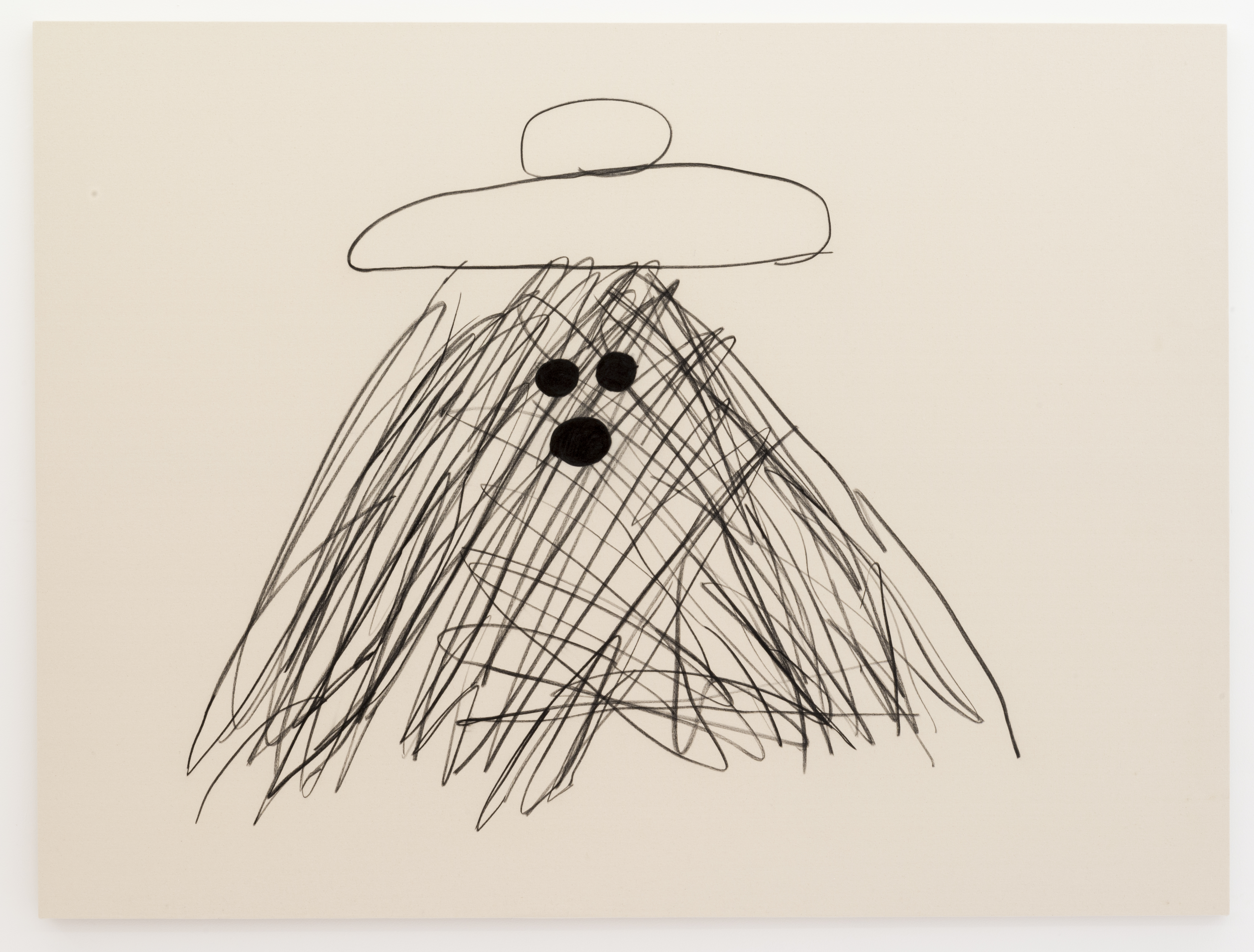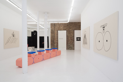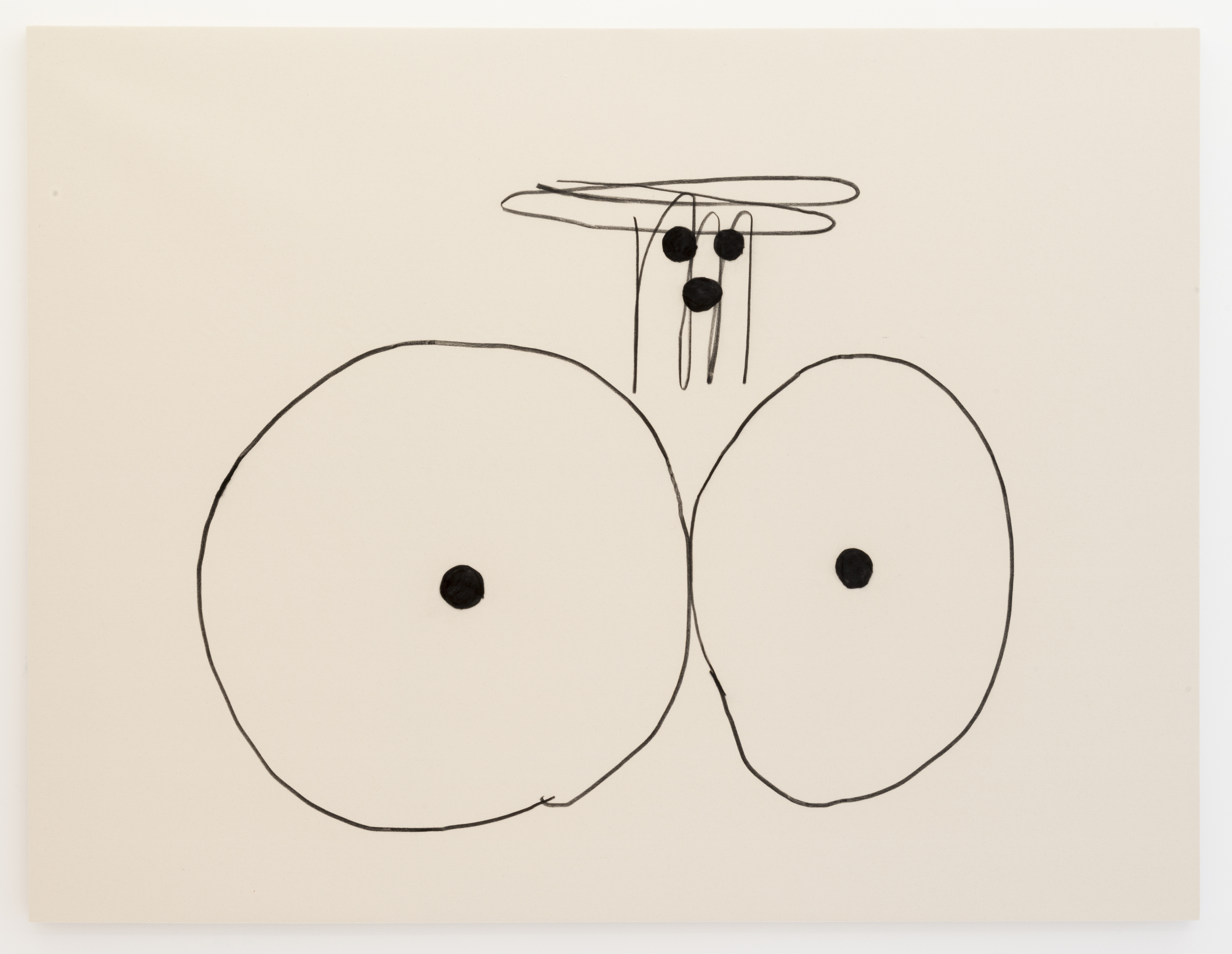 The enormous sculpture in the show, Max, is based on a dog Kawai sees every day being walked on her block, a black Scottish terrier, and the artwork comes with oversized combs for you to comb him with. Max also inspired comb-able paintings on the walls of various other breeds that come with various other sized combs. Throughout the space you can sit on sculptures by the artist made into jocular benches including Bubble Bench, a line of of large boobed ladies. From your boob you can survey the myriad paintings in the exhibition, some made with yarn, crumpled paper, or the huge charcoal on canvas paintings (as above) where her image-making is pared down to the most bare shapes and lines.