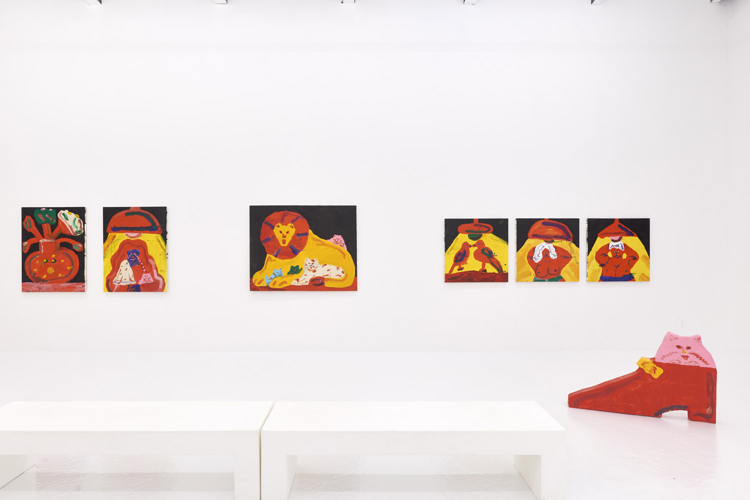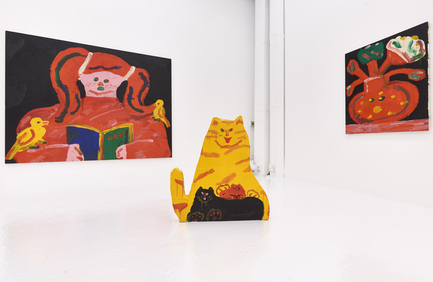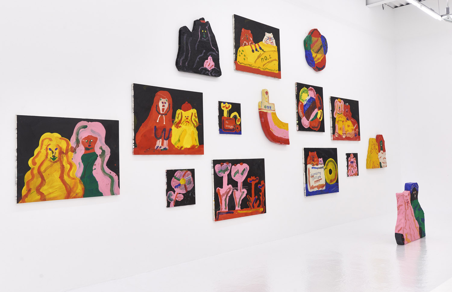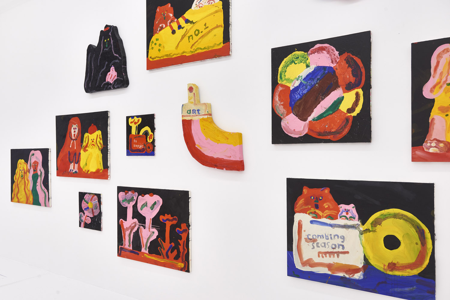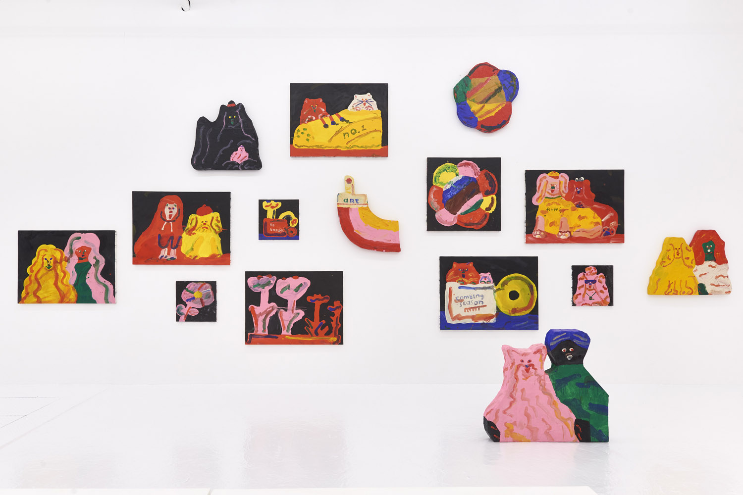 Faces are so wrong they are right, the flower pot is so misshapen that it is perfect, the dog’s face is deformed but evocative. That is the approach of Heta-Uma and here we find both misshapen dogs and cats, girls and boys, flowers and footwear. With a no-comment black background in every piece, the oddities themselves are presented straightforwardly. She isn’t making a scene, or an environment; her work is more deadpan symbolic like that of Donald Baechler or King Terry in Japan.