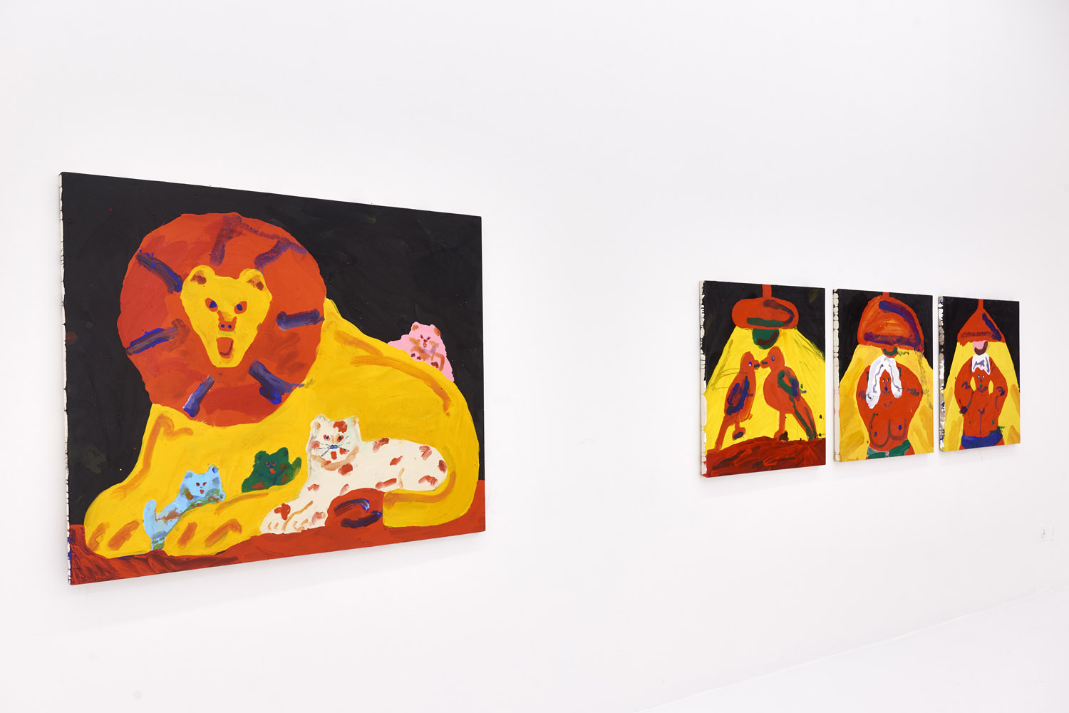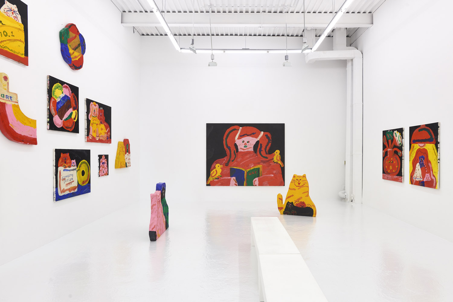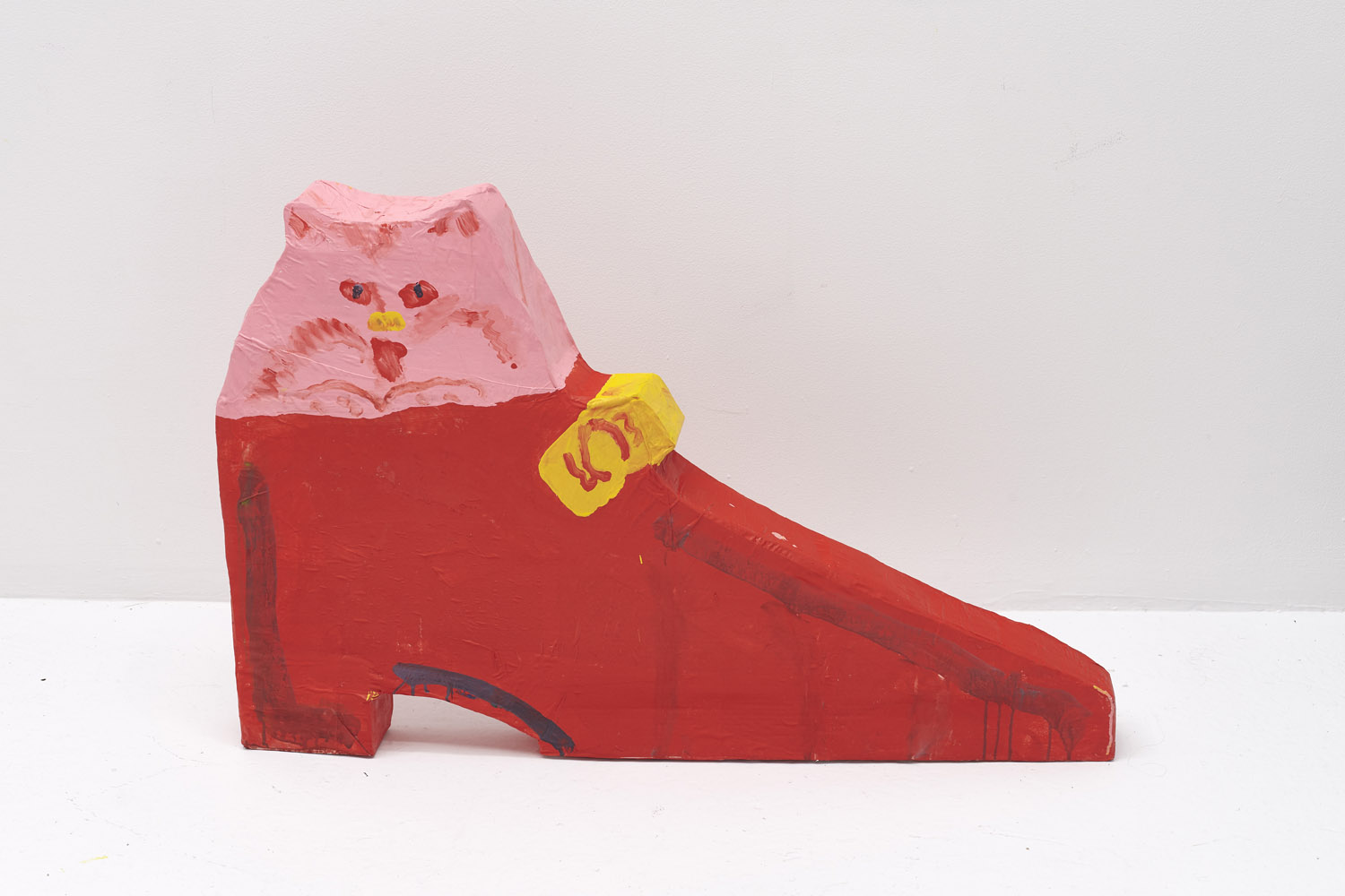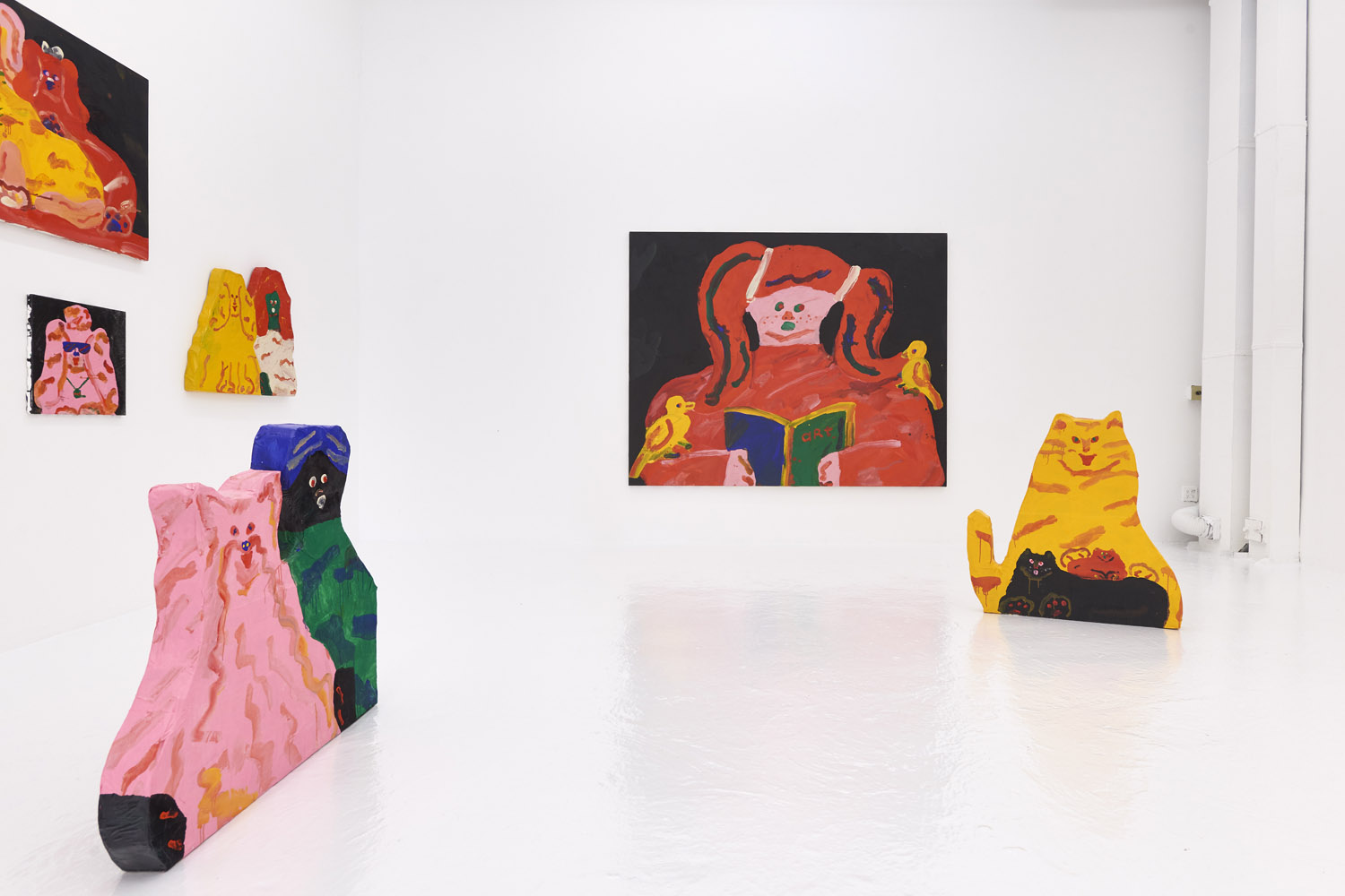 Faces are so wrong they are right, the flower pot is so misshapen that it is perfect, the dog’s face is deformed but evocative. That is the approach of Heta-Uma and here we find both misshapen dogs and cats, girls and boys, flowers and footwear. With a no-comment black background in every piece, the oddities themselves are presented straightforwardly. She isn’t making a scene, or an environment; her work is more deadpan symbolic like that of Donald Baechler or King Terry in Japan.