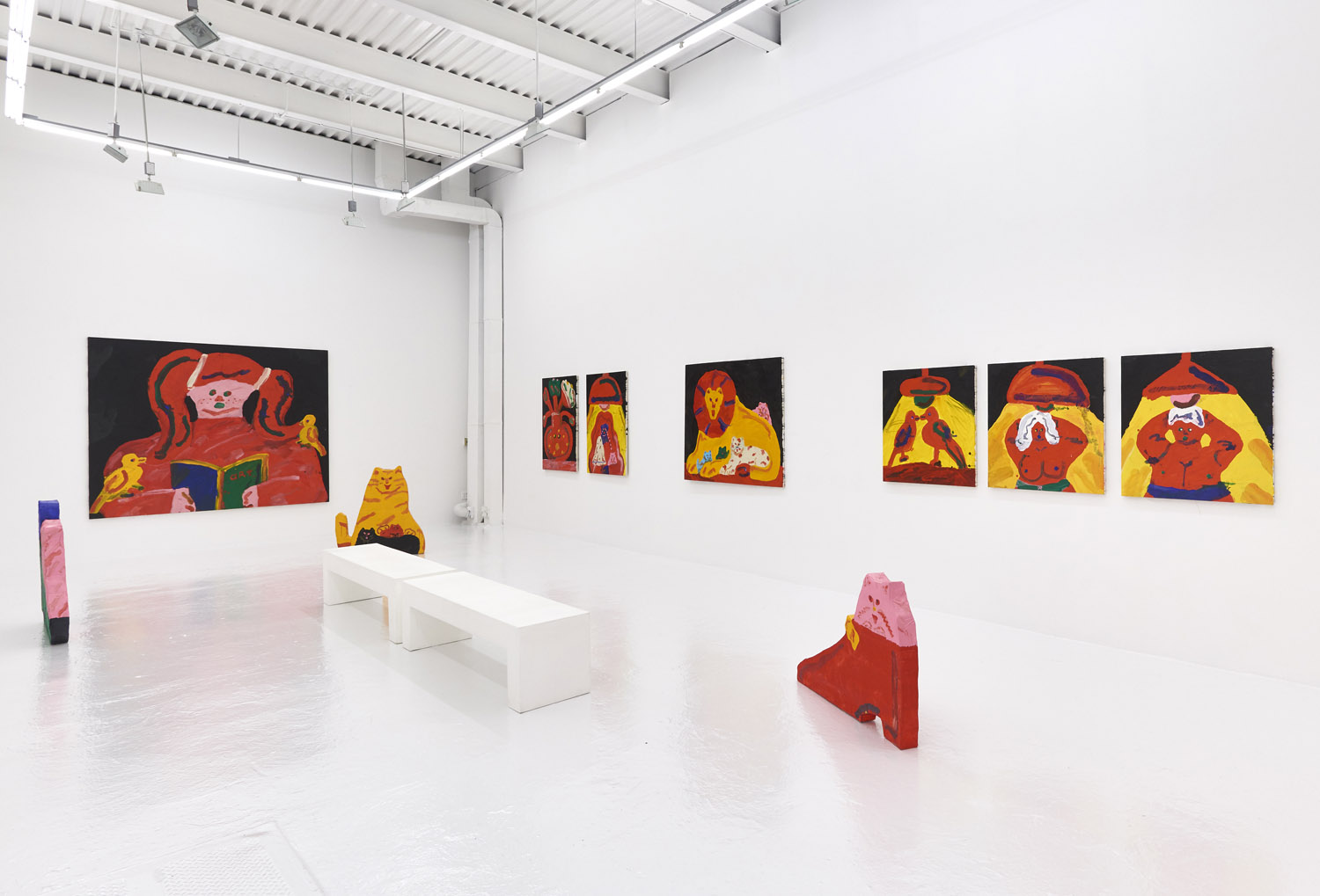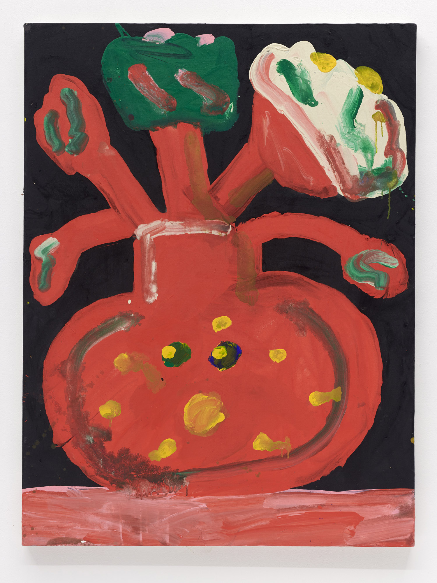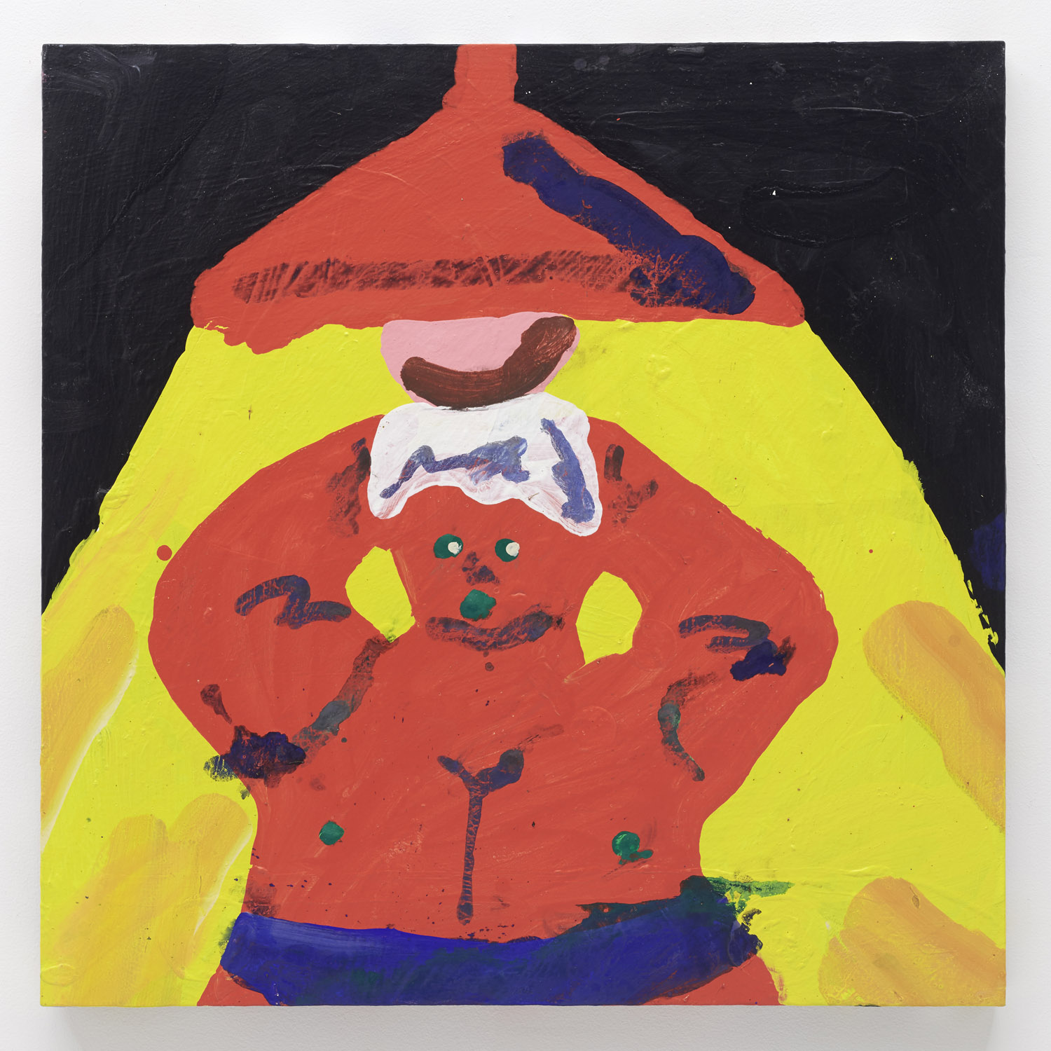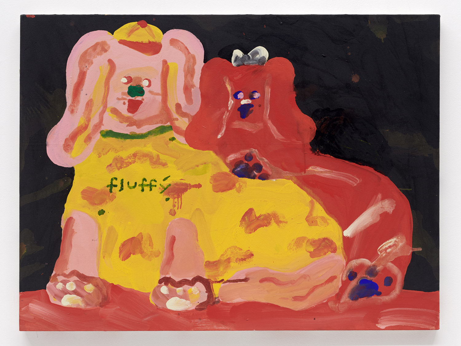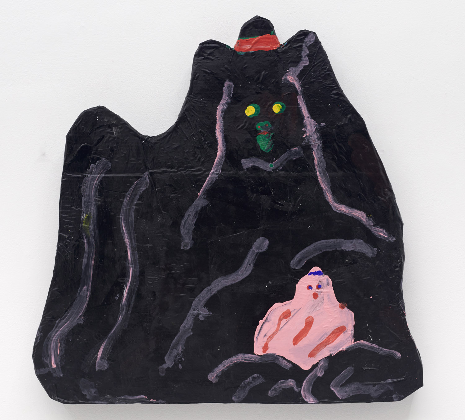 Faces are so wrong they are right, the flower pot is so misshapen that it is perfect, the dog’s face is deformed but evocative. That is the approach of Heta-Uma and here we find both misshapen dogs and cats, girls and boys, flowers and footwear. With a no-comment black background in every piece, the oddities themselves are presented straightforwardly. She isn’t making a scene, or an environment; her work is more deadpan symbolic like that of Donald Baechler or King Terry in Japan.