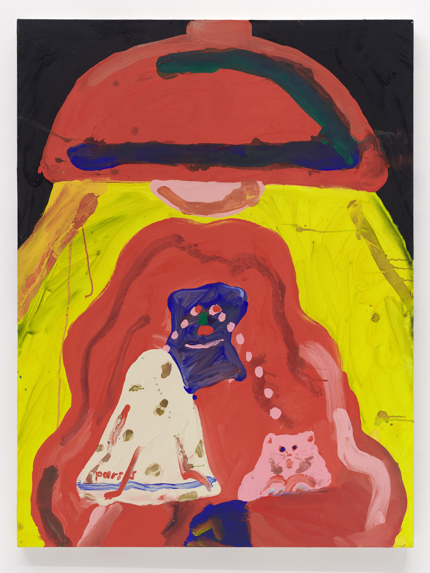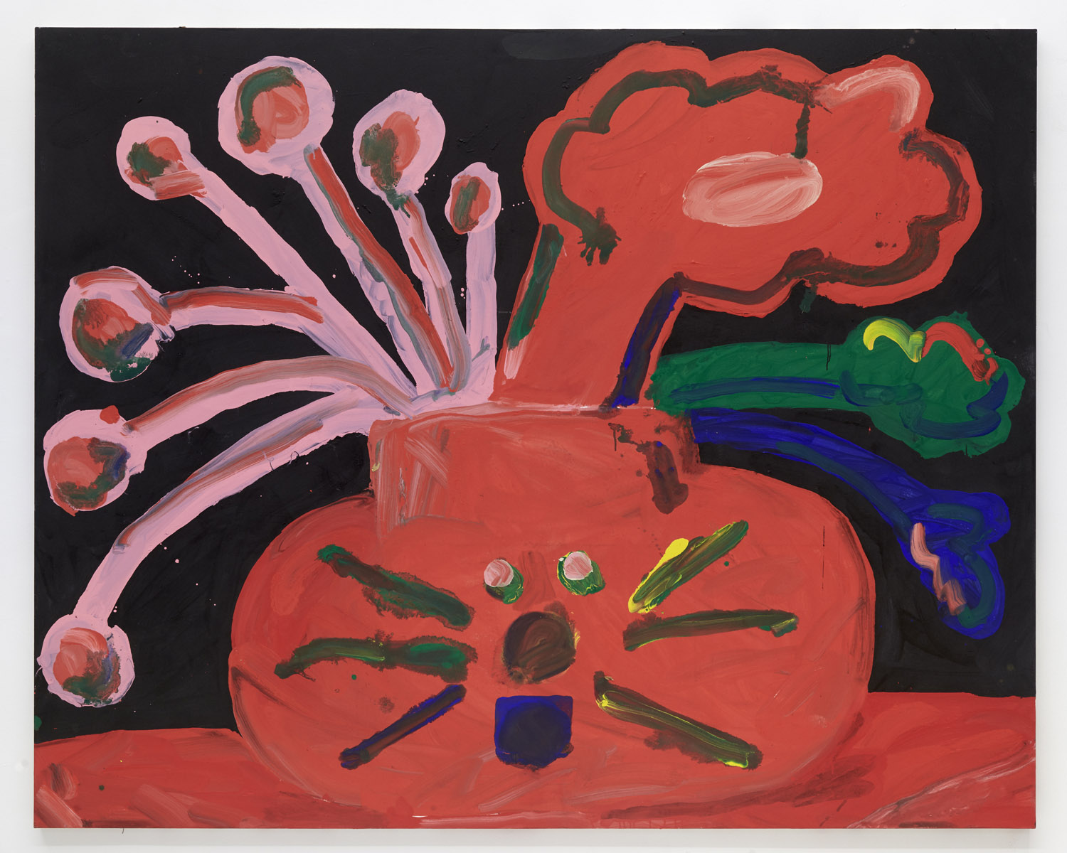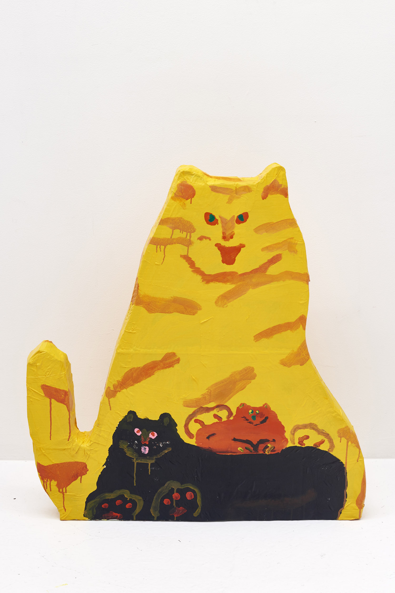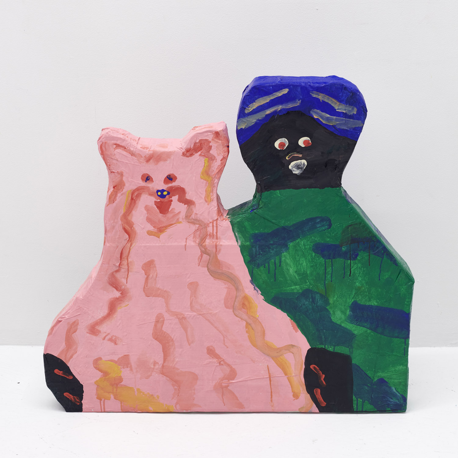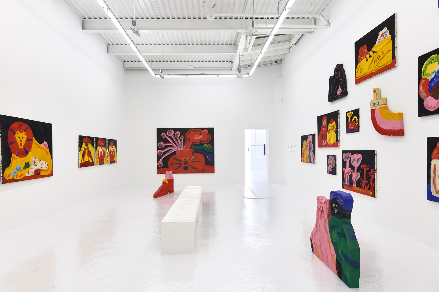 Faces are so wrong they are right, the flower pot is so misshapen that it is perfect, the dog’s face is deformed but evocative. That is the approach of Heta-Uma and here we find both misshapen dogs and cats, girls and boys, flowers and footwear. With a no-comment black background in every piece, the oddities themselves are presented straightforwardly. She isn’t making a scene, or an environment; her work is more deadpan symbolic like that of Donald Baechler or King Terry in Japan.