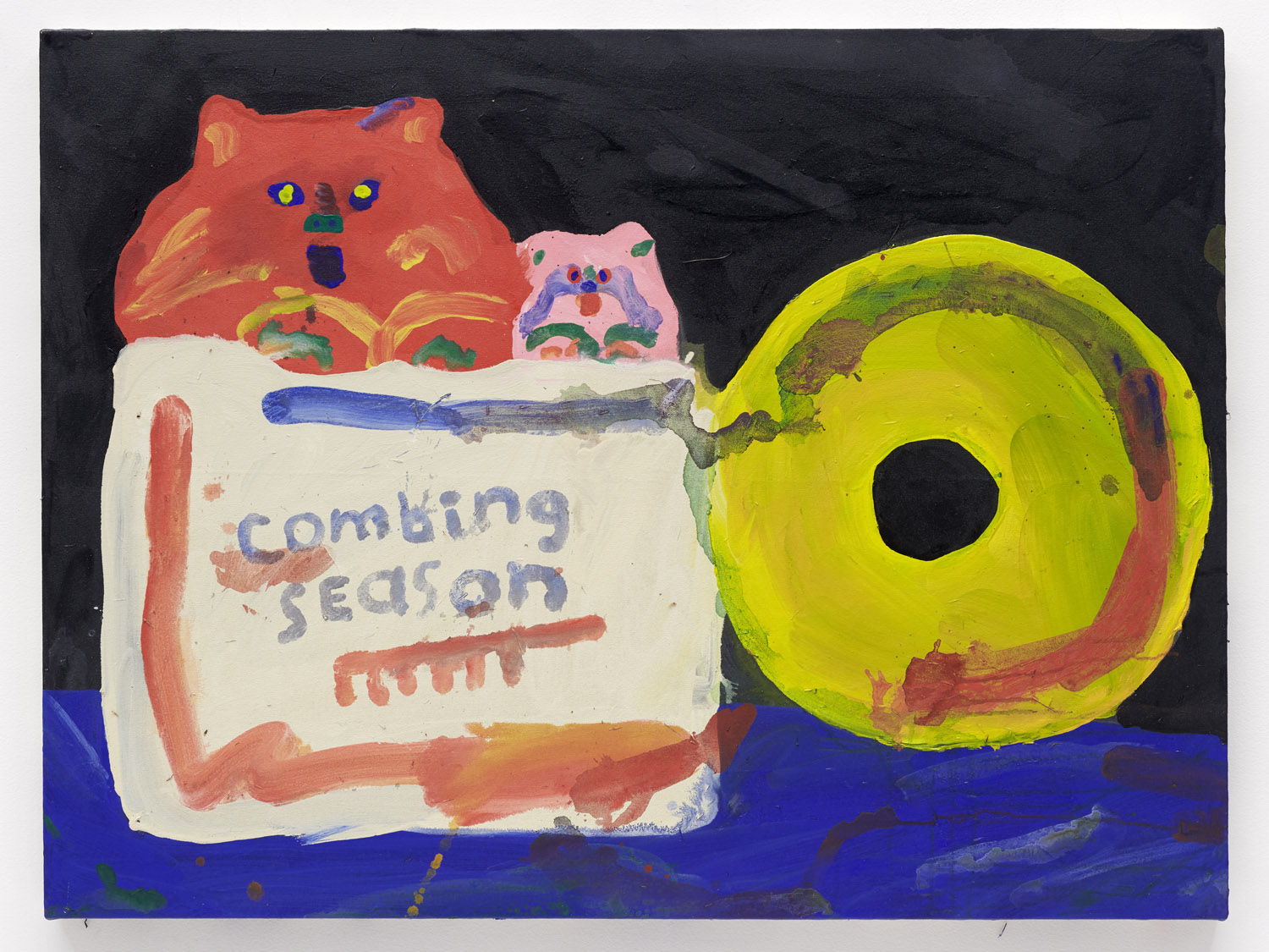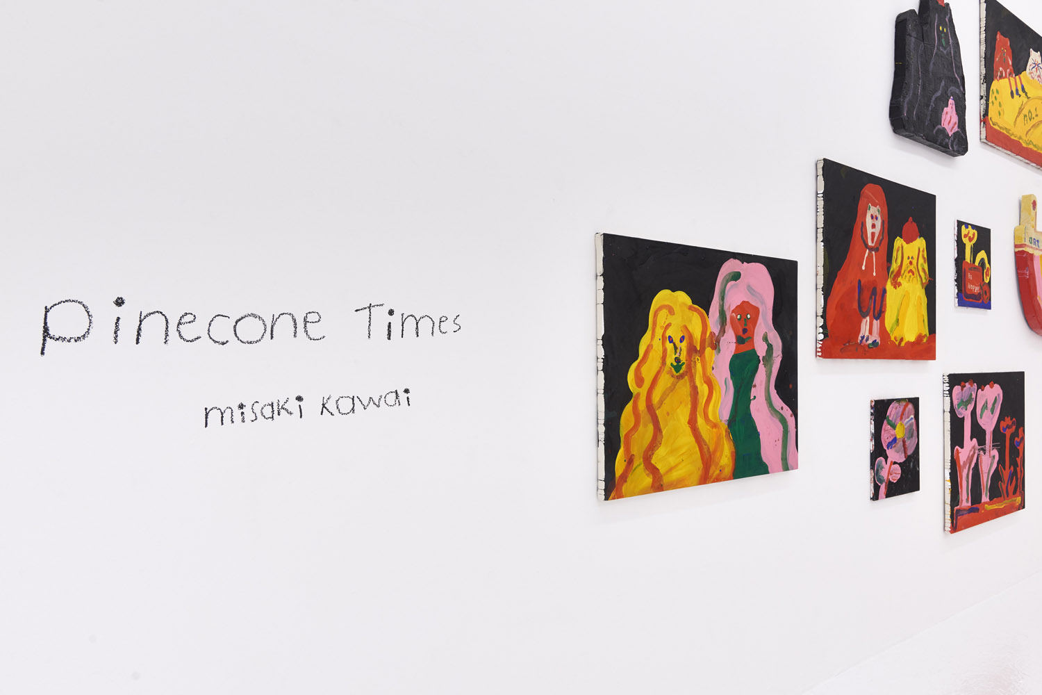 The Hole is proud to announce our third solo exhibition by Misaki Kawai “Pine Cone Times.” Two Octobers ago she brought us “Cave Life” painting the entire gallery yellow with black cave paintings and animal furniture CHECK IT OUT and three years before that we got a giant black combable dog sculpture and fluffy pink paintings (and combs!) for “Hair Show” see that one HERE so boy, we are super excited for this year’s October Misaki surprise.
