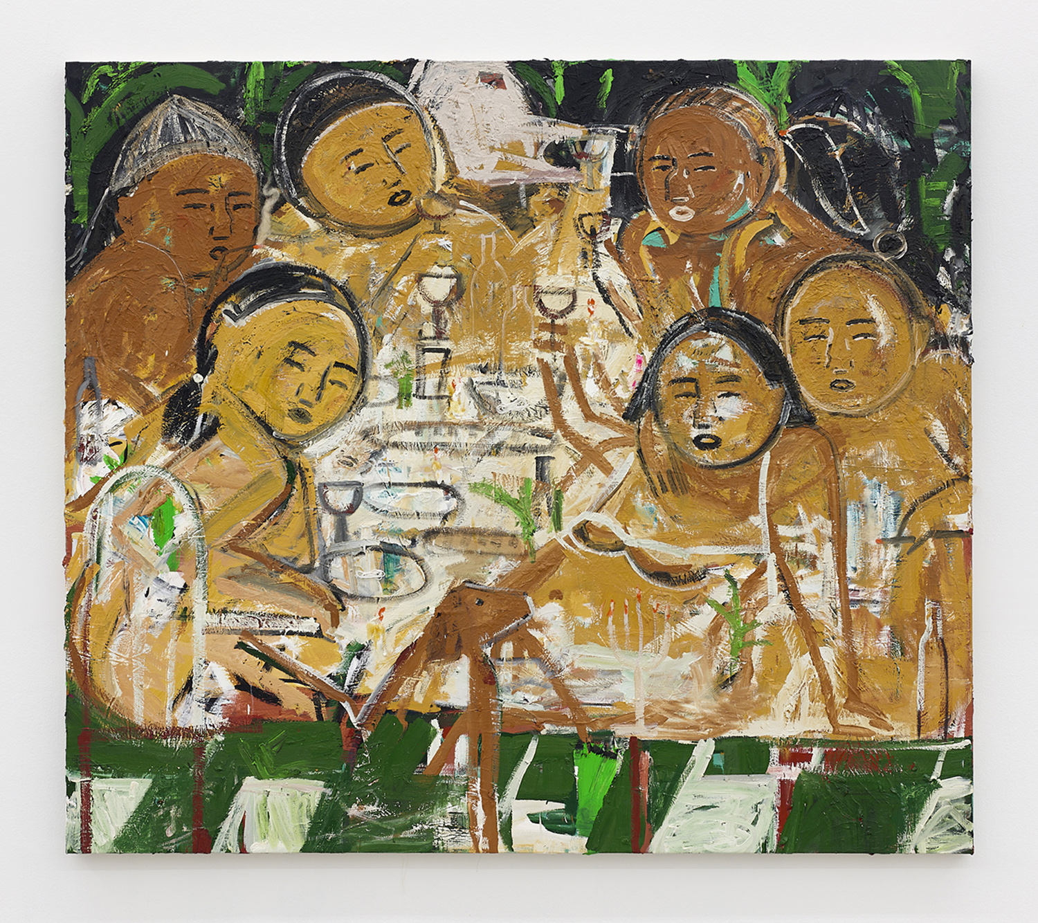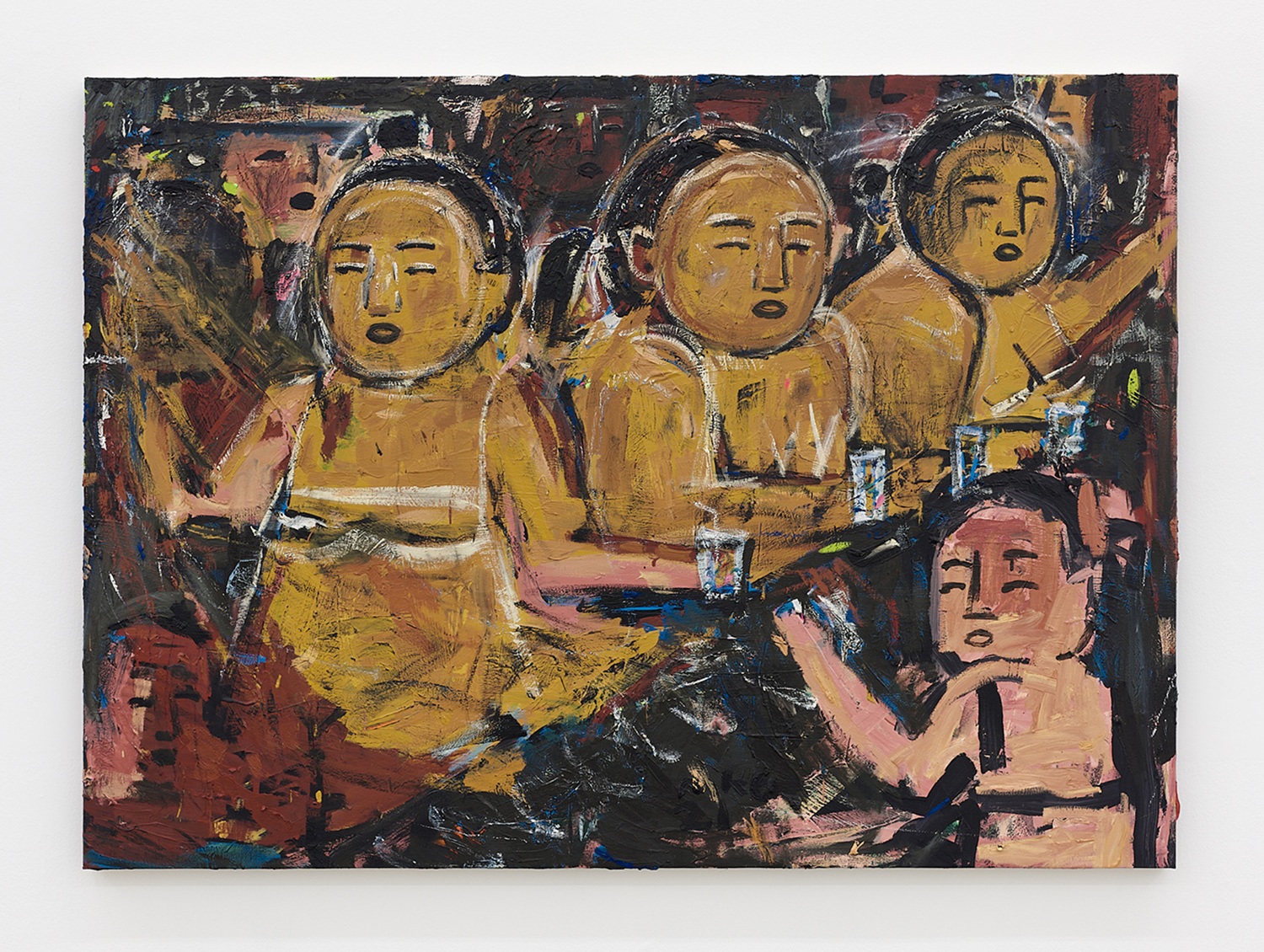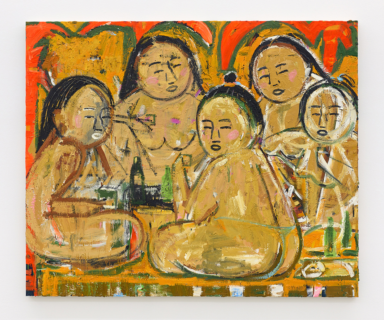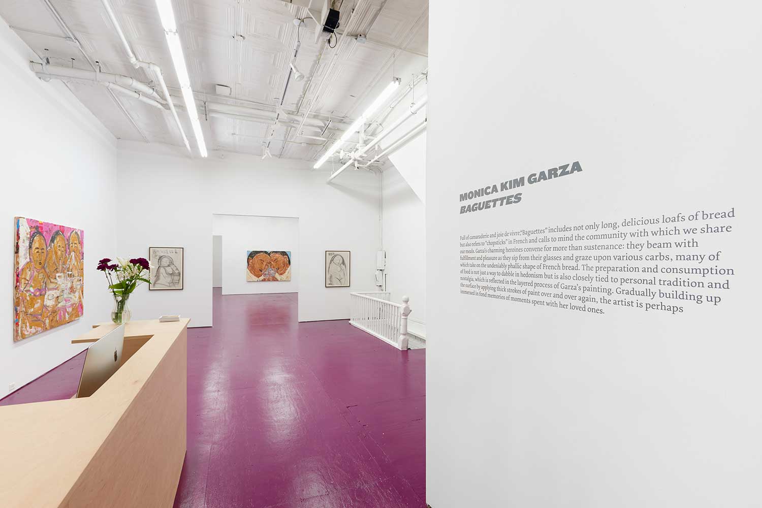 The Hole is proud to present the New York solo debut by Monica Kim Garza. In twelve paintings and three works on paper this show is big and bodacious, large enough to satisfy everyone’s curiosity about this amazing artist they might have only heard about. In Baguettes, Monica’s signature nonchalant characters return in new oil paintings on canvas and works on paper, gathering to feast, drink, smoke and celebrate. Each figure is rendered in broad, bold strokes, often highlighted with collage materials such as wool, yarn and glitter.