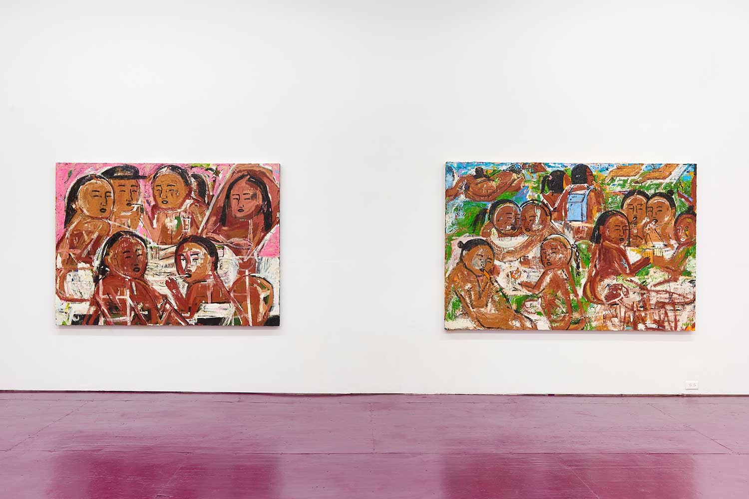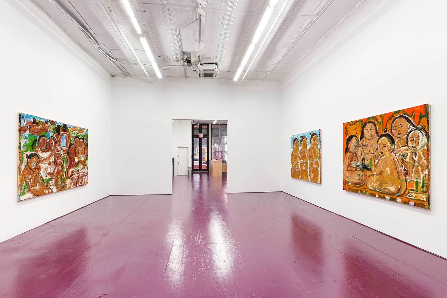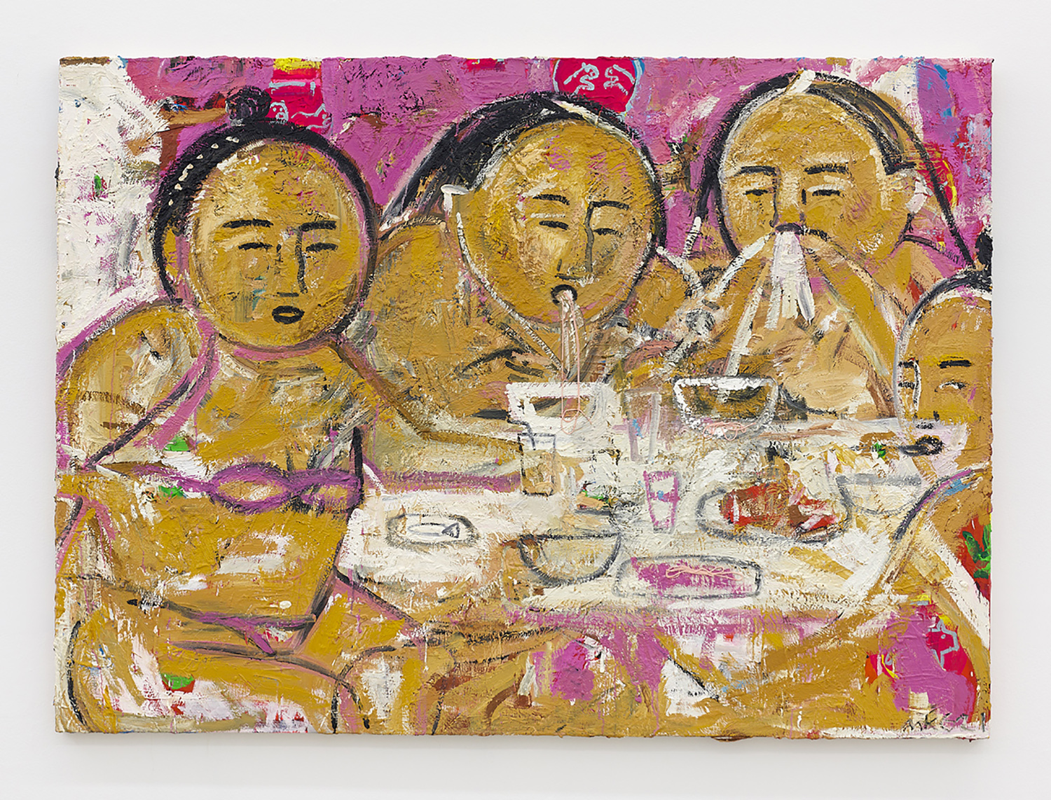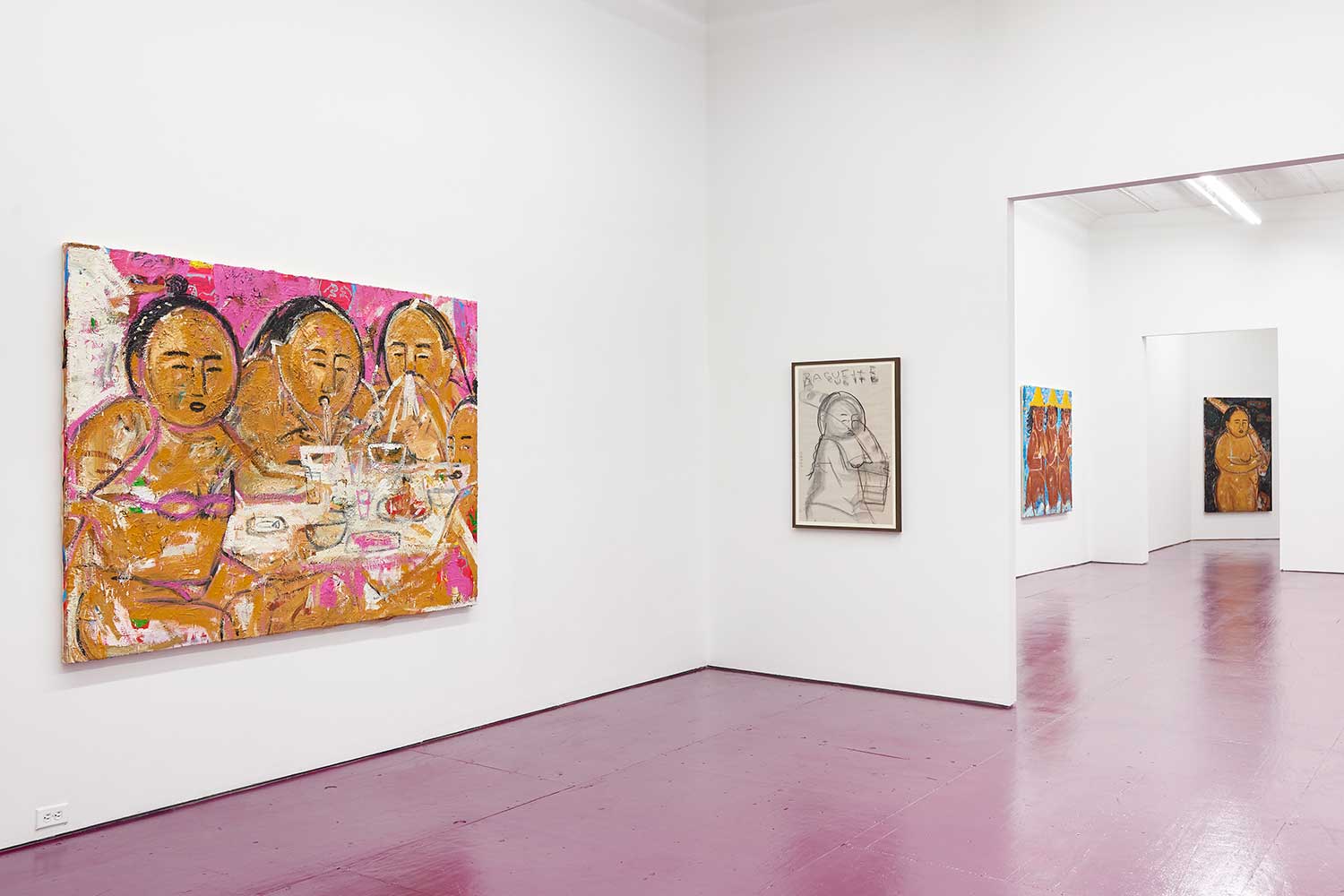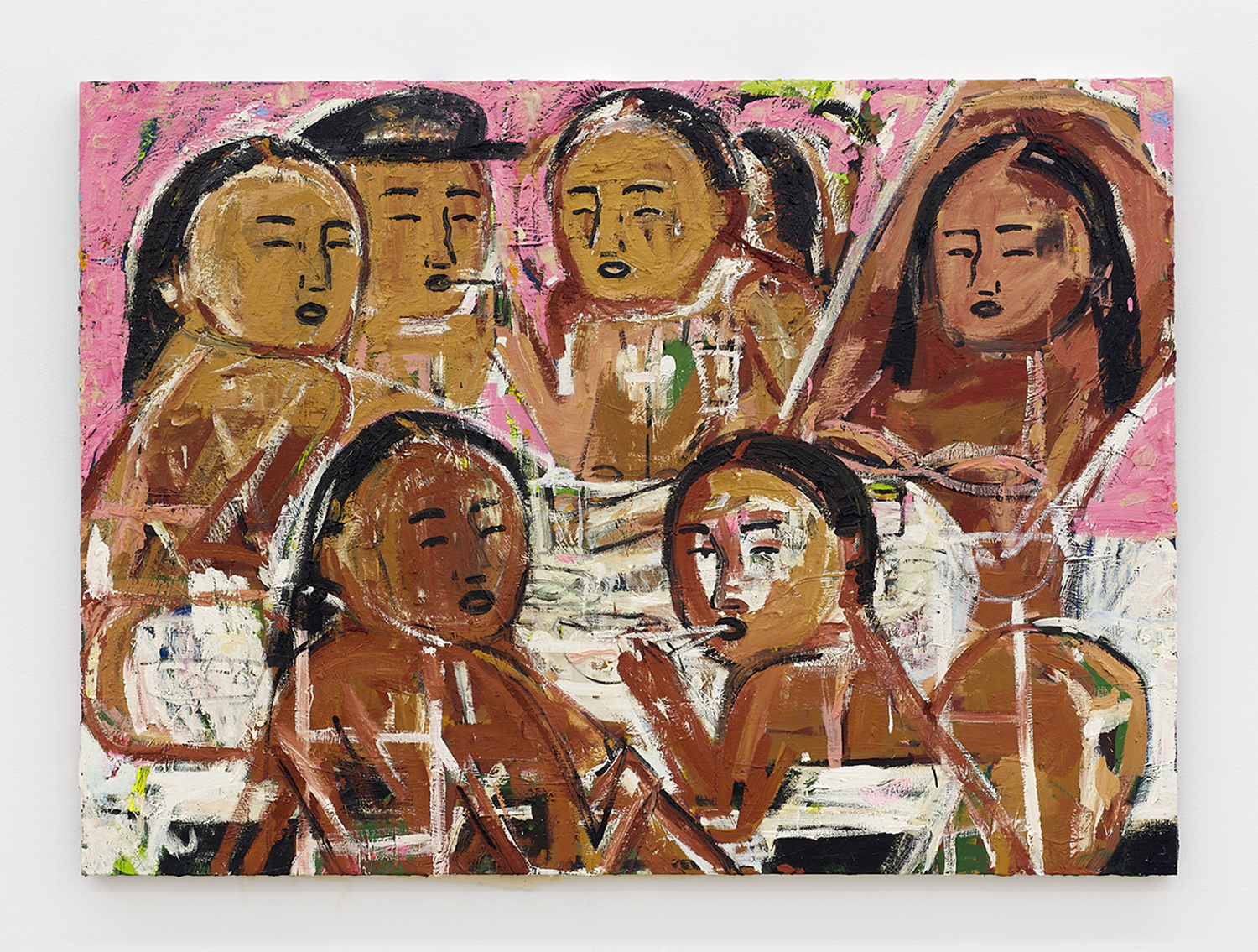The Hole is proud to present the New York solo debut by Monica Kim Garza. In twelve paintings and three works on paper this show is big and bodacious, large enough to satisfy everyone’s curiosity about this amazing artist they might have only heard about. In Baguettes, Monica’s signature nonchalant characters return in new oil paintings on canvas and works on paper, gathering to feast, drink, smoke and celebrate. Each figure is rendered in broad, bold strokes, often highlighted with collage materials such as wool, yarn and glitter.