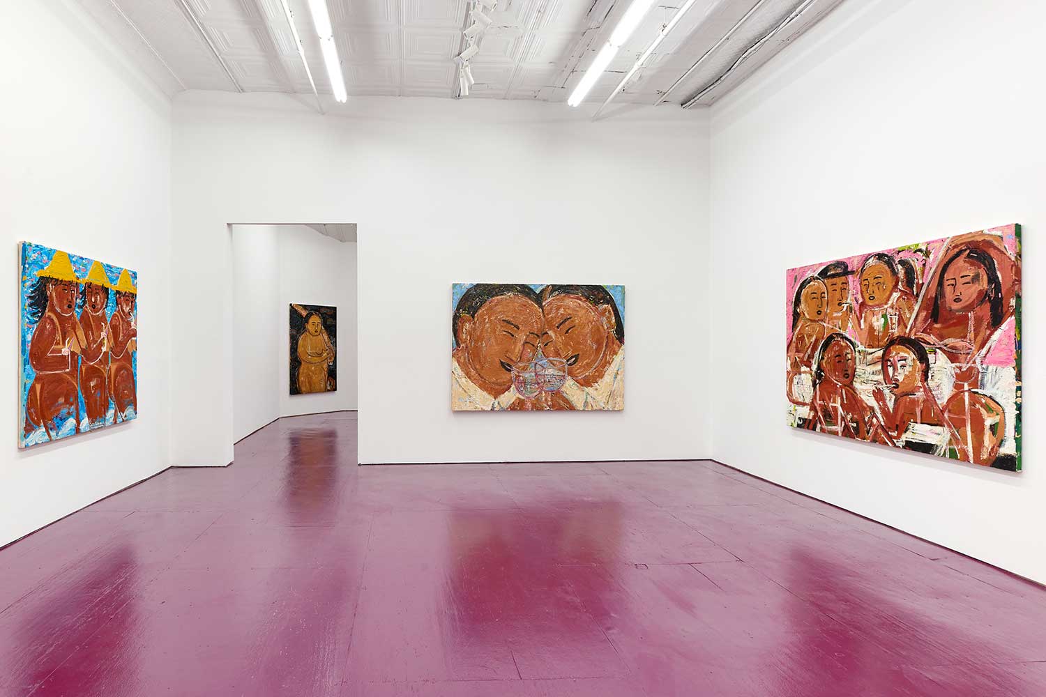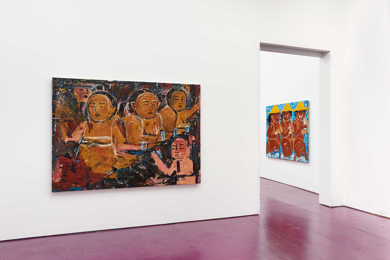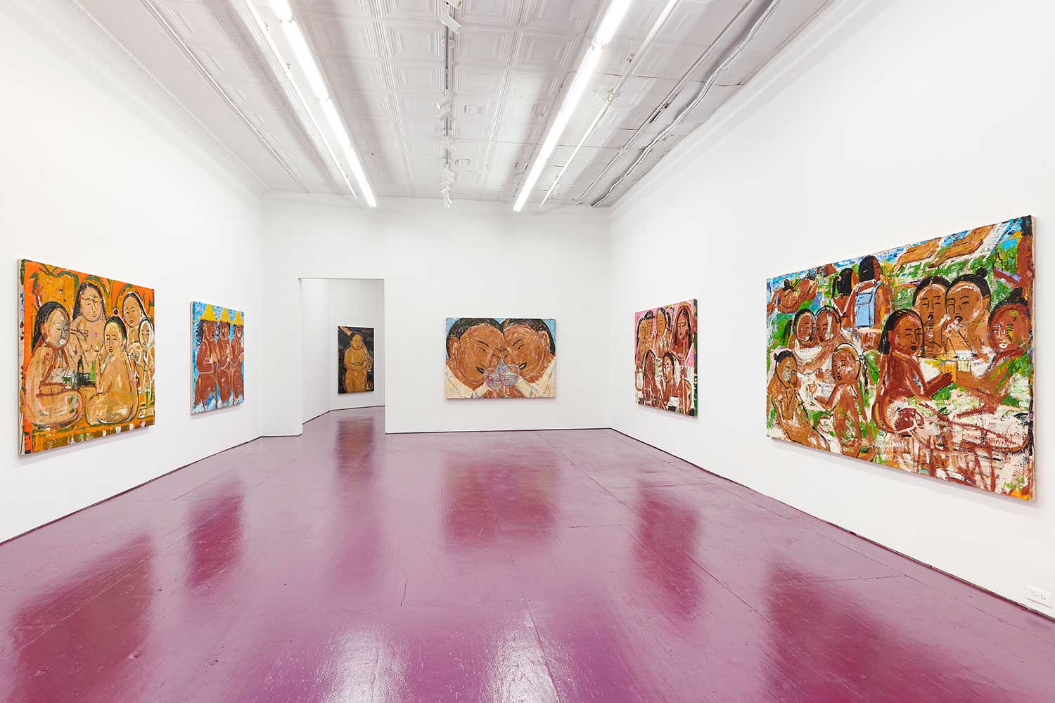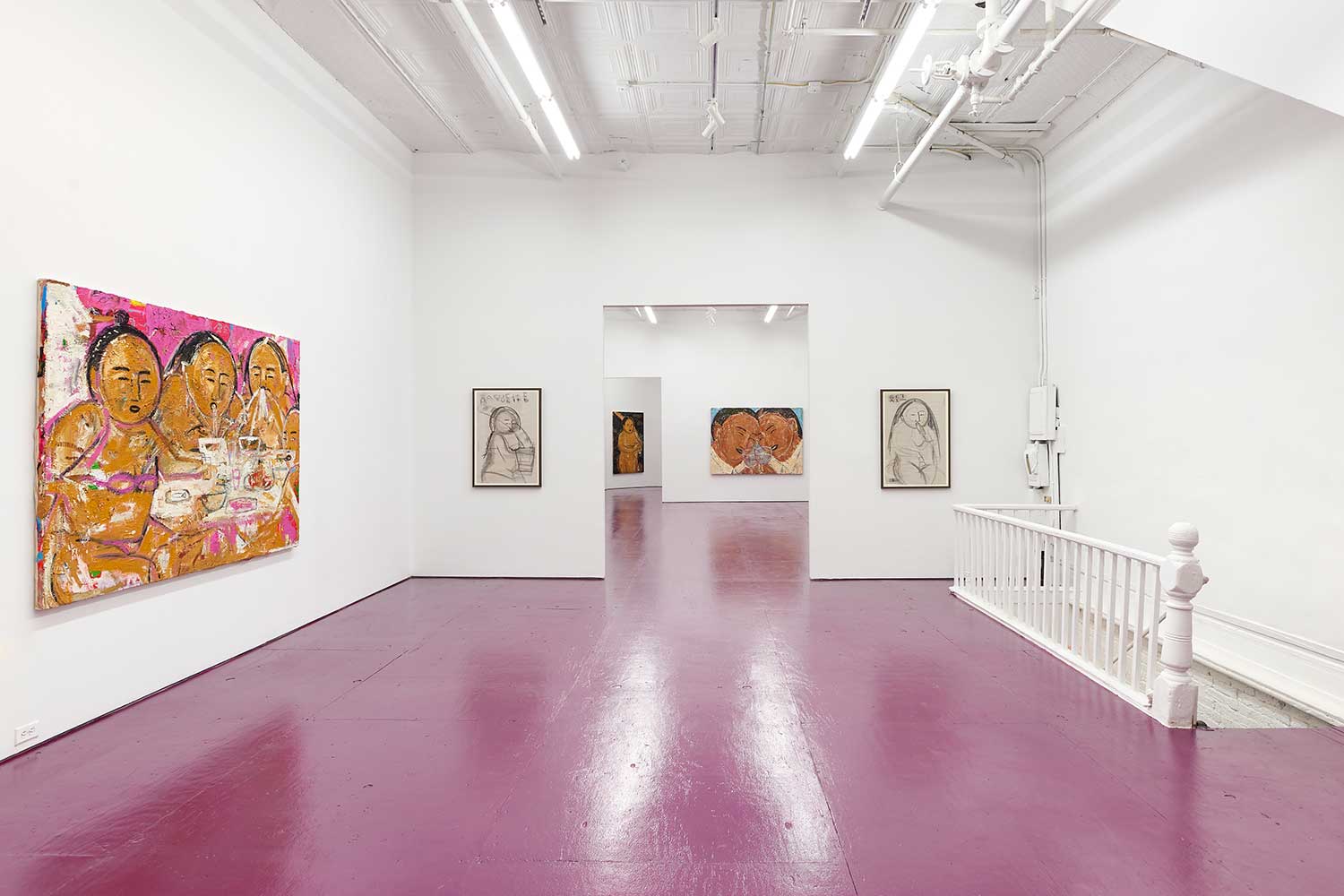The Hole is proud to present the New York solo debut by Monica Kim Garza. In twelve paintings and three works on paper this show is big and bodacious, large enough to satisfy everyone’s curiosity about this amazing artist they might have only heard about. In Baguettes, Monica’s signature nonchalant characters return in new oil paintings on canvas and works on paper, gathering to feast, drink, smoke and celebrate. Each figure is rendered in broad, bold strokes, often highlighted with collage materials such as wool, yarn and glitter.